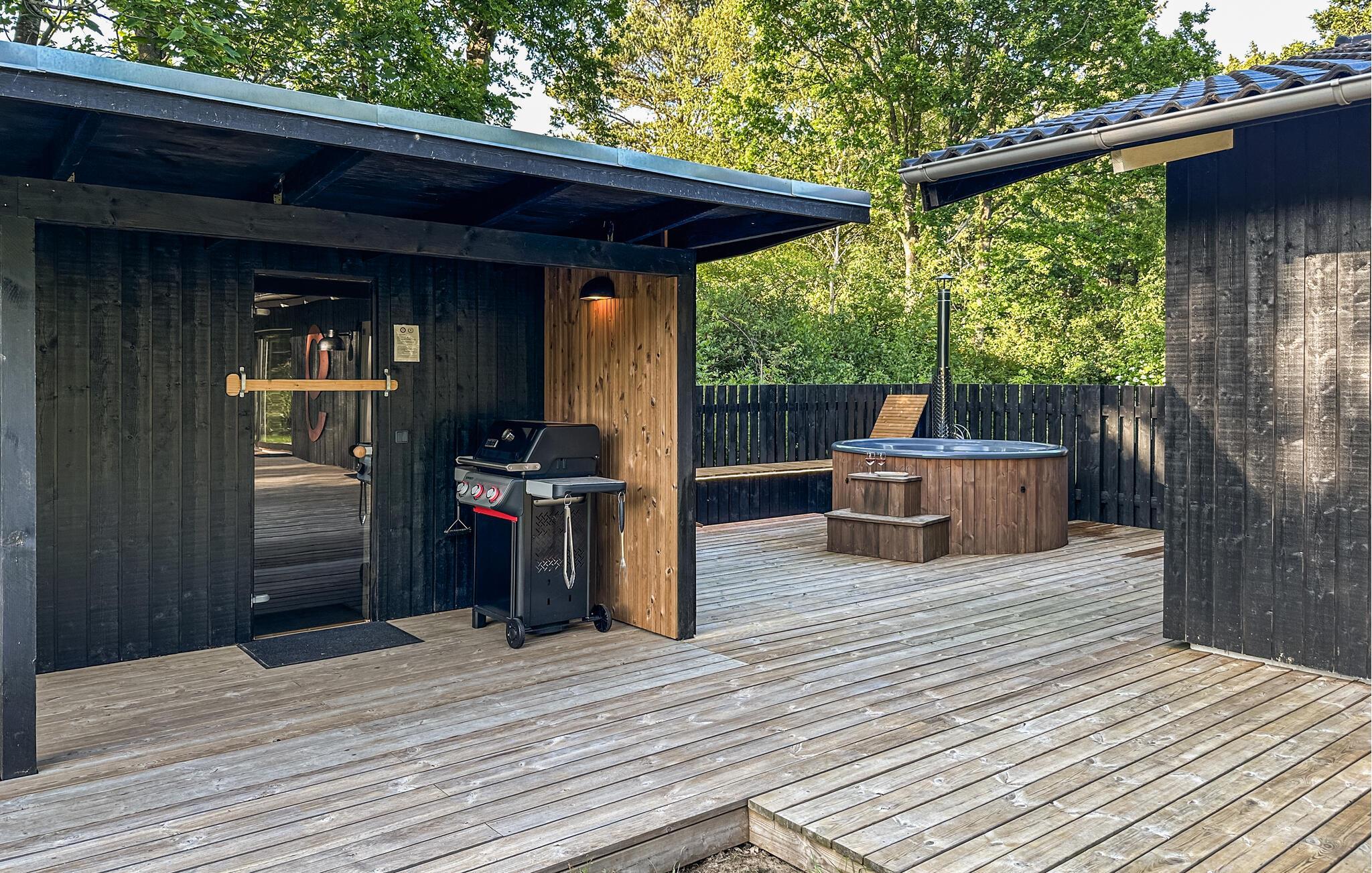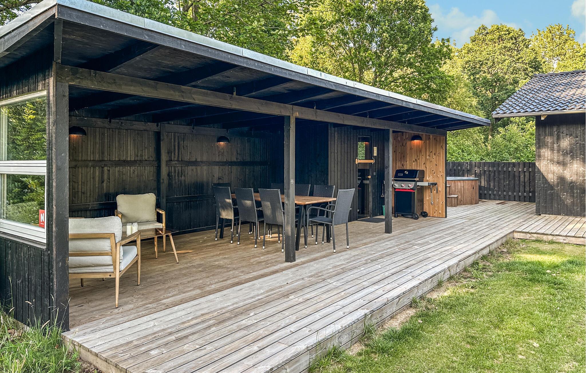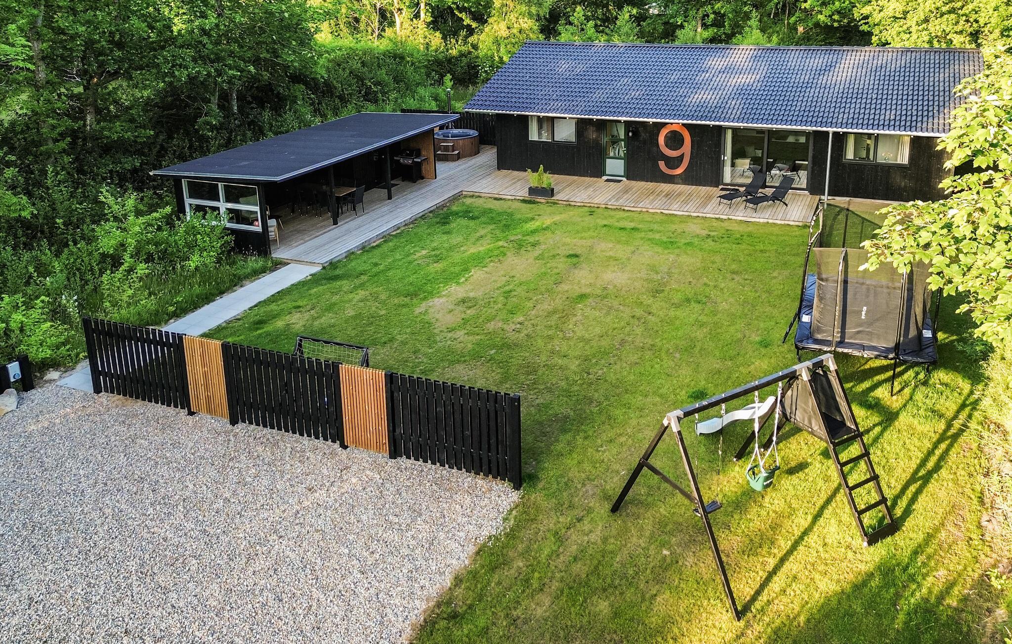 Udeområdet er tilsvarende lækkert. Her kan I sætte jer godt til rette på den store, overdækkede terrasse med en god bog eller et godt krydsord, mens børnene løber rundt og leger på den store grund. Skal I gøre det ekstra godt for jer selv, kan I nyde lidt god wellness i saunaen eller i vildmarksbadet under den stjerneklare himmel.
