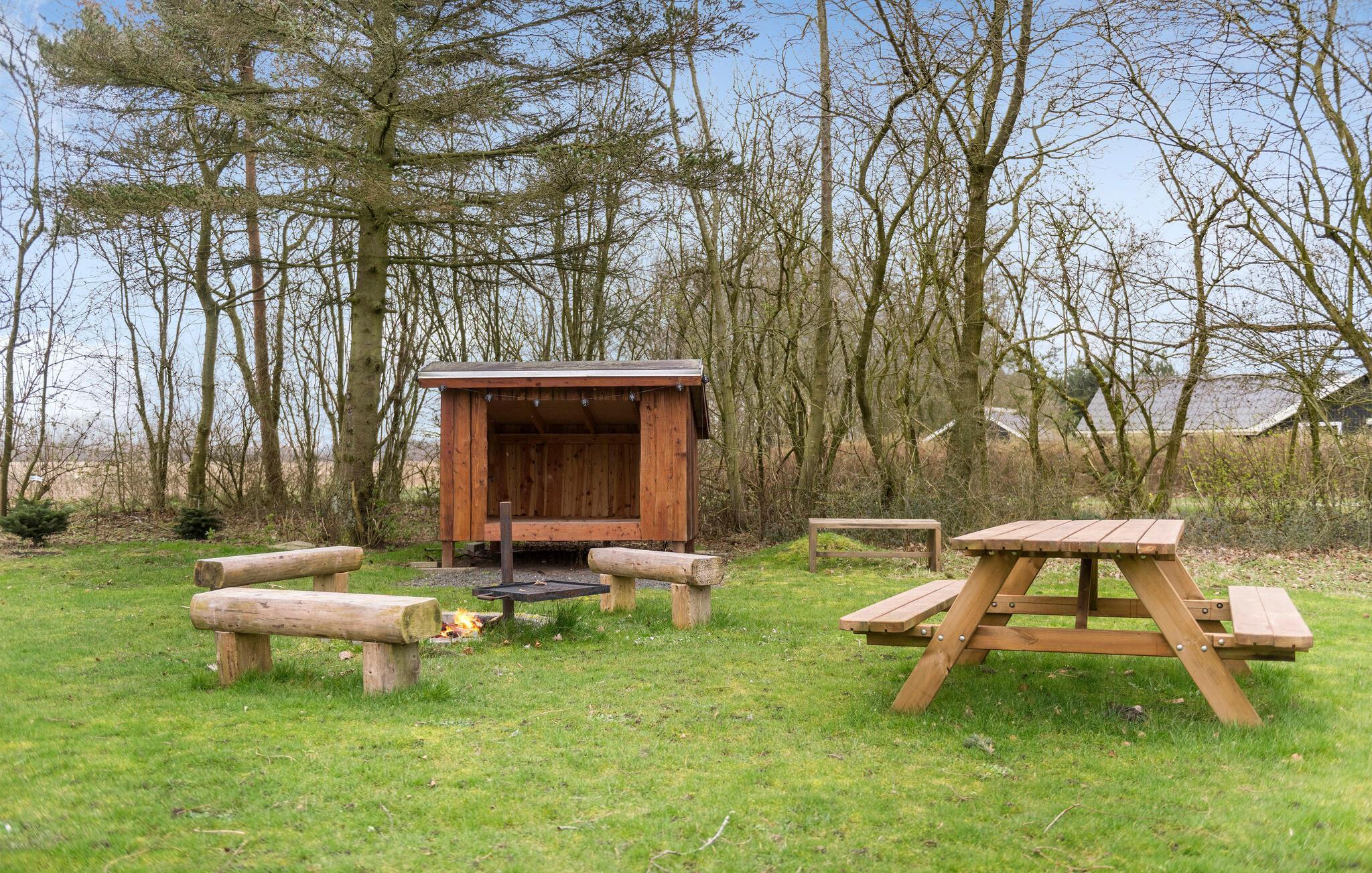 Udeområdet er tilsvarende dejligt. Til huset hører nemlig flere terrasser, hvor I kan finde sol, skygge og læ efter behov og nyde en god kop kaffe, en god bog eller sysle med strikketøjet. For børnene er der masser af plads at boltre sig på i haven, og om aftenen kan I stege skumfiduser og bage snobrød ved bålpladsen, inden I lægger jer til rette i soveposerne i shelteret.