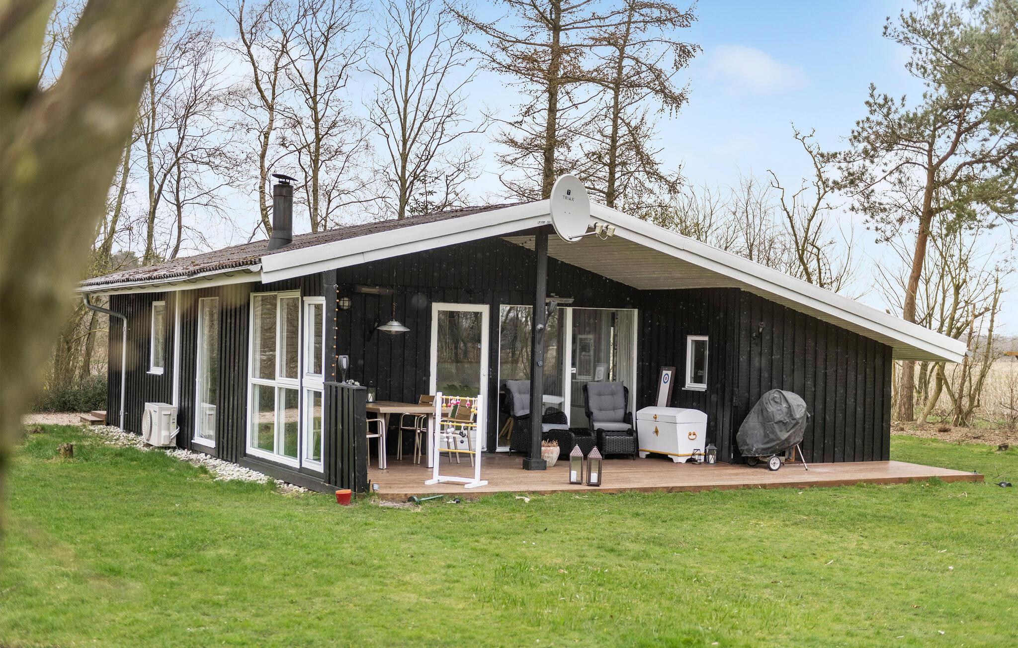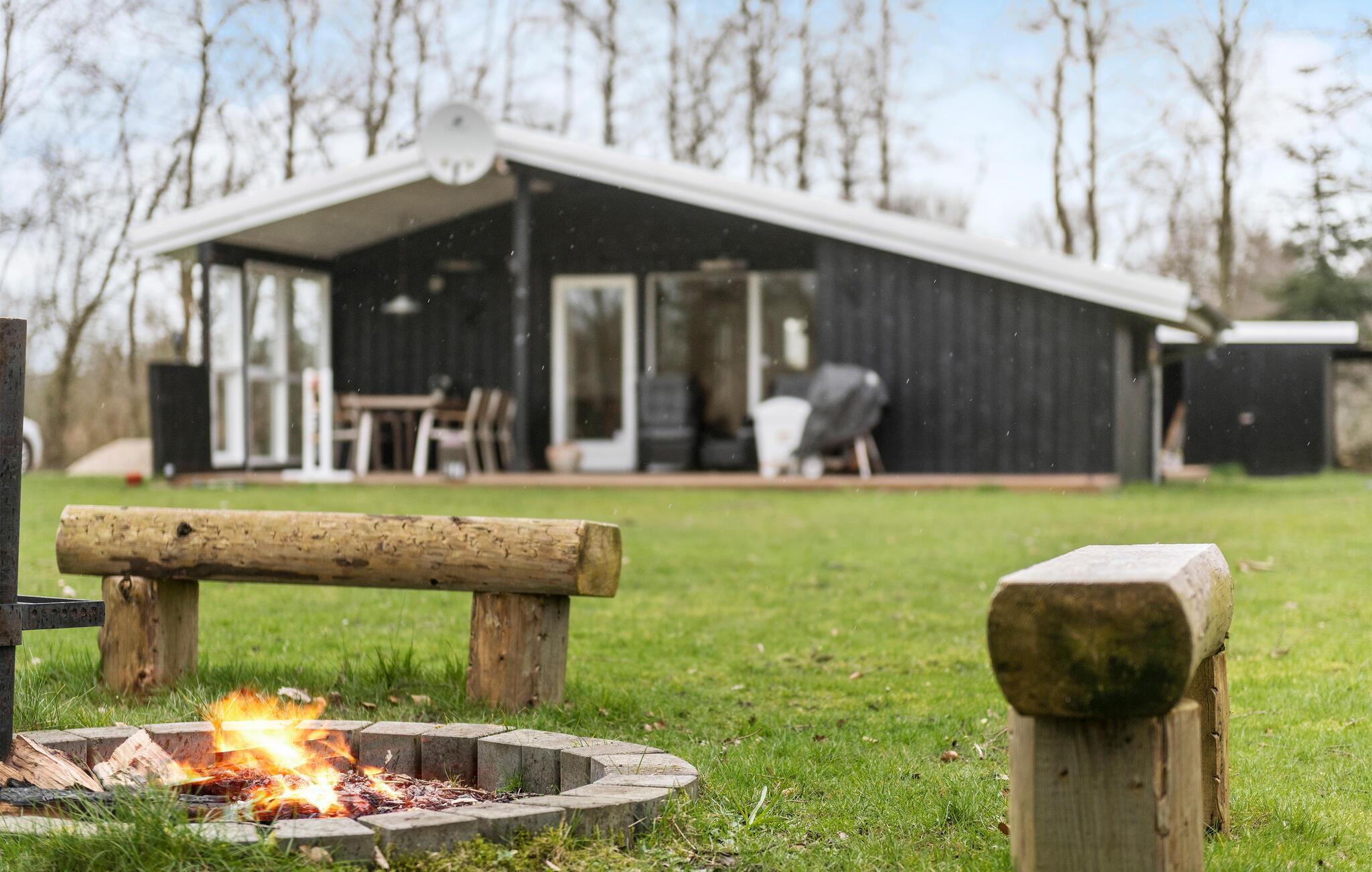 Charmerende træhus nær Jegum Ferieland med terrasse, brændeovn og bålplads i naturskønne omgivelser.