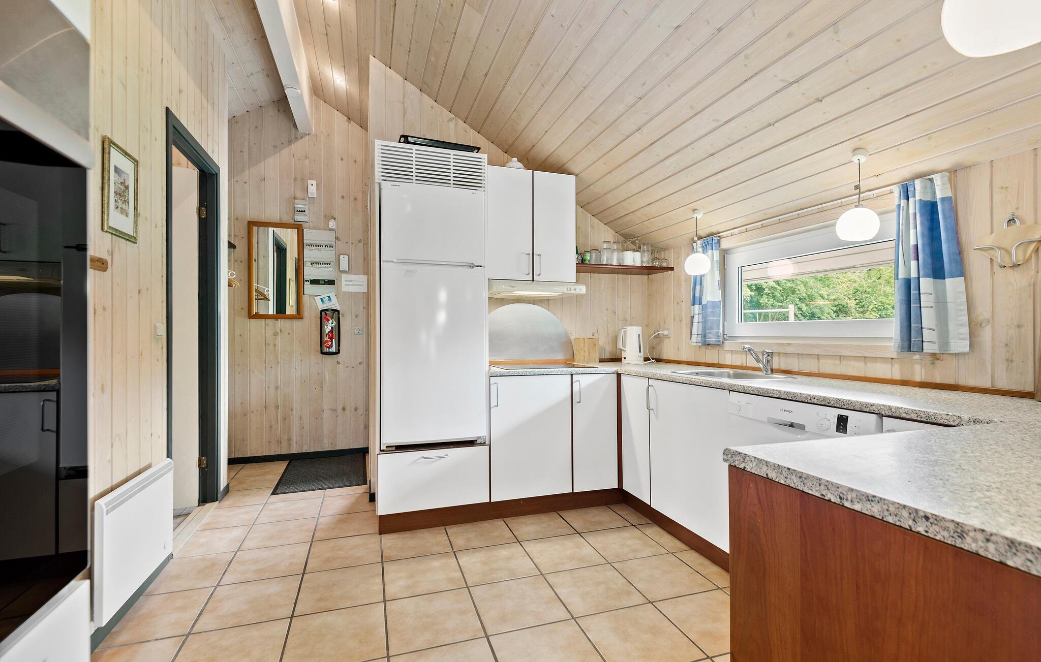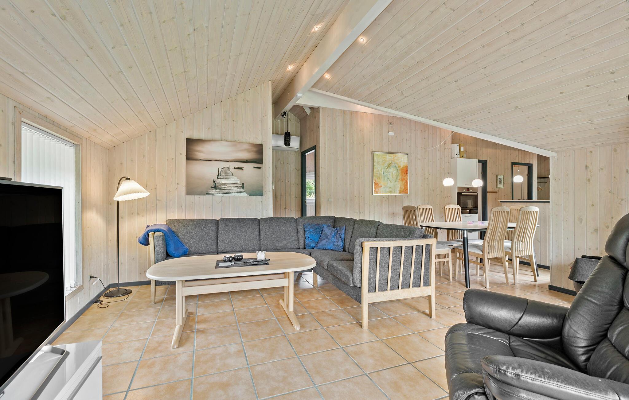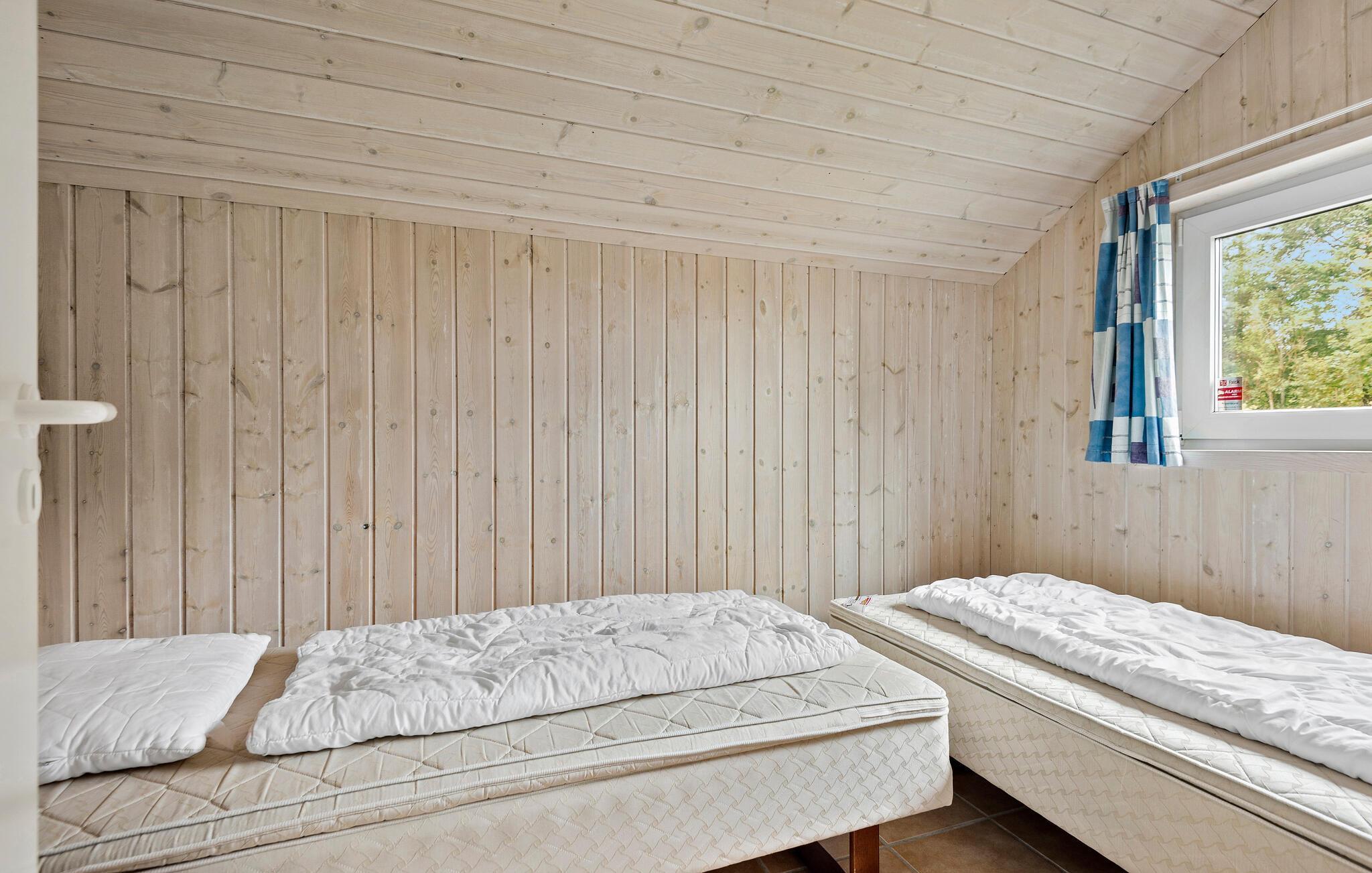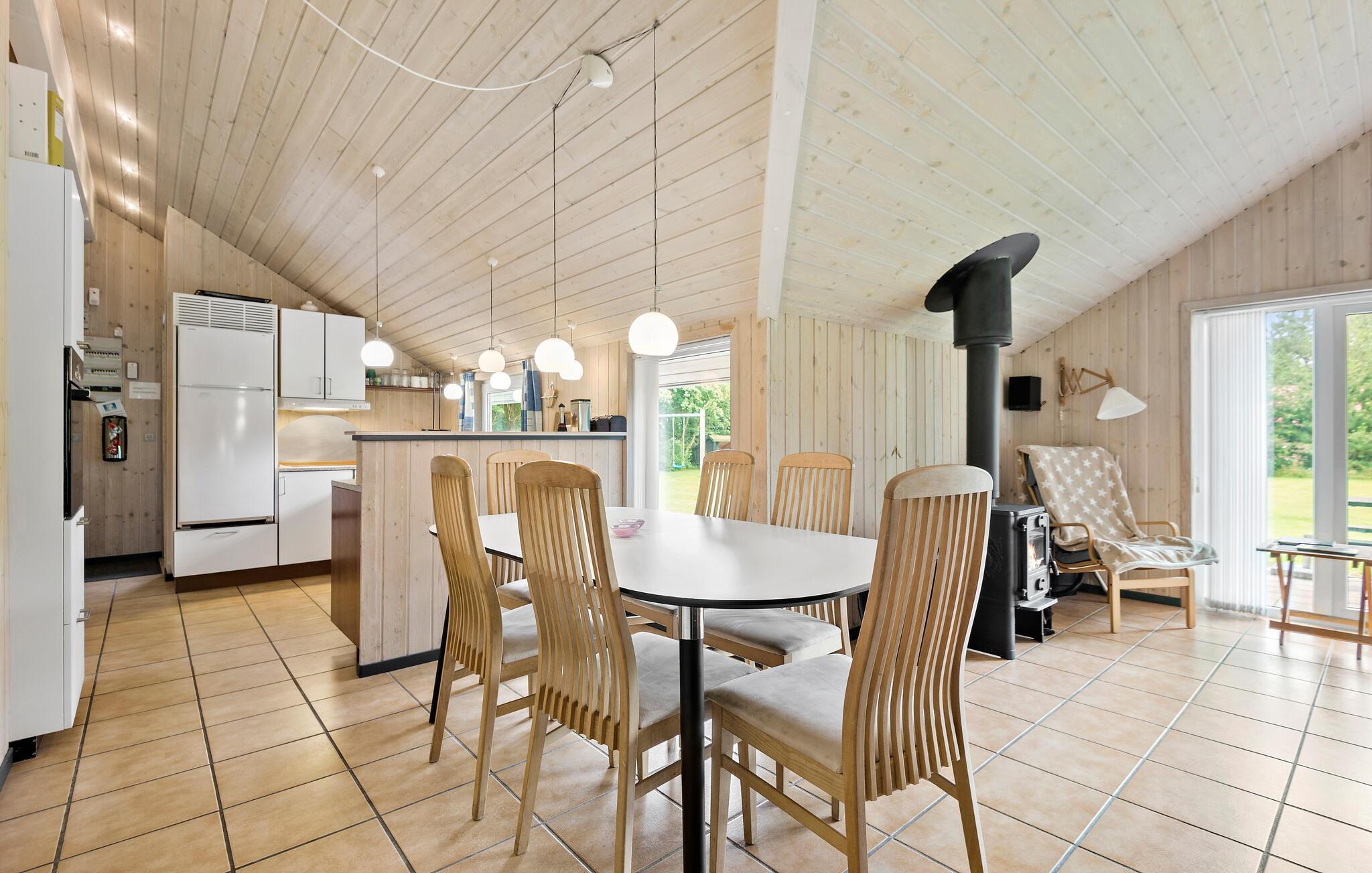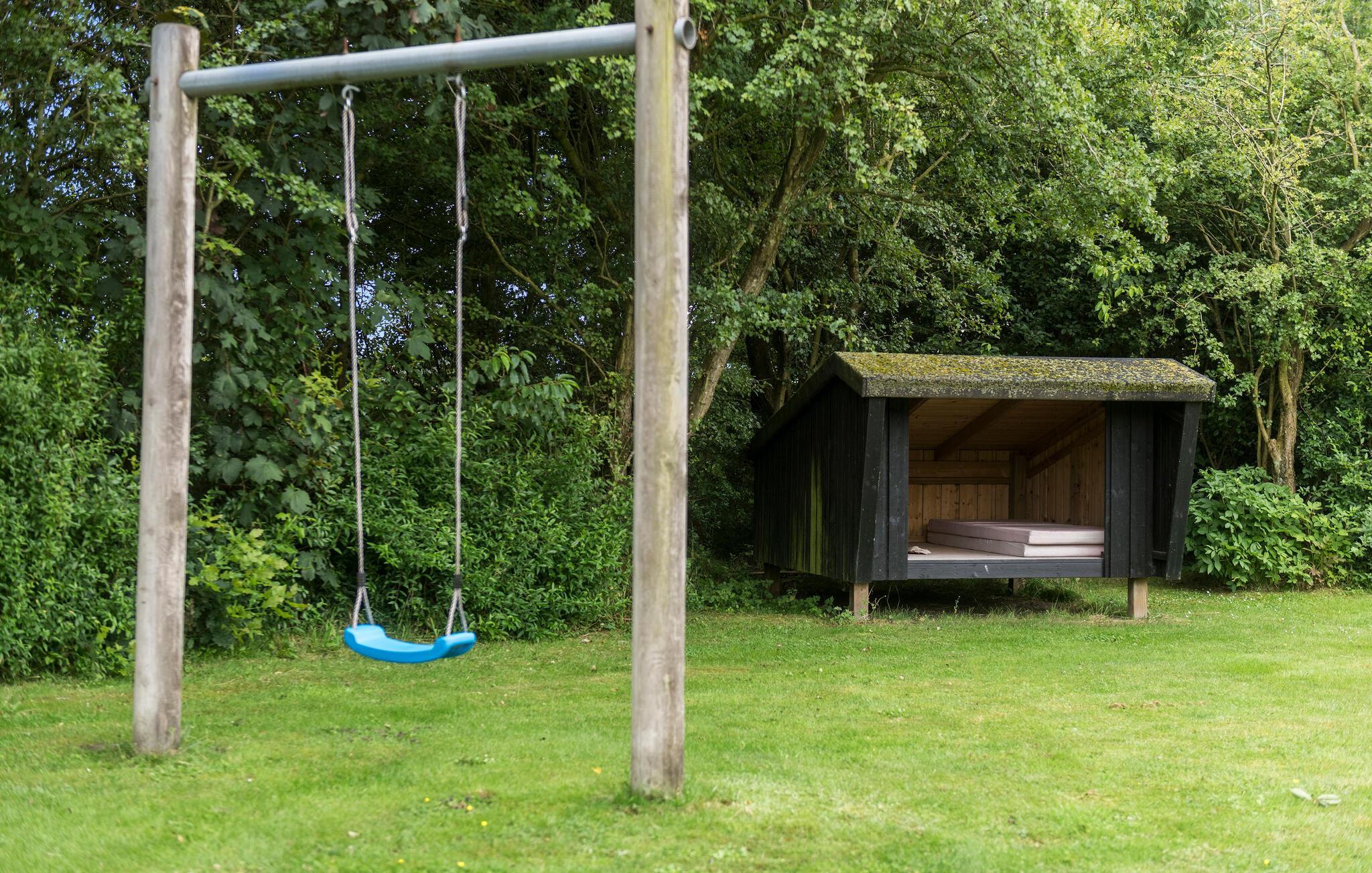 Hyggeligt træhus i Jegum Ferieland med stor have, brændeovn og plads til hele familien.