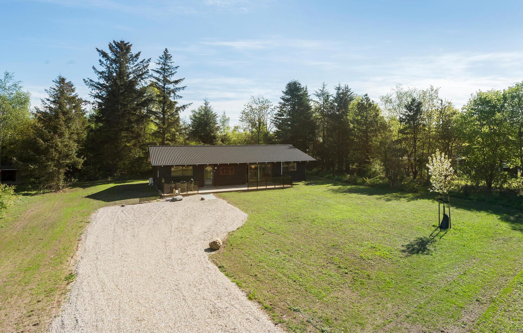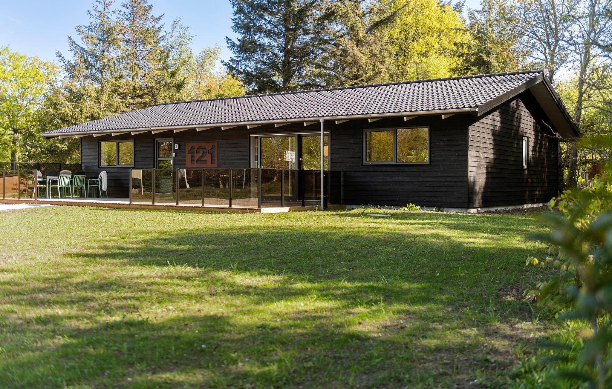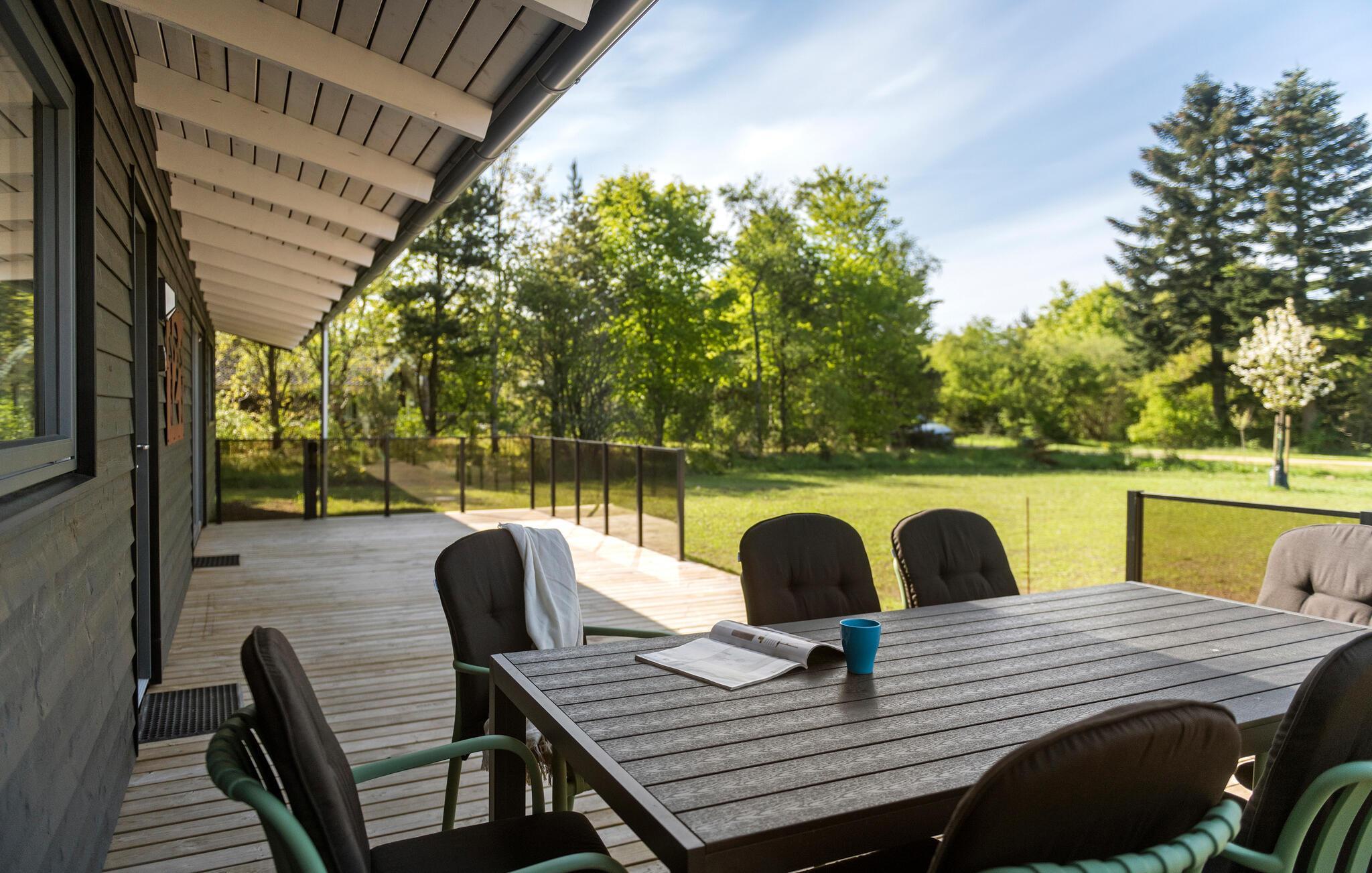 Oplev fred og komfort i dette moderne feriehus med stor terrasse og aktivitetsrum i naturskønne omgivelser.