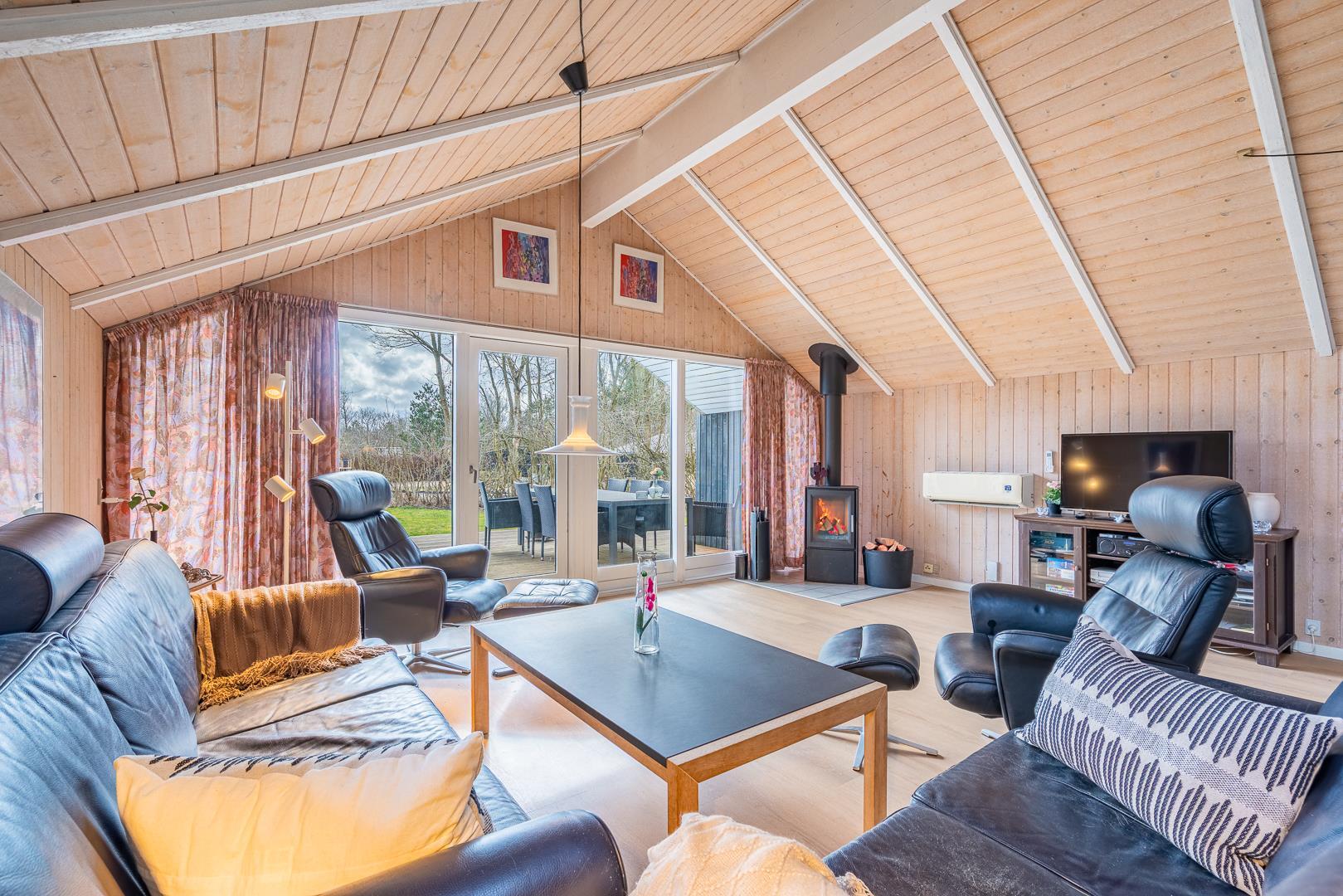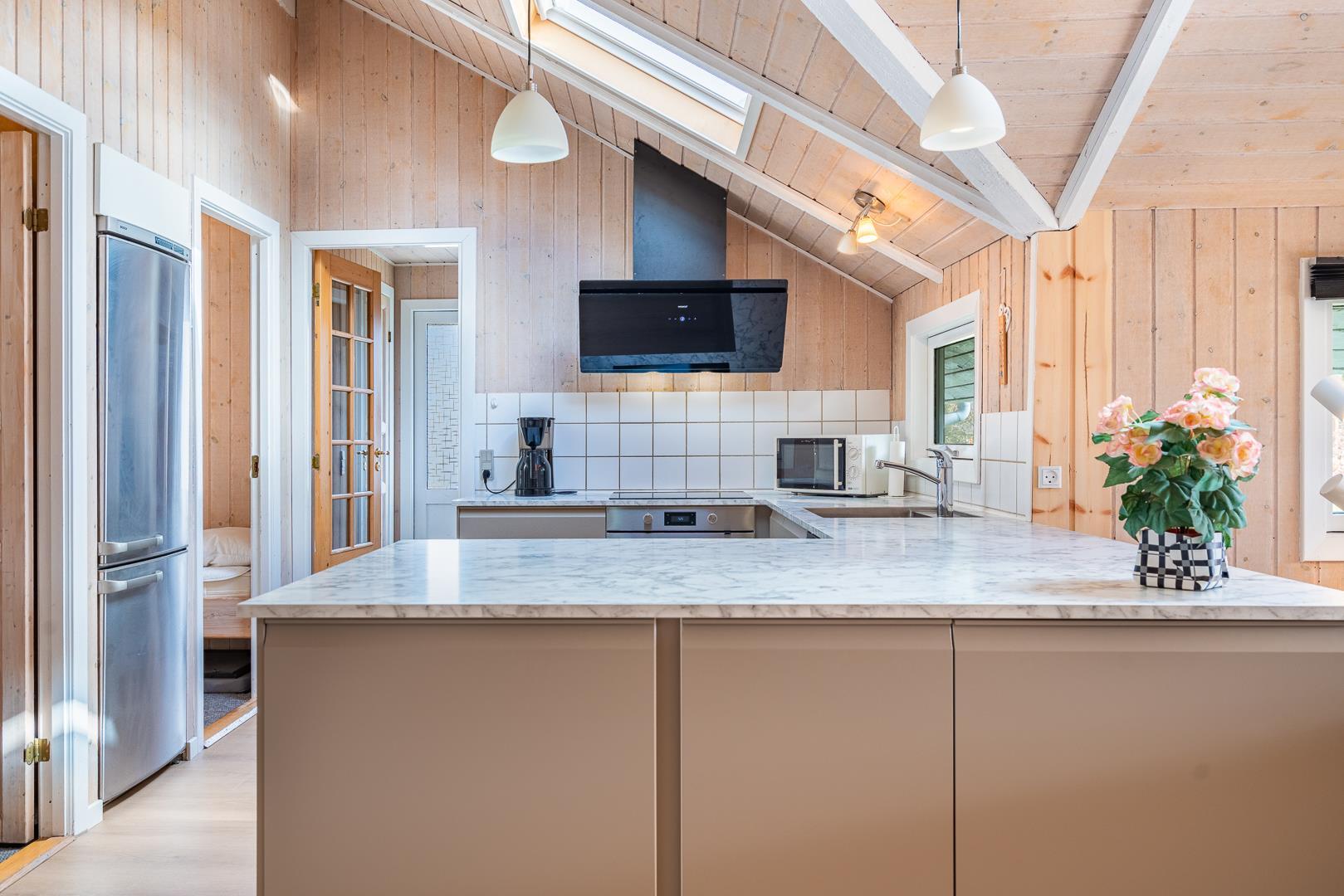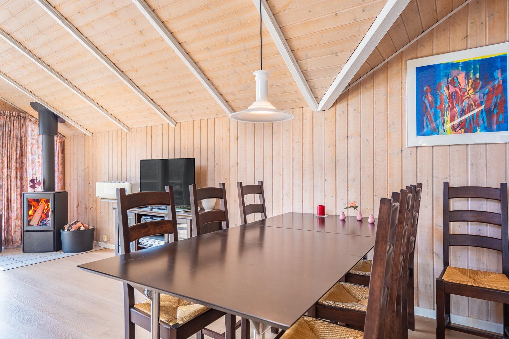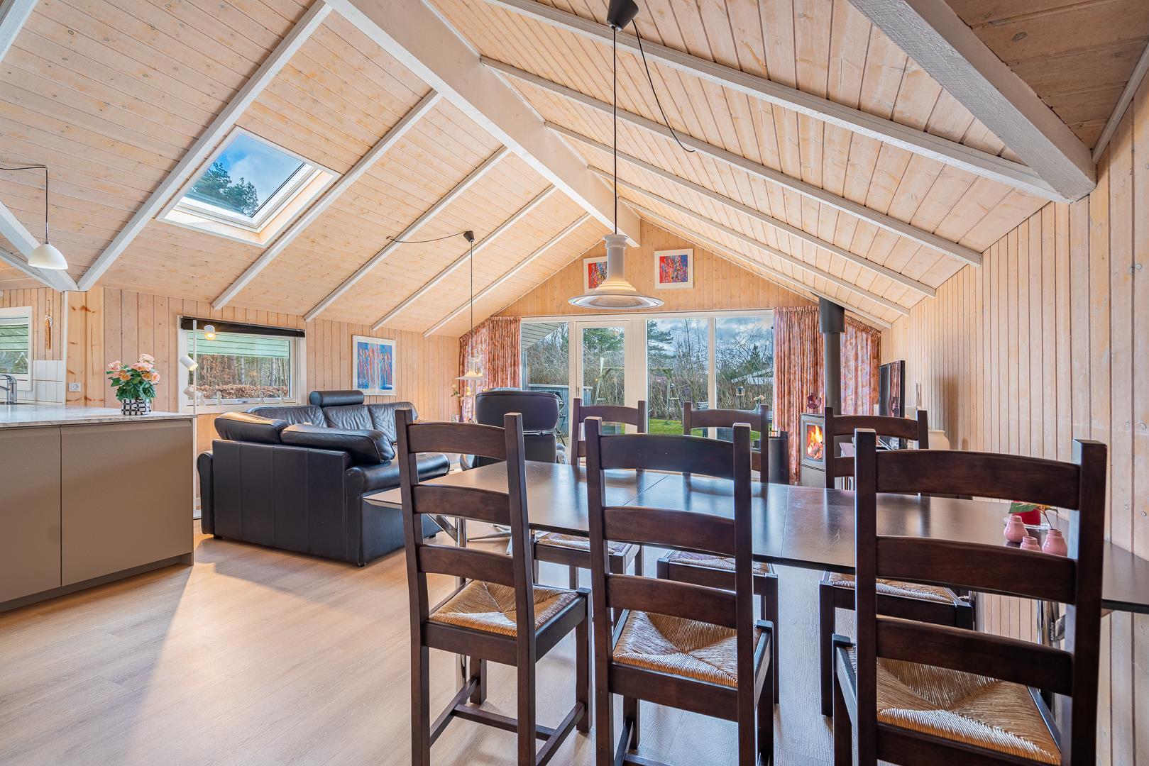 I sommerhusets lyse opholdsstue sørger brændeovnen for ekstra hygge på kølige dage, mens varmepumpen sikrer et behageligt indeklima året rundt. Det åbne køkken er fuldt udstyret og har opvaskemaskine, så I hurtigt er klar til næste måltid omkring det store spisebord.