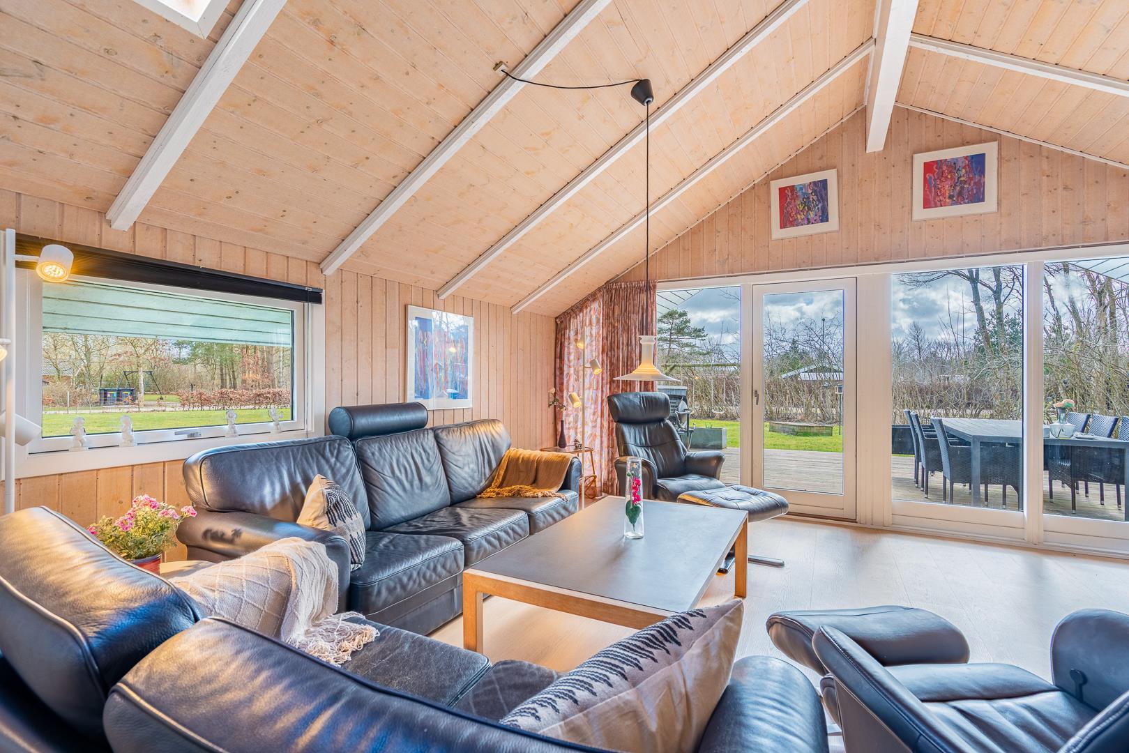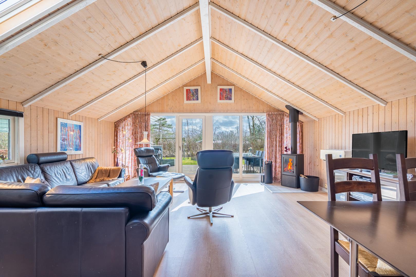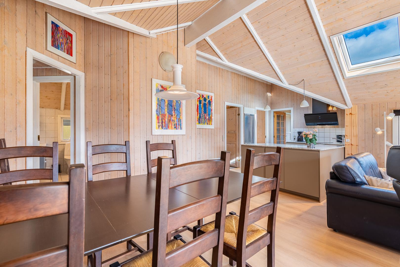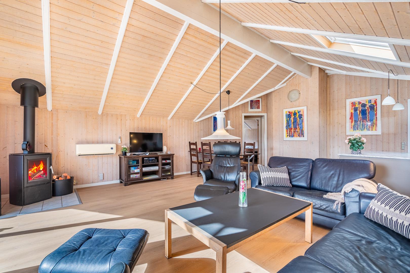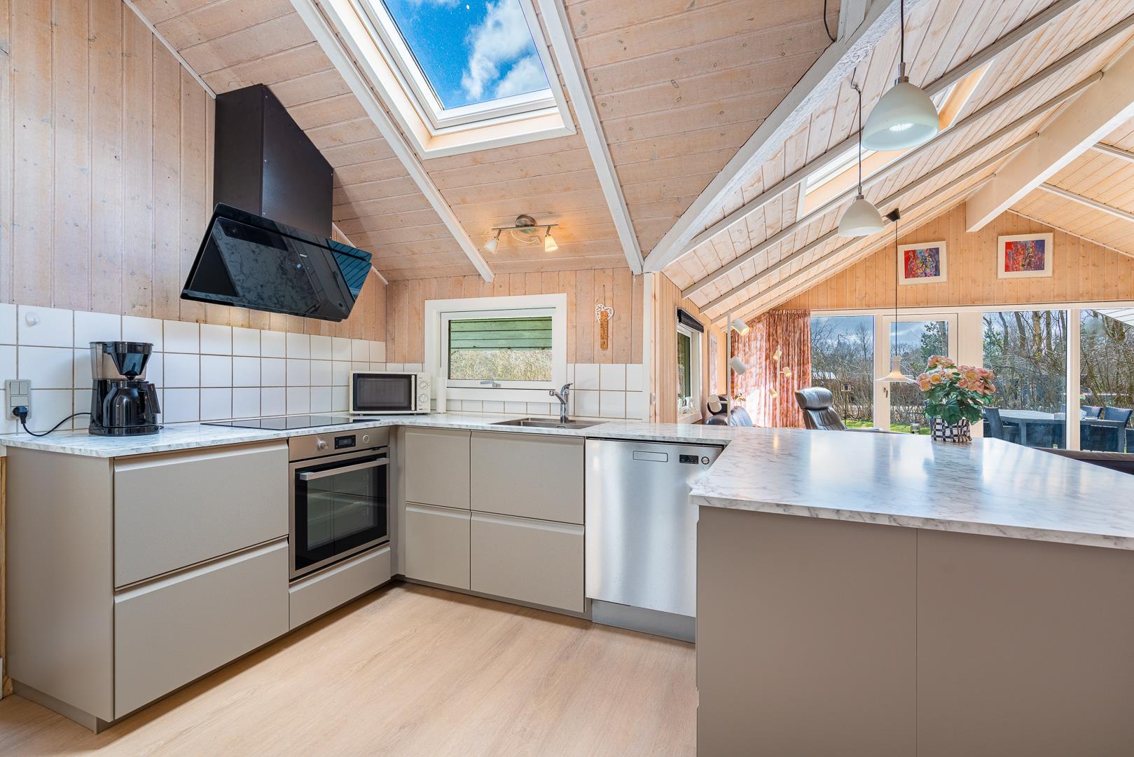 I sommerhusets lyse opholdsstue sørger brændeovnen for ekstra hygge på kølige dage, mens varmepumpen sikrer et behageligt indeklima året rundt. Det åbne køkken er fuldt udstyret og har opvaskemaskine, så I hurtigt er klar til næste måltid omkring det store spisebord.