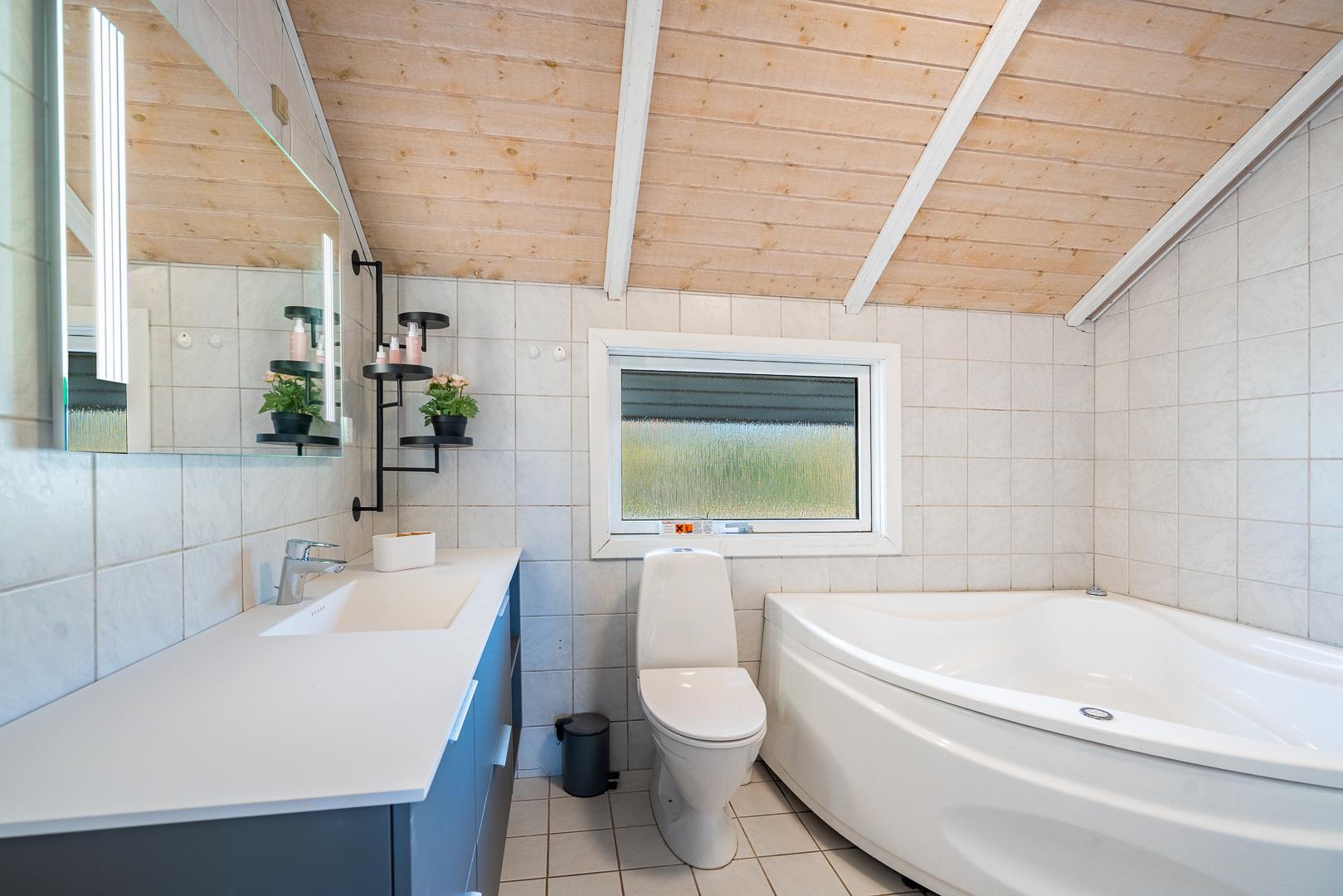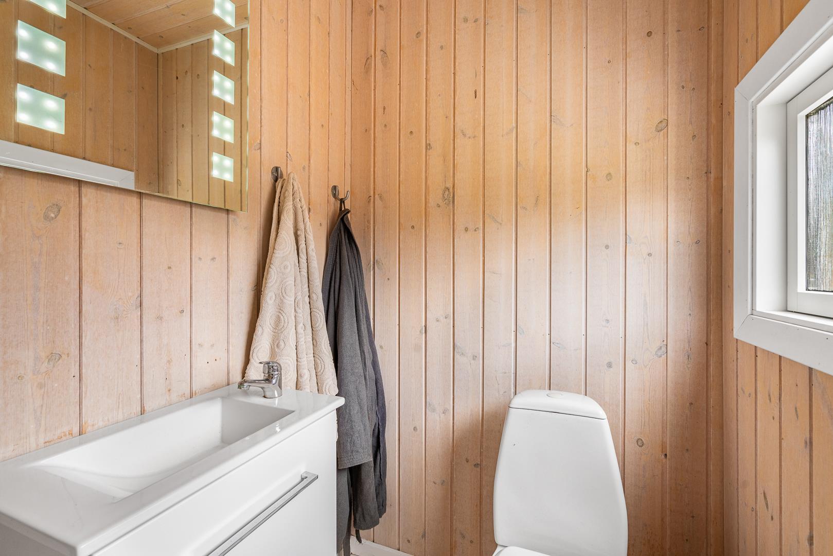 Et særligt højdepunkt er wellnessafdelingen med sauna og spa – det perfekte sted at koble af efter en frisk gåtur ved havet. Badeværelset har desuden gulvvarme for ekstra komfort.