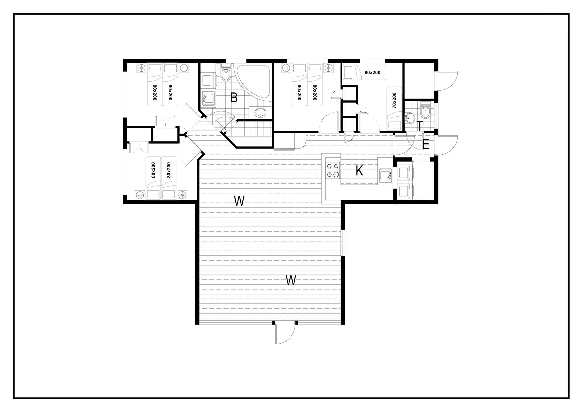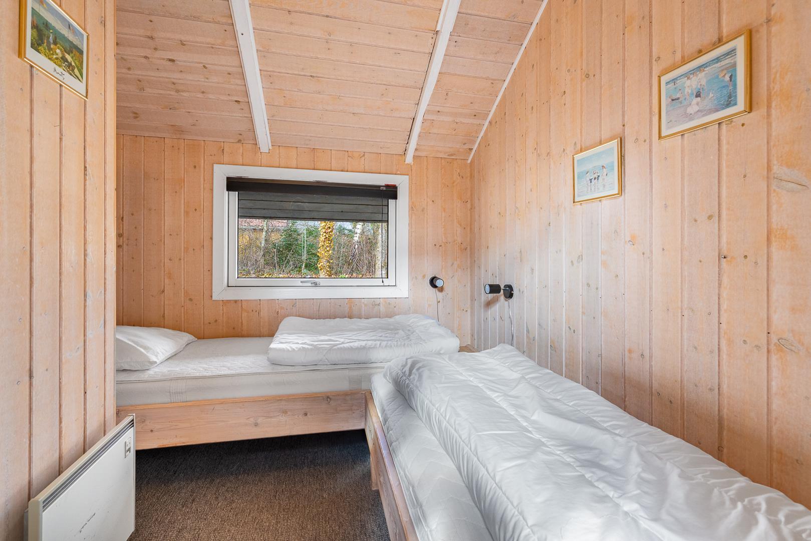 Sengestørrelse: 3 dobbeltsenge med madrasser á 80 x 200 cm, 1 enkeltseng 80 x 200 cm og 1 enkeltseng 70 x 200 cm.
