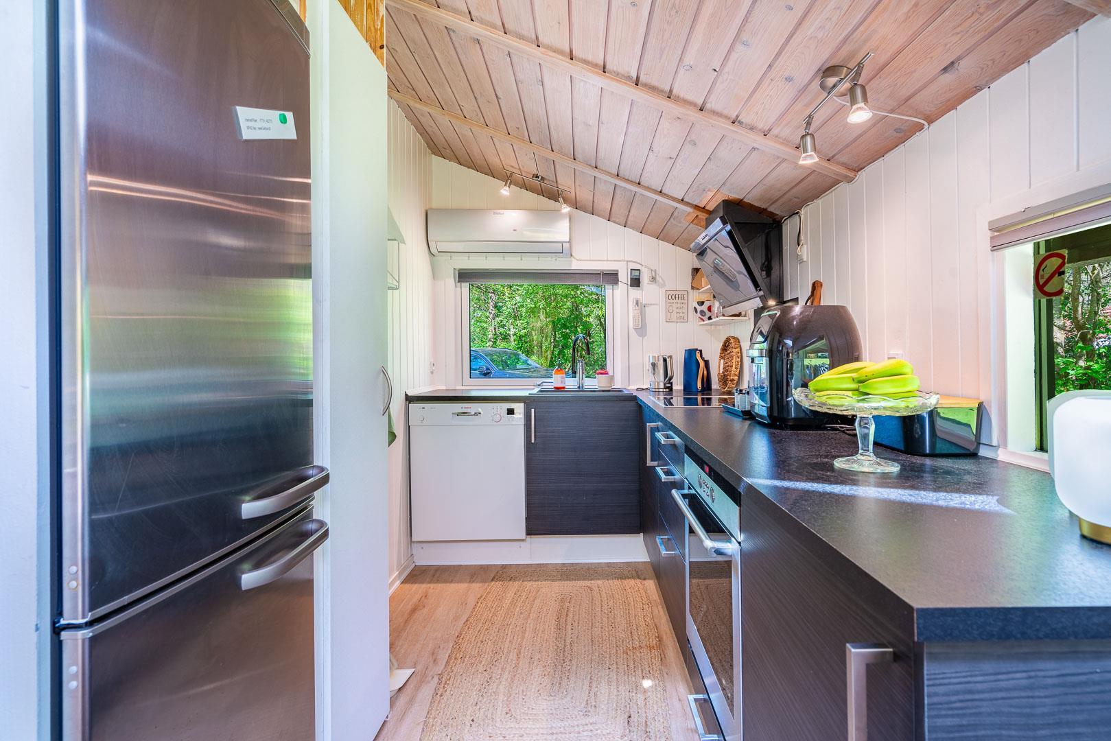 Det åbne køkken ligger i direkte forbindelse med spisepladsen og er fuldt udstyret med alt, hvad I har brug for til madlavningen – inklusive opvaskemaskine, så I får mere tid til afslapning.