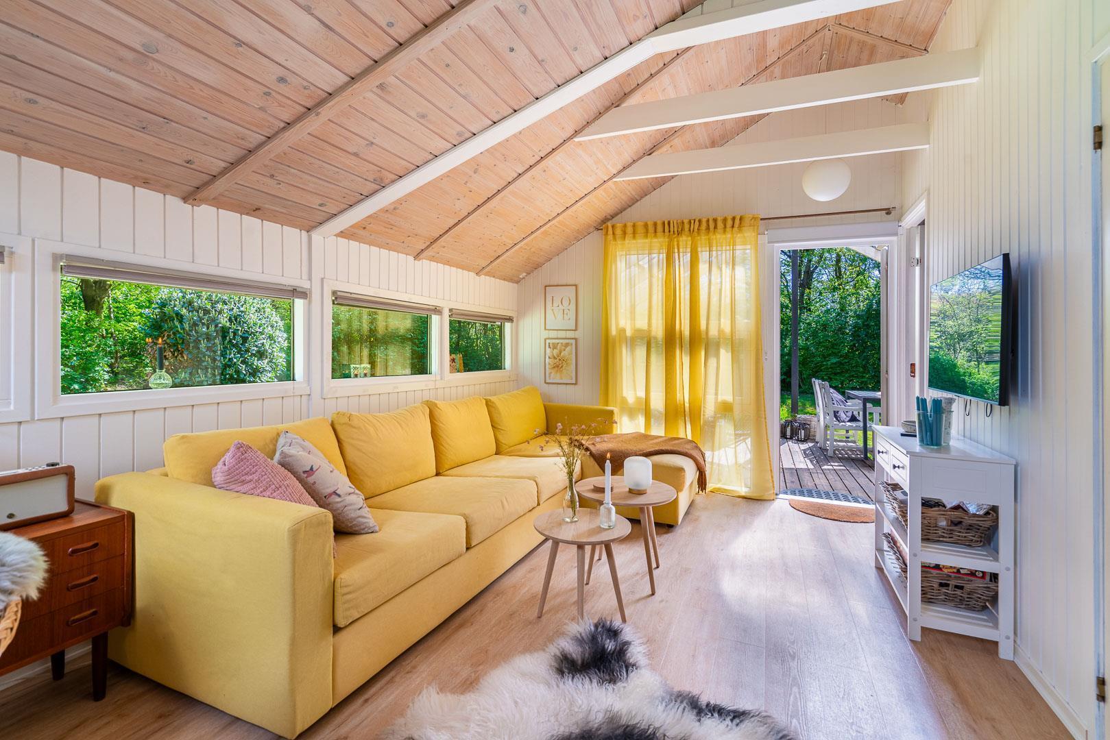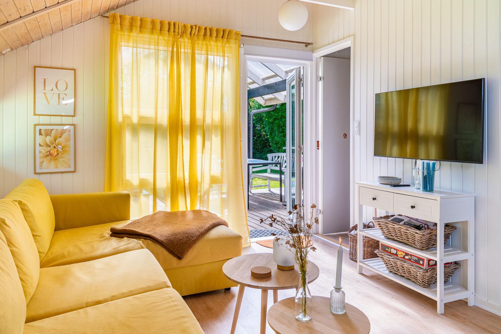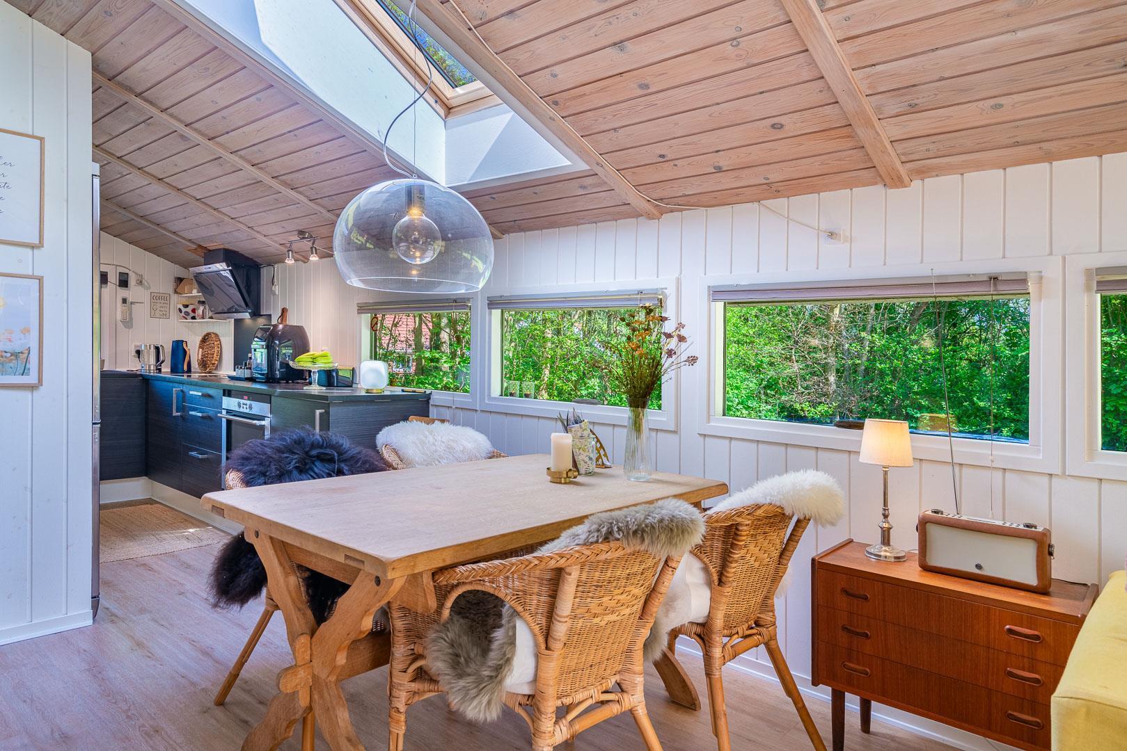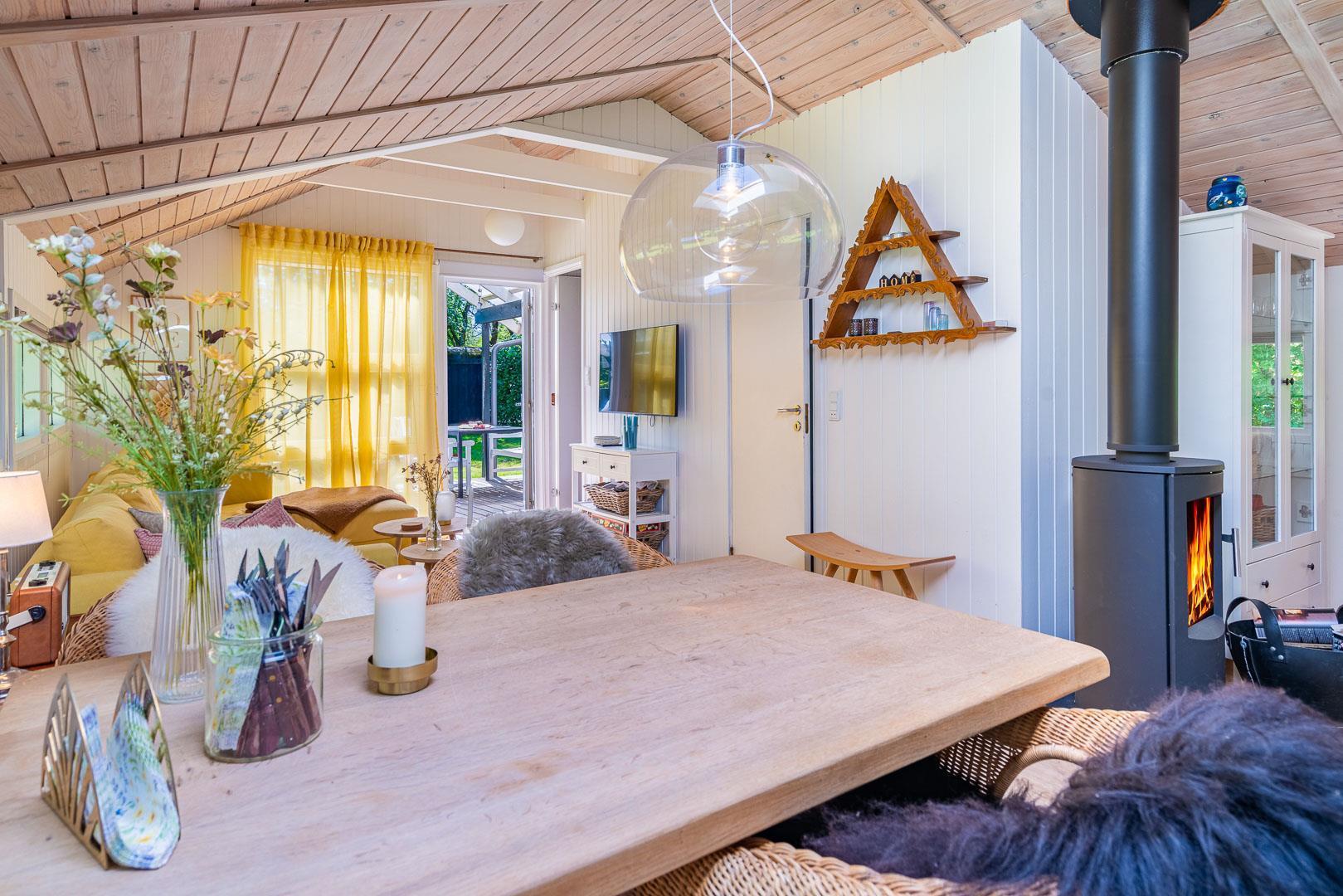 Det lyse og indbydende opholdsrum er sommerhusets naturlige samlingspunkt. Store vinduer giver et dejligt lysindfald, og på kølige dage spreder brændeovnen varme og hyggestemning. Her kan I nyde en god bog, et glas vin foran ilden eller en sjov spilleaften sammen.