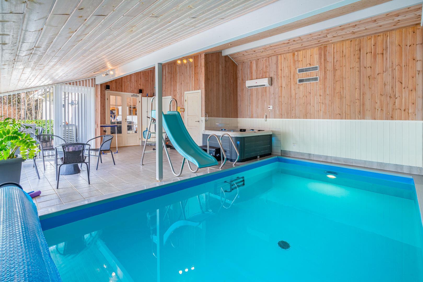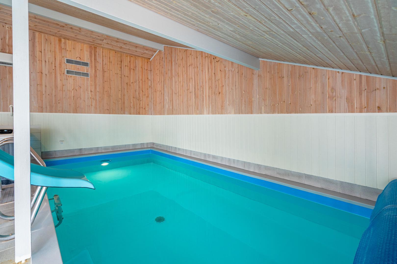 Alt er klar til en ferie fuld af hygge og oplevelser – pool med modstrømsanlæg og rutsjebane, spa, sauna, gulvvarme, Chromecast og meget mere.