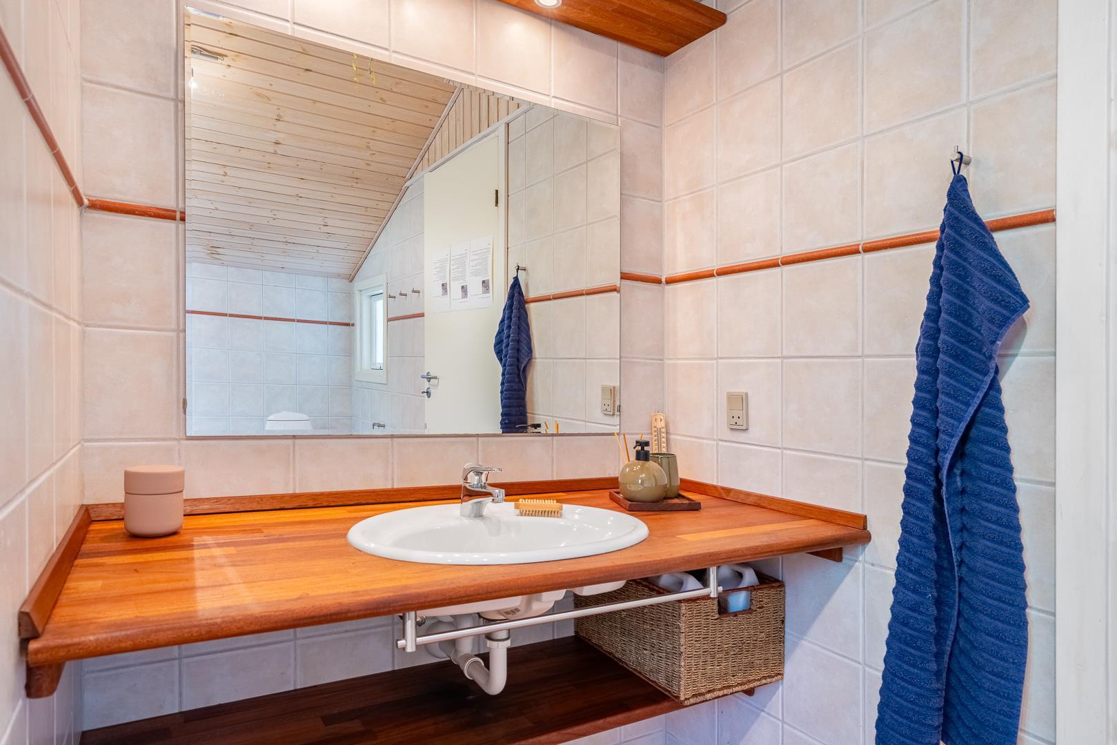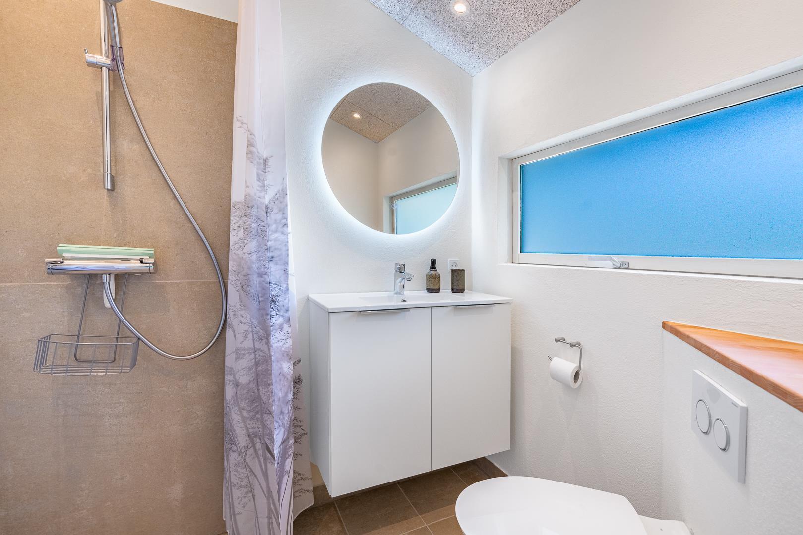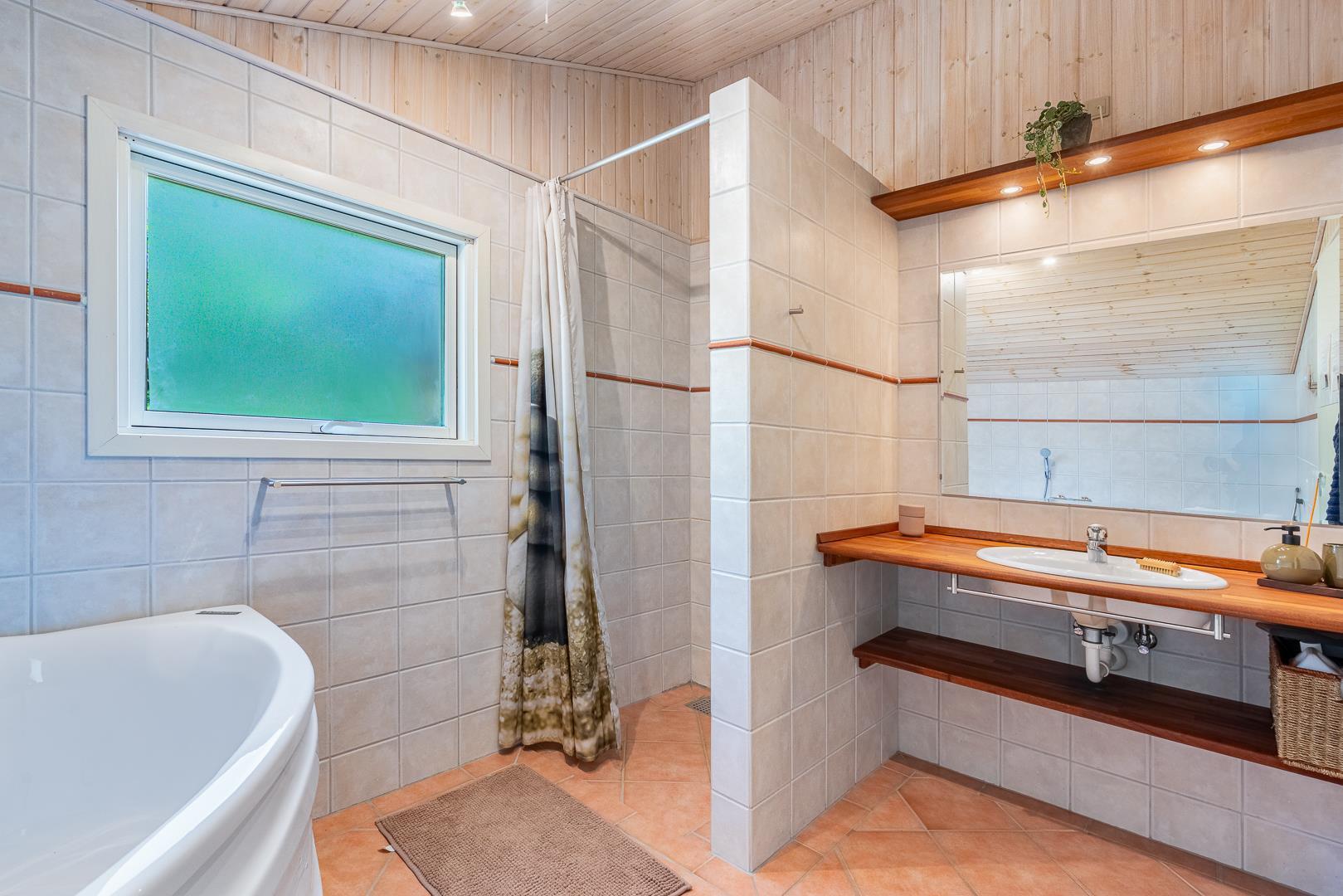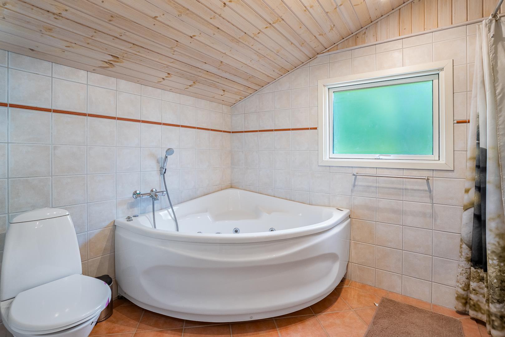 Der er to moderne badeværelser, hvoraf det ene har spabad – perfekt til afslapning efter en aktiv dag. Desuden er der både vaskemaskine og tørretumbler, så sommerhuset er ideelt også til længere ophold.