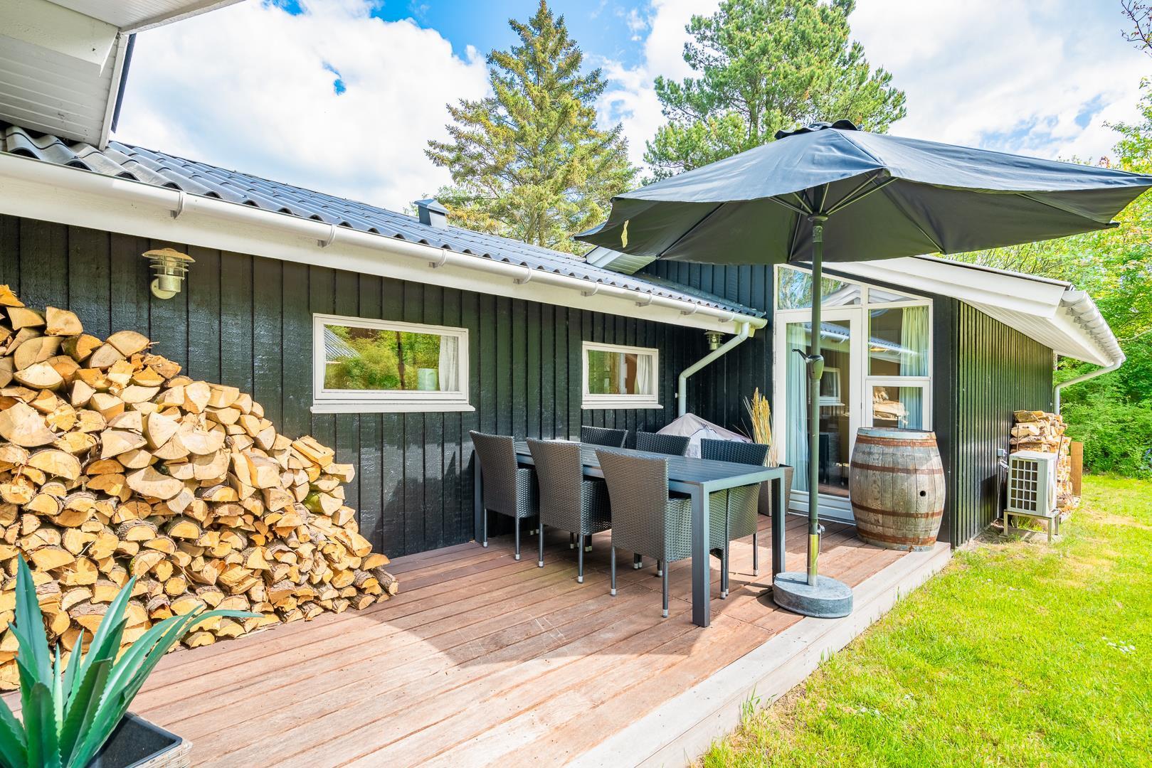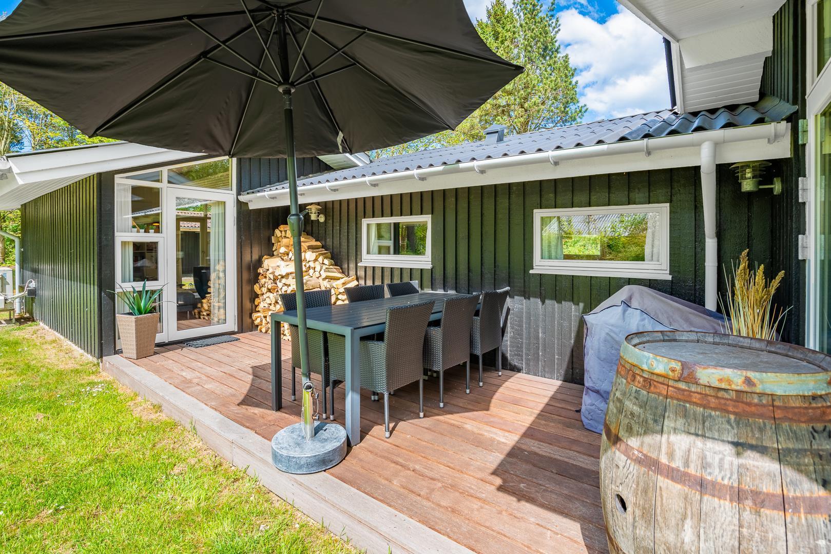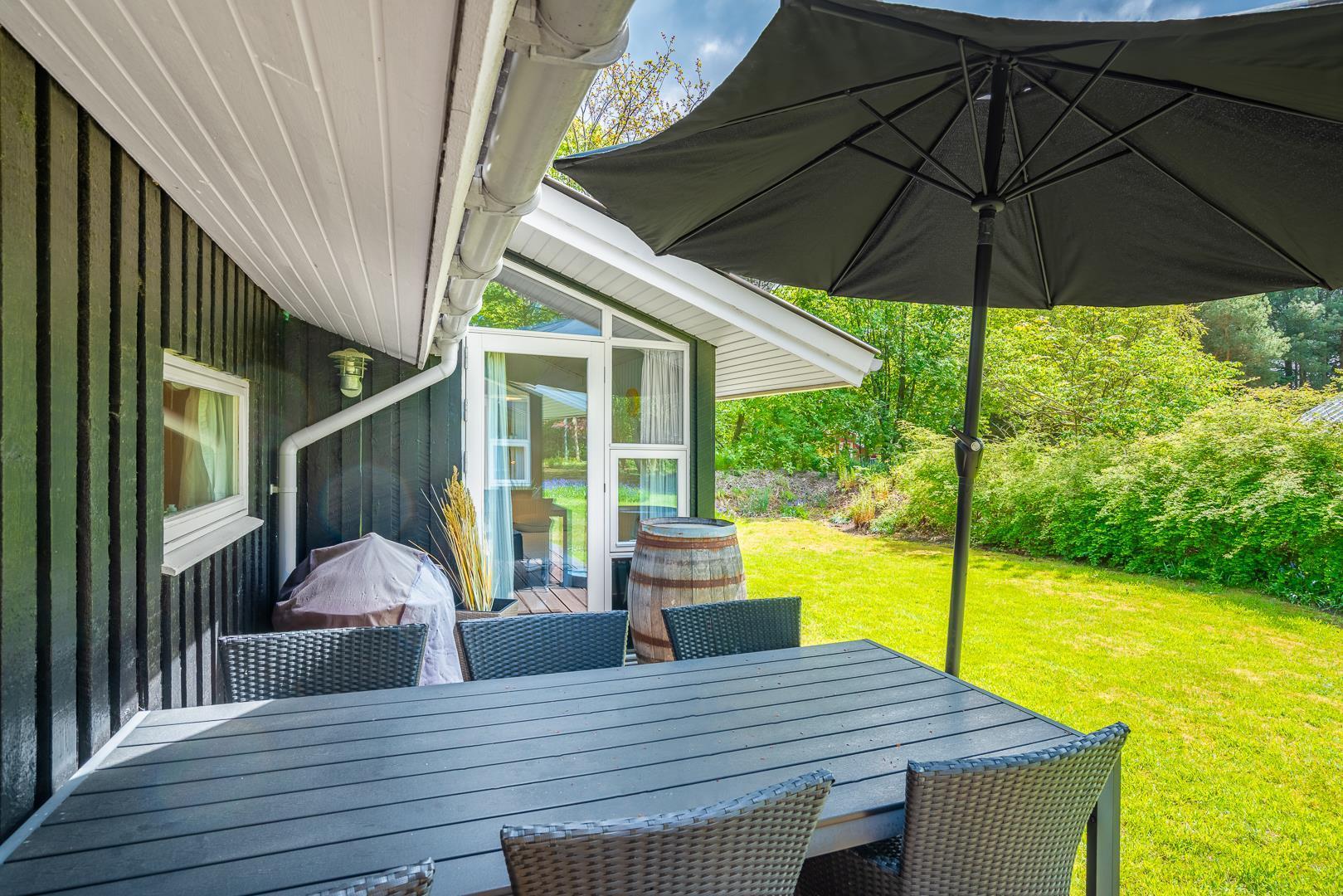 Udenfor venter en stor, delvist overdækket terrasse, hvor I kan nyde solen, grille sammen eller bare læne jer tilbage med en kop kaffe og mærke roen. På den store naturgrund er der god plads til leg, boldspil og afslapning for hele familien.