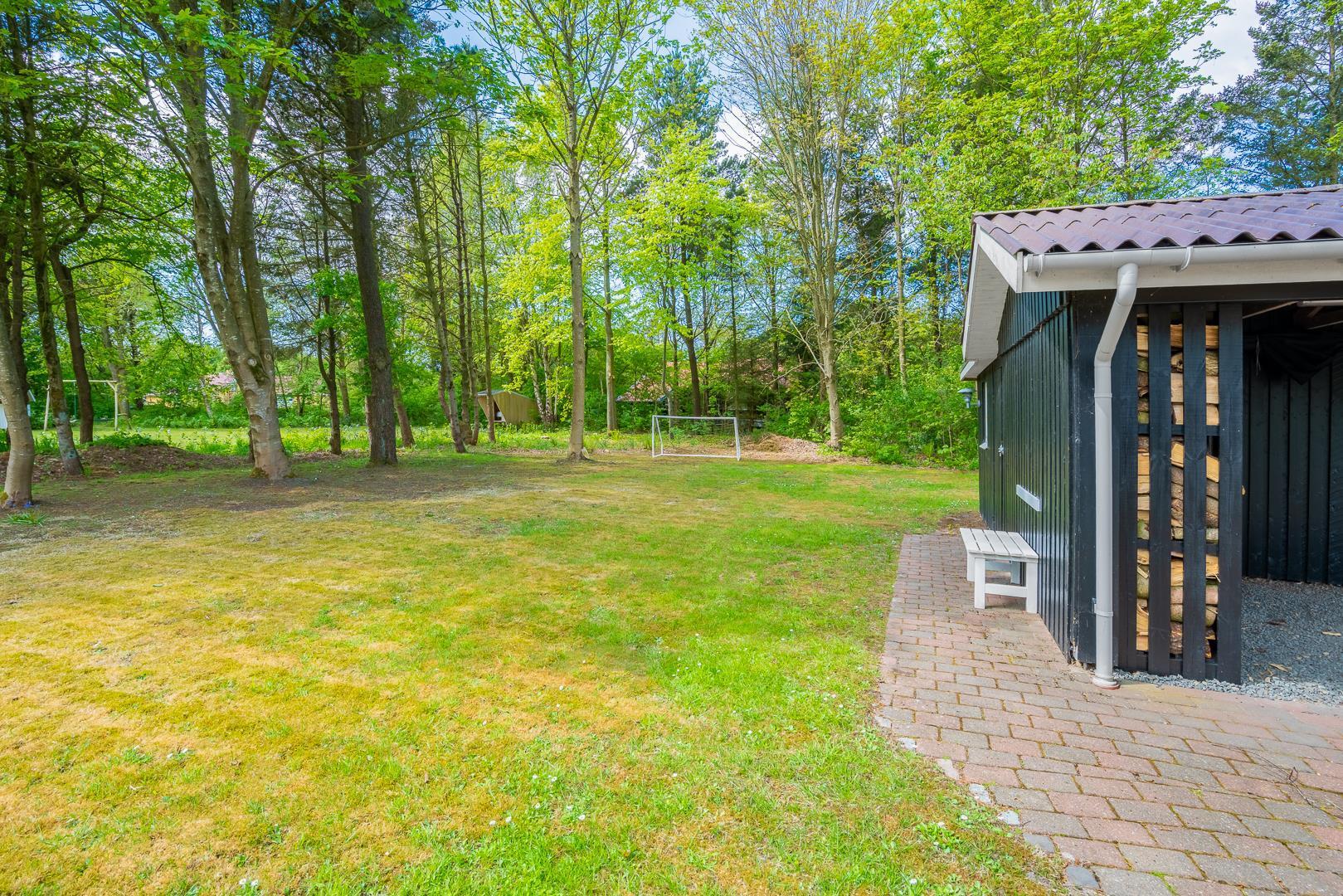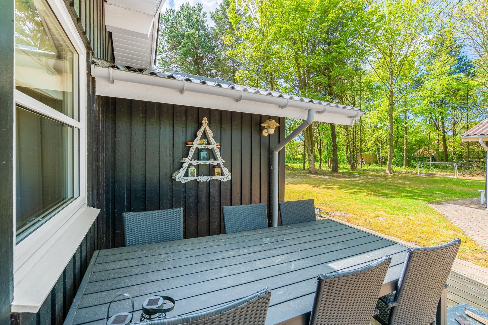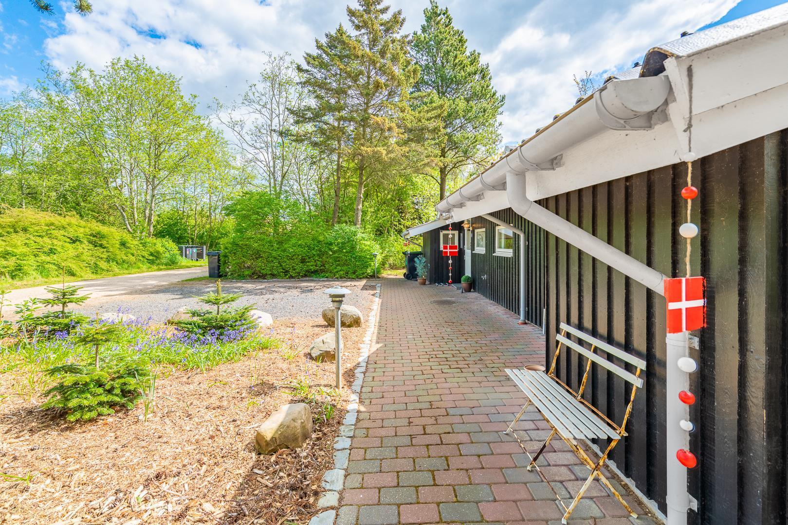 Udenfor venter en stor, delvist overdækket terrasse, hvor I kan nyde solen, grille sammen eller bare læne jer tilbage med en kop kaffe og mærke roen. På den store naturgrund er der god plads til leg, boldspil og afslapning for hele familien.
