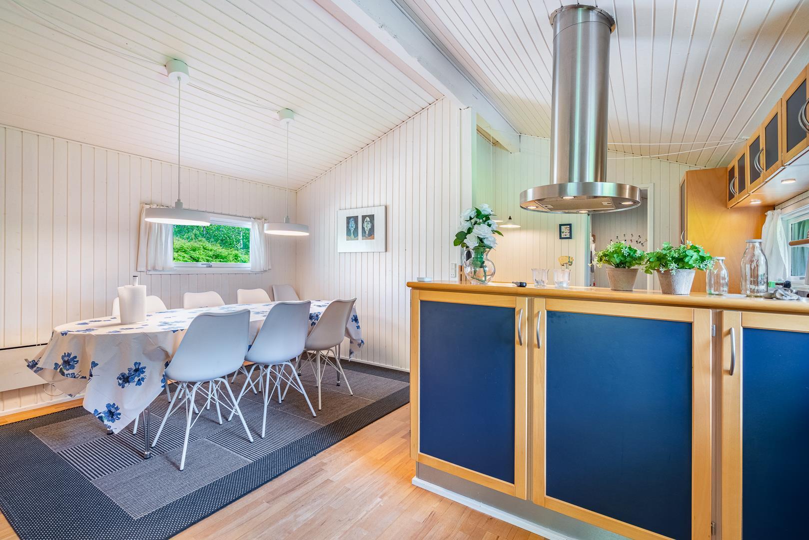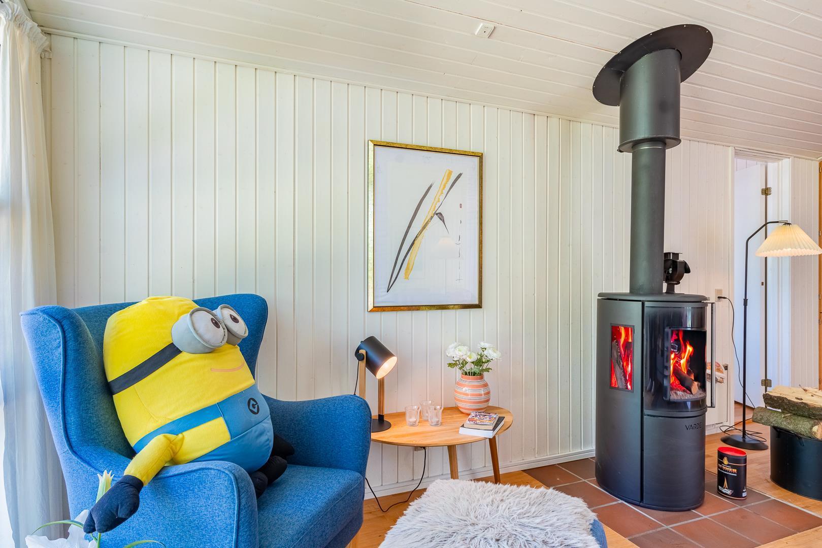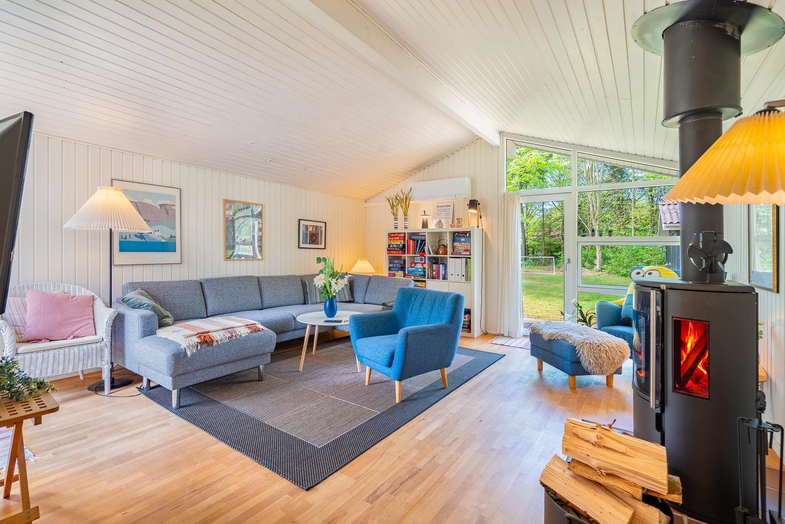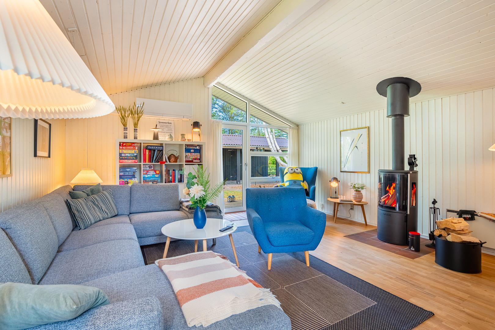 Det store opholdsrum er hjertet i sommerhuset – her kan I nyde hyggelige aftener foran brændeovnen, se film via Chromecast eller bare slappe af i sofaen. Det åbne køkken er stilfuldt og fuldt udstyret med bl.a. opvaskemaskine, så madlavningen bliver let og hyggelig. Gulvvarme og varmepumpe sikrer et behageligt indeklima året rundt.