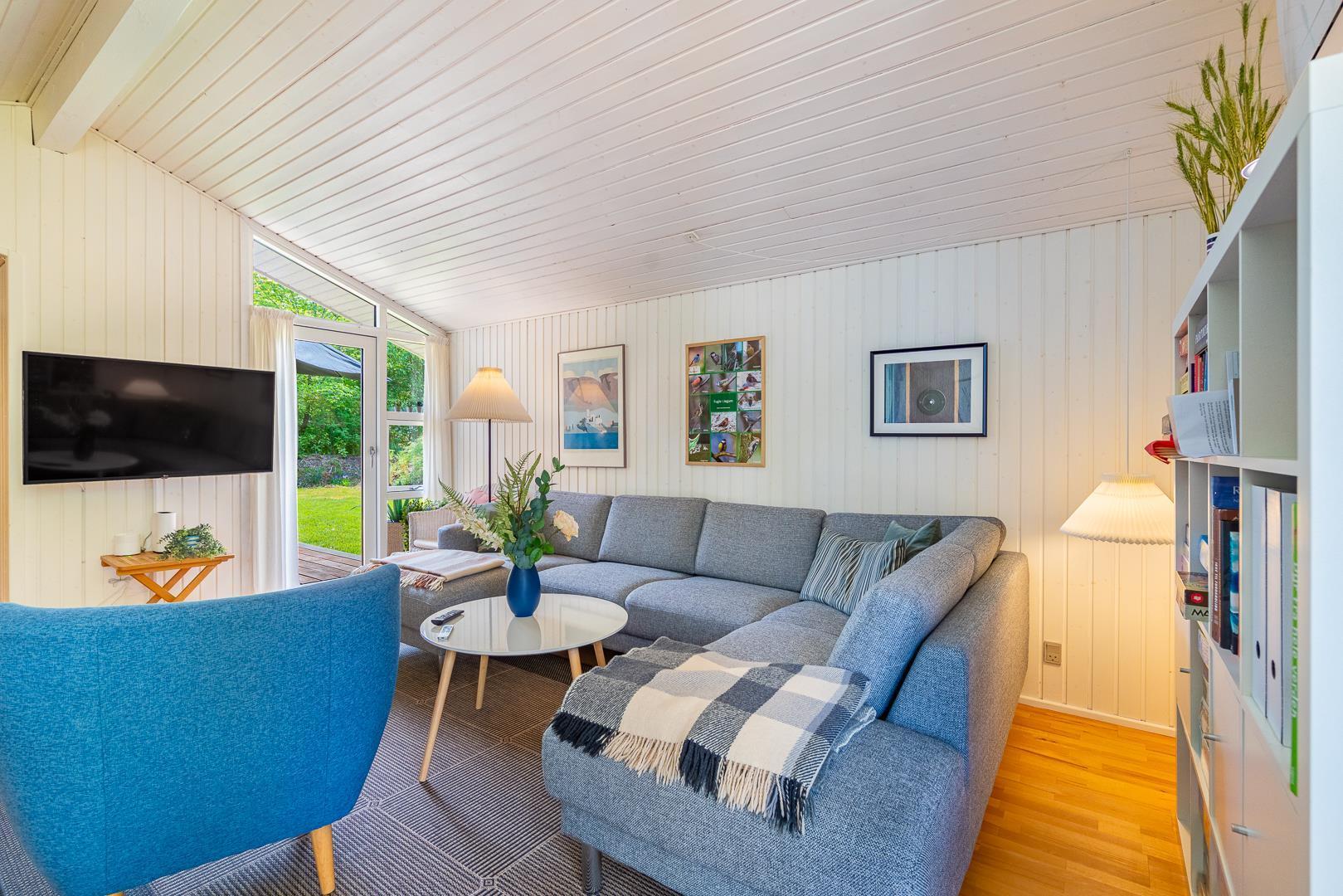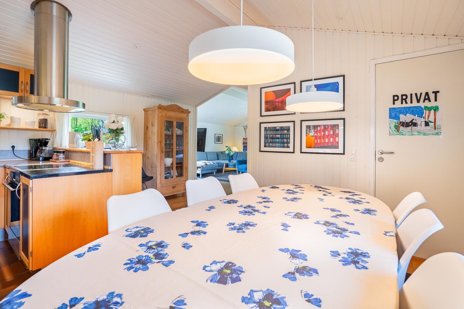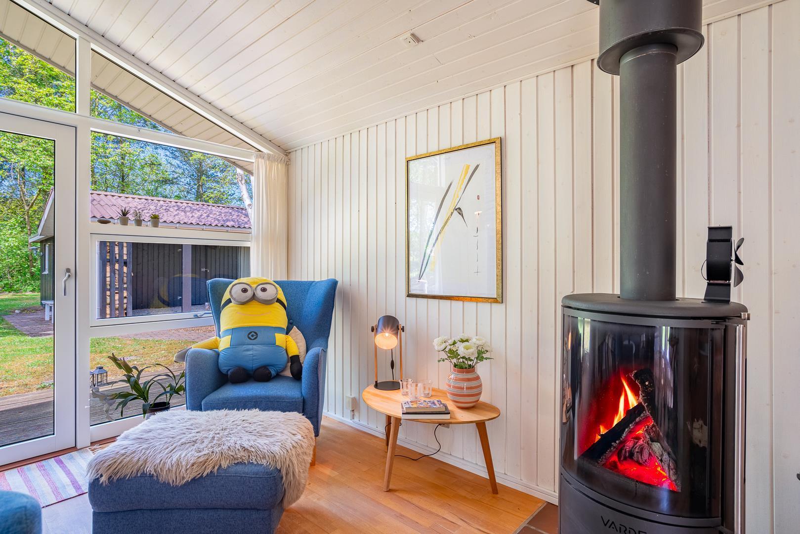Det store opholdsrum er hjertet i sommerhuset – her kan I nyde hyggelige aftener foran brændeovnen, se film via Chromecast eller bare slappe af i sofaen. Det åbne køkken er stilfuldt og fuldt udstyret med bl.a. opvaskemaskine, så madlavningen bliver let og hyggelig. Gulvvarme og varmepumpe sikrer et behageligt indeklima året rundt.