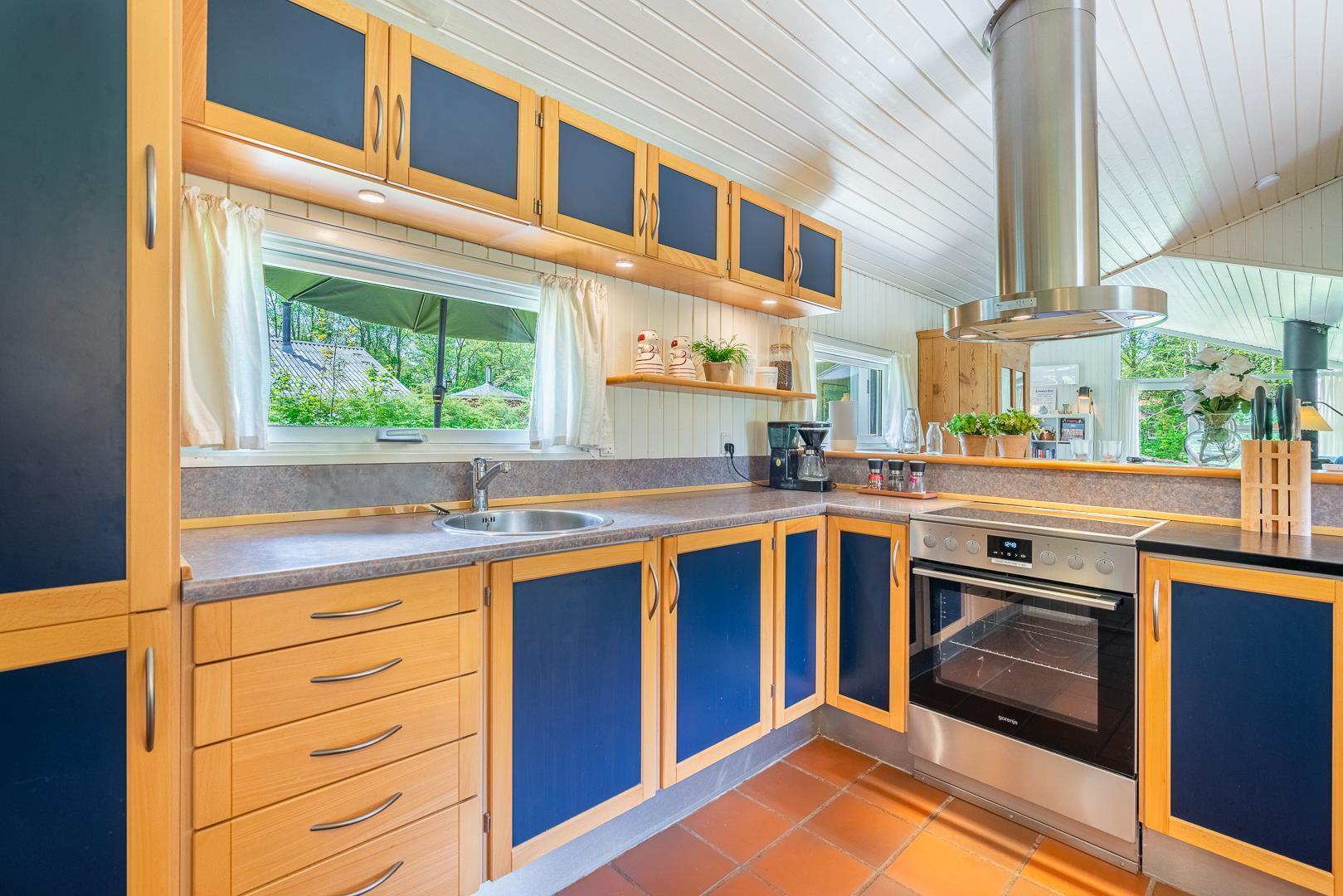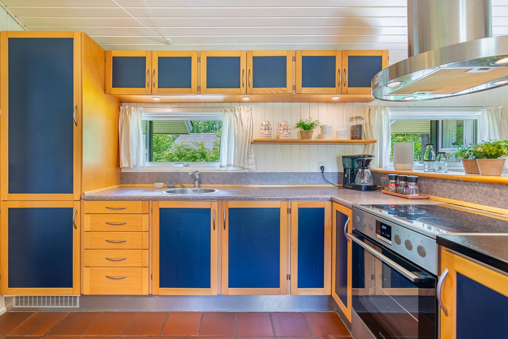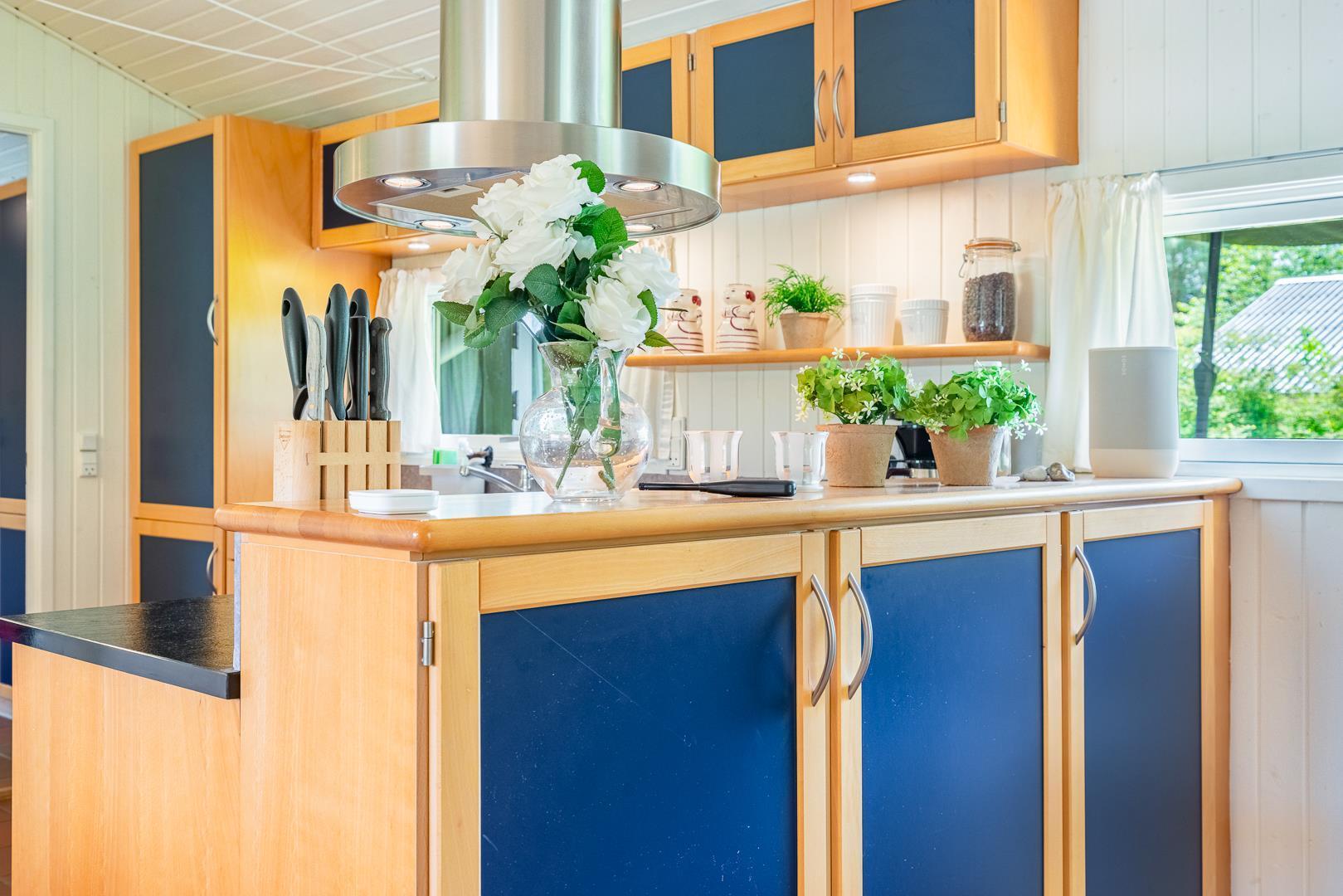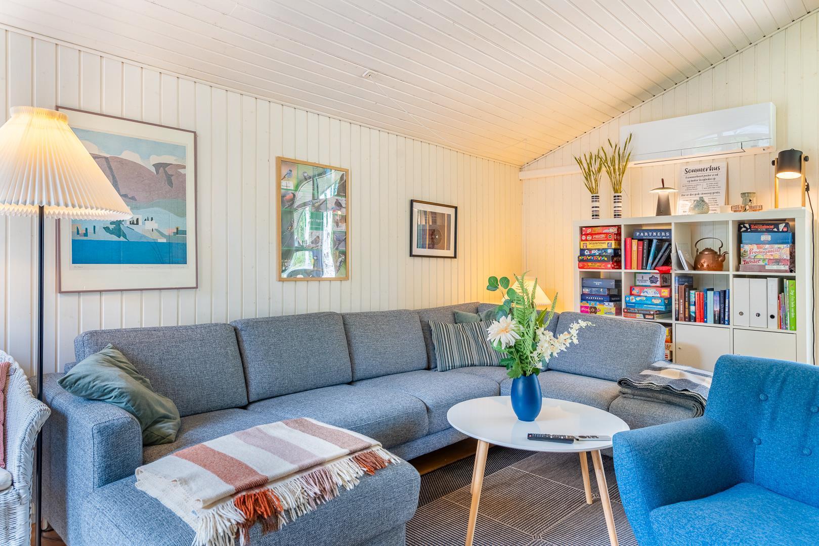 Det store opholdsrum er hjertet i sommerhuset – her kan I nyde hyggelige aftener foran brændeovnen, se film via Chromecast eller bare slappe af i sofaen. Det åbne køkken er stilfuldt og fuldt udstyret med bl.a. opvaskemaskine, så madlavningen bliver let og hyggelig. Gulvvarme og varmepumpe sikrer et behageligt indeklima året rundt.