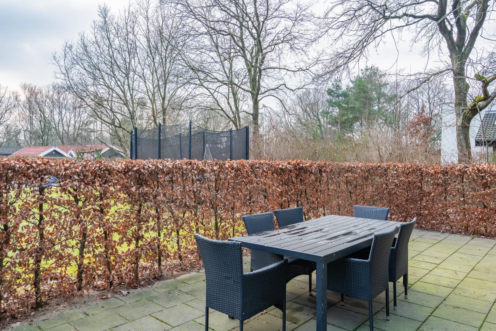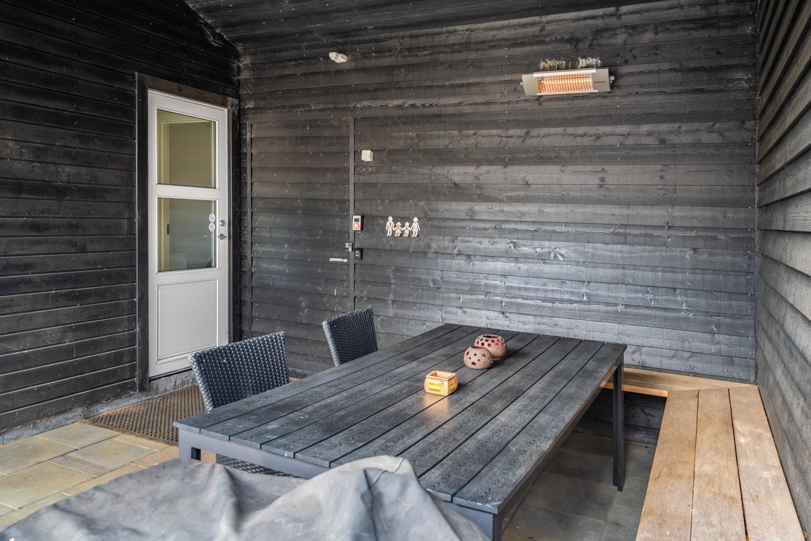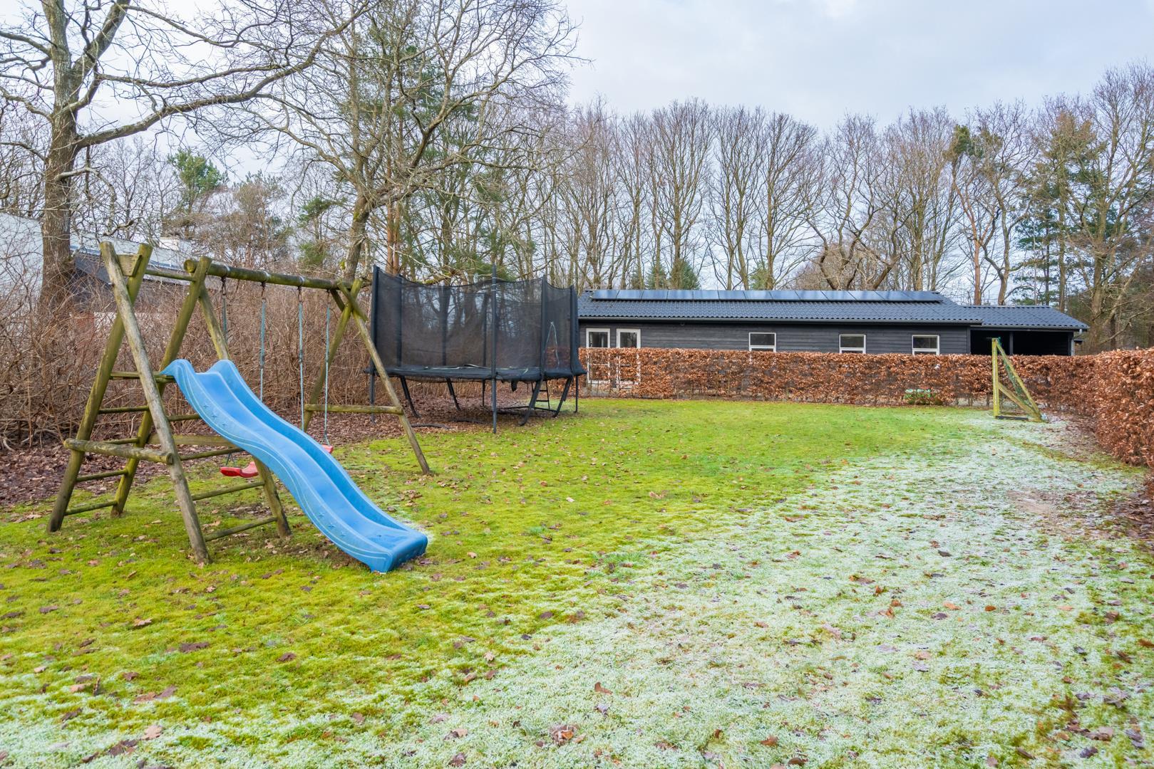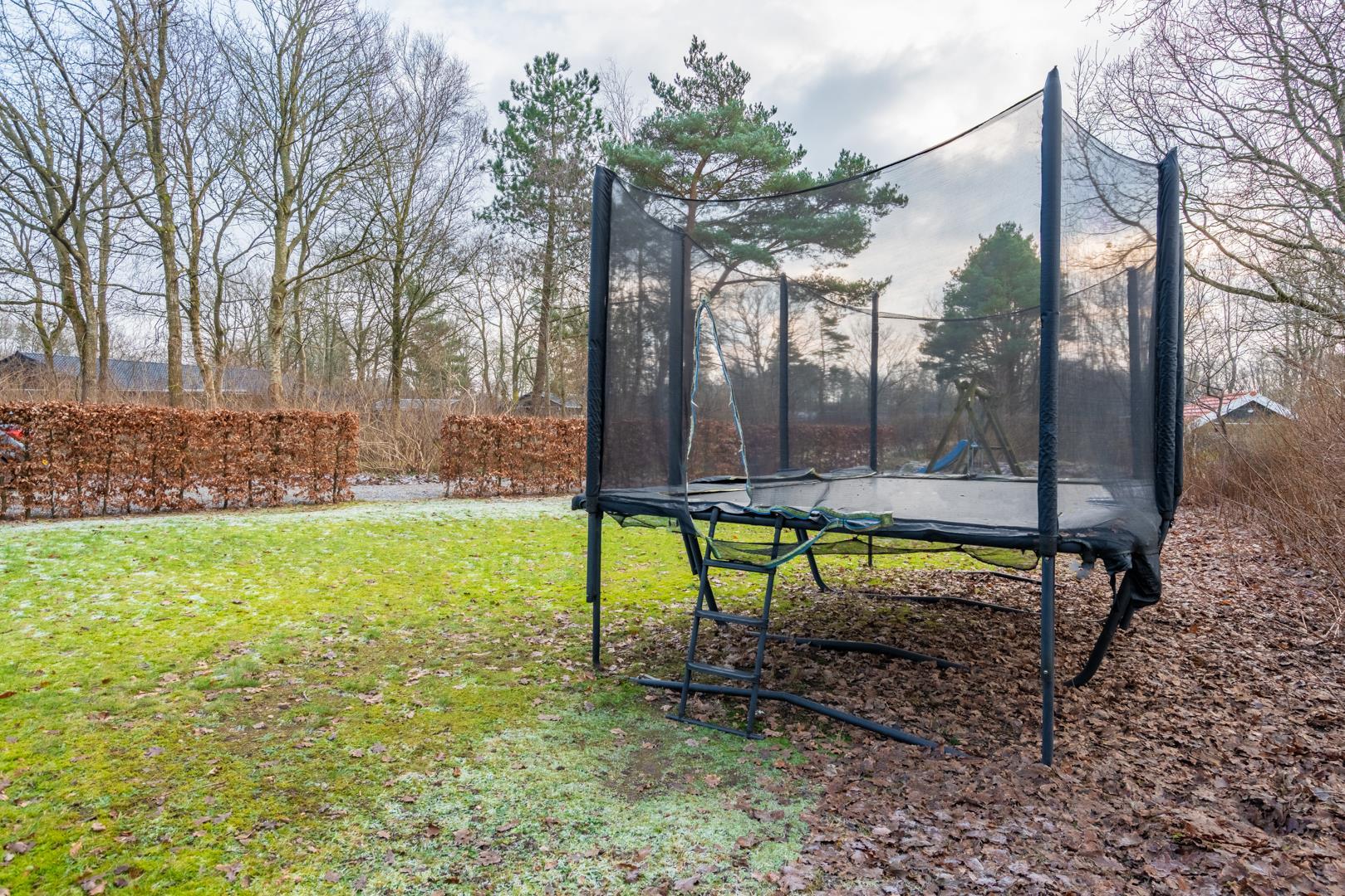 Udendørs kan du nyde ferien på den overdækkede terrasse, hvor der er mulighed for at slappe af i al slags vejr. For familiens yngste byder haven på både gynge og trampolin, så der er rig mulighed for leg og bevægelse, mens de voksne nyder roen.