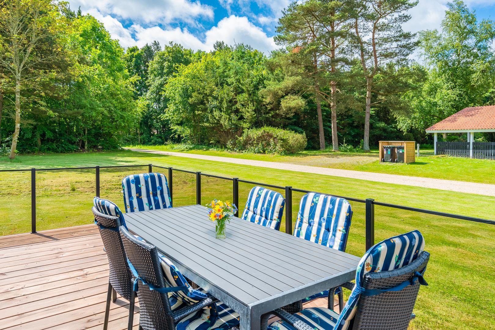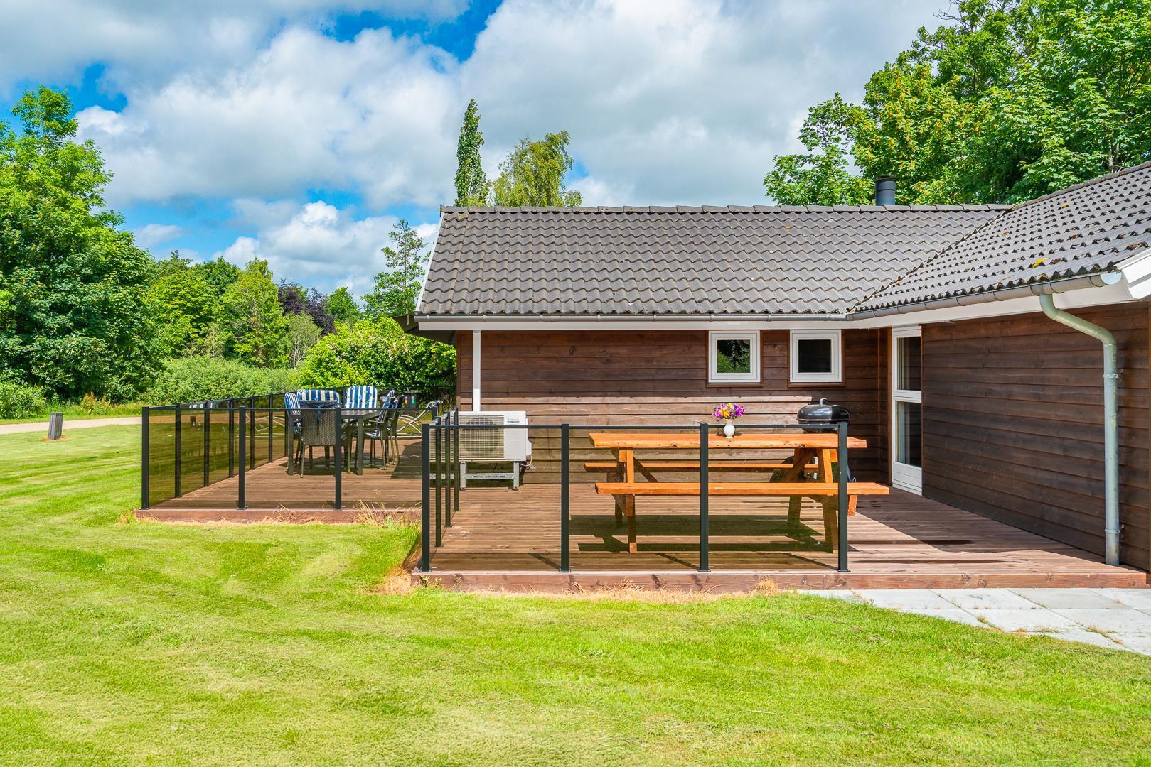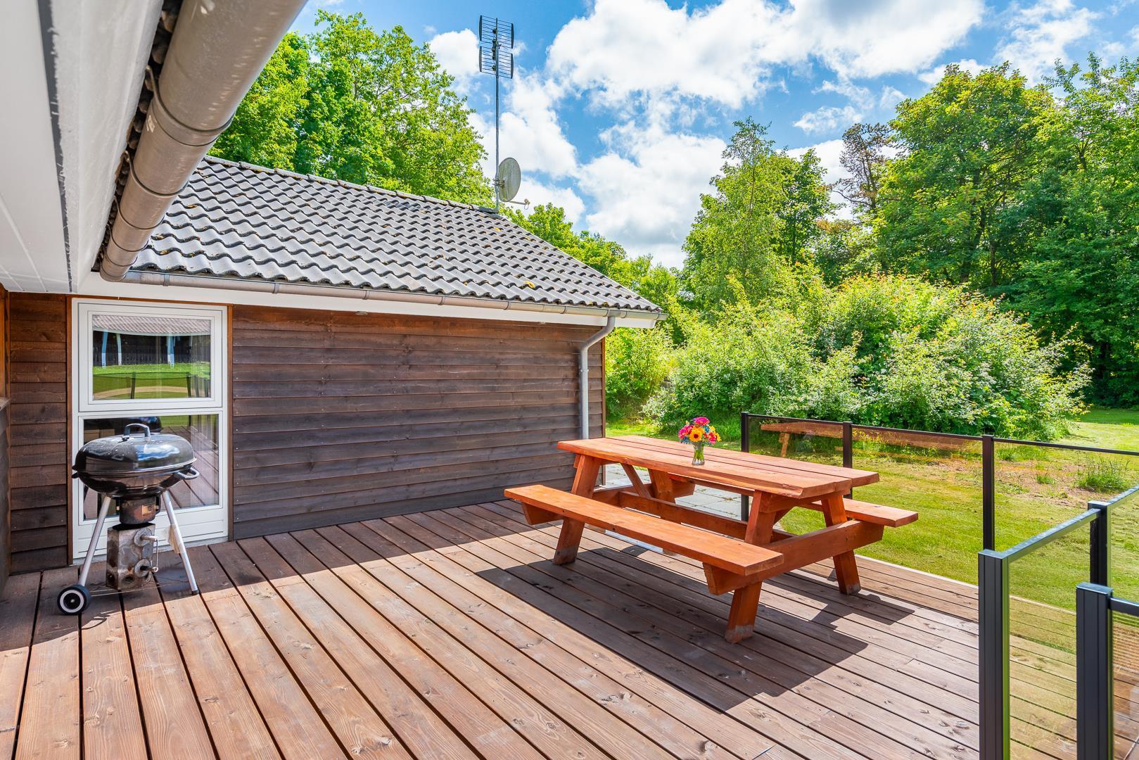 Feriehuset har et pænt badeværelse med spa og sauna, som giver ekstra komfort. Det kombinerede køkken og stue er husets samlingspunkt med spiseplads samt TV i både stue og værelser. Udenfor kan man nyde terrassen, der går rundt om det meste af huset, både åben og overdækket, samt en dejlig grillplads.