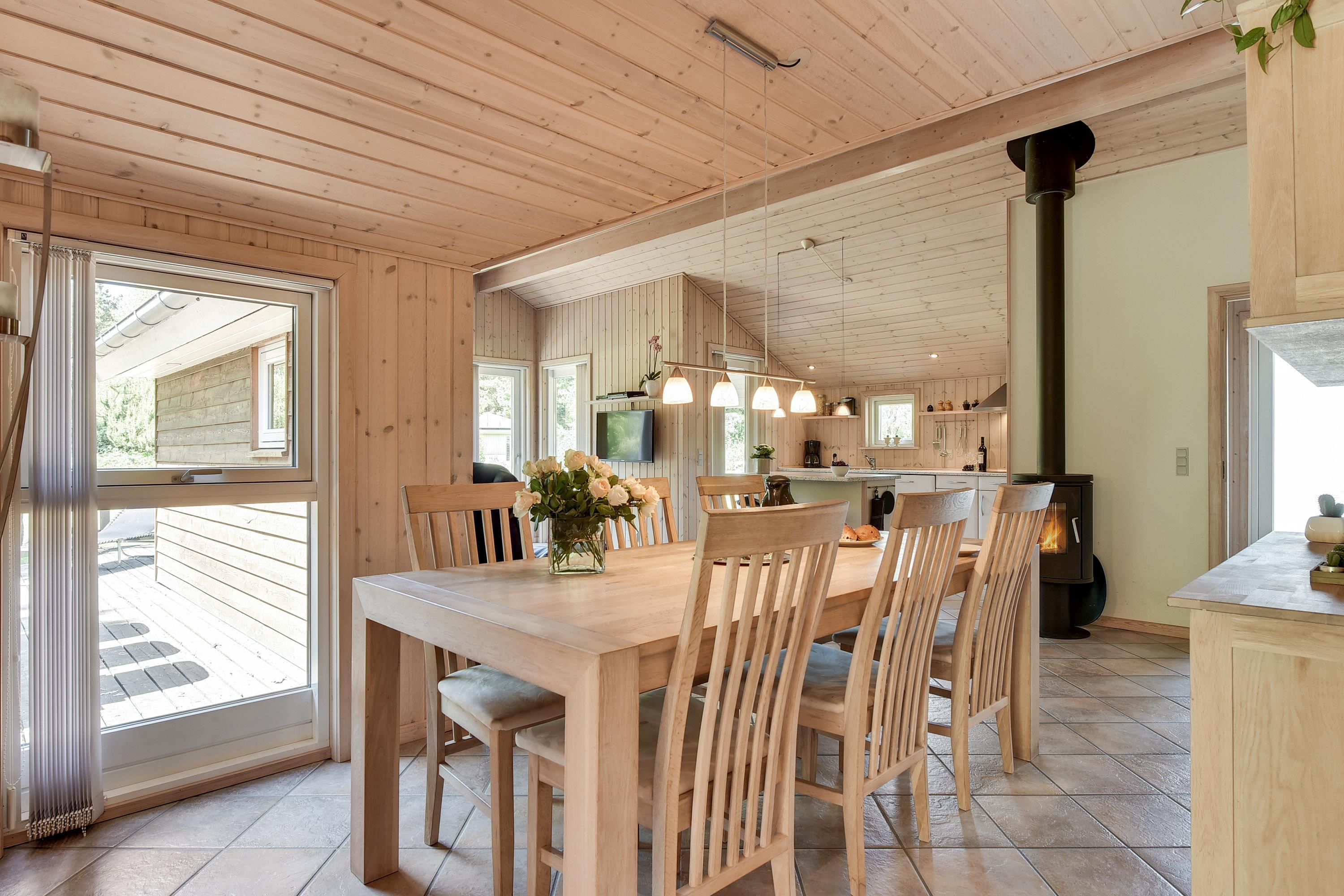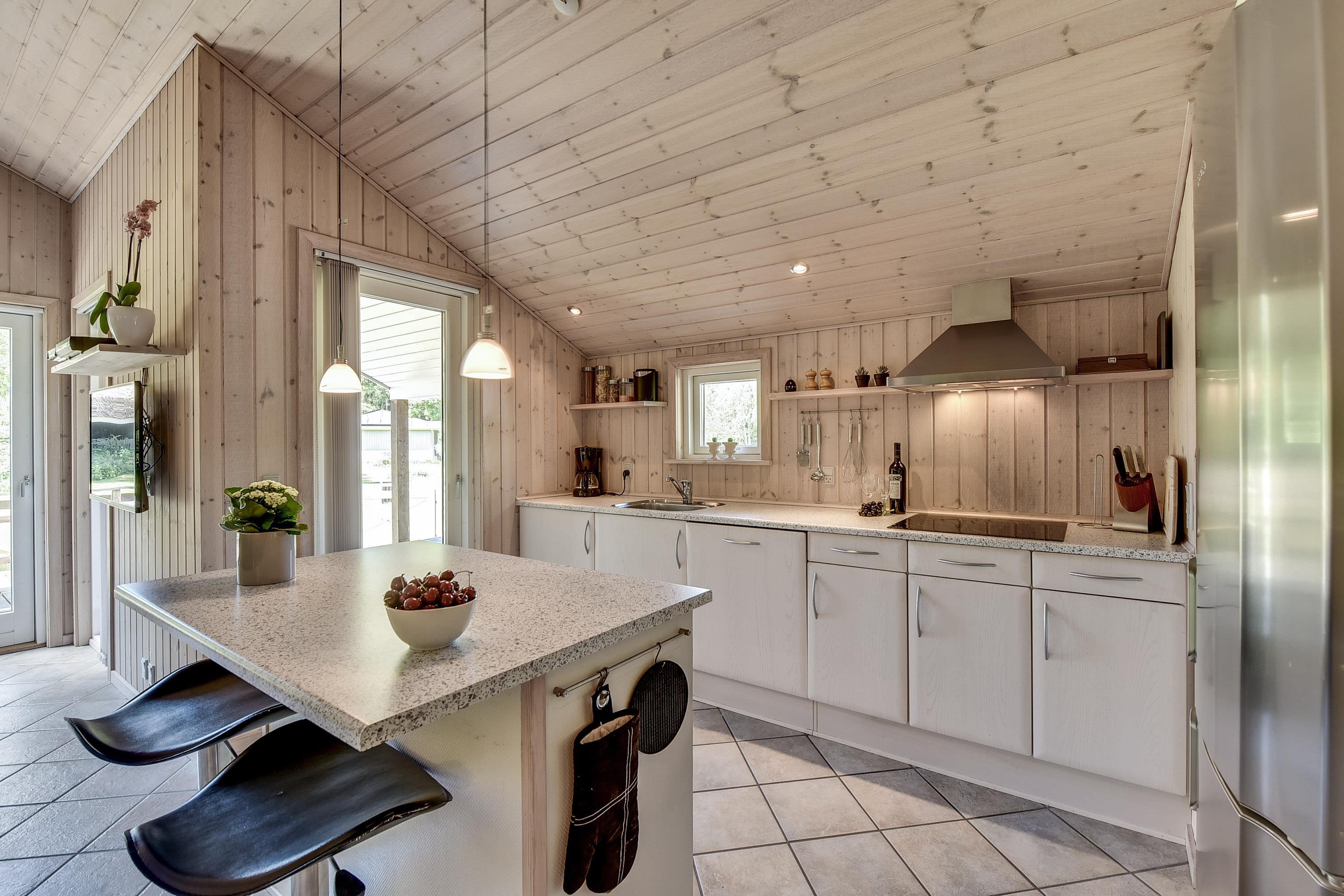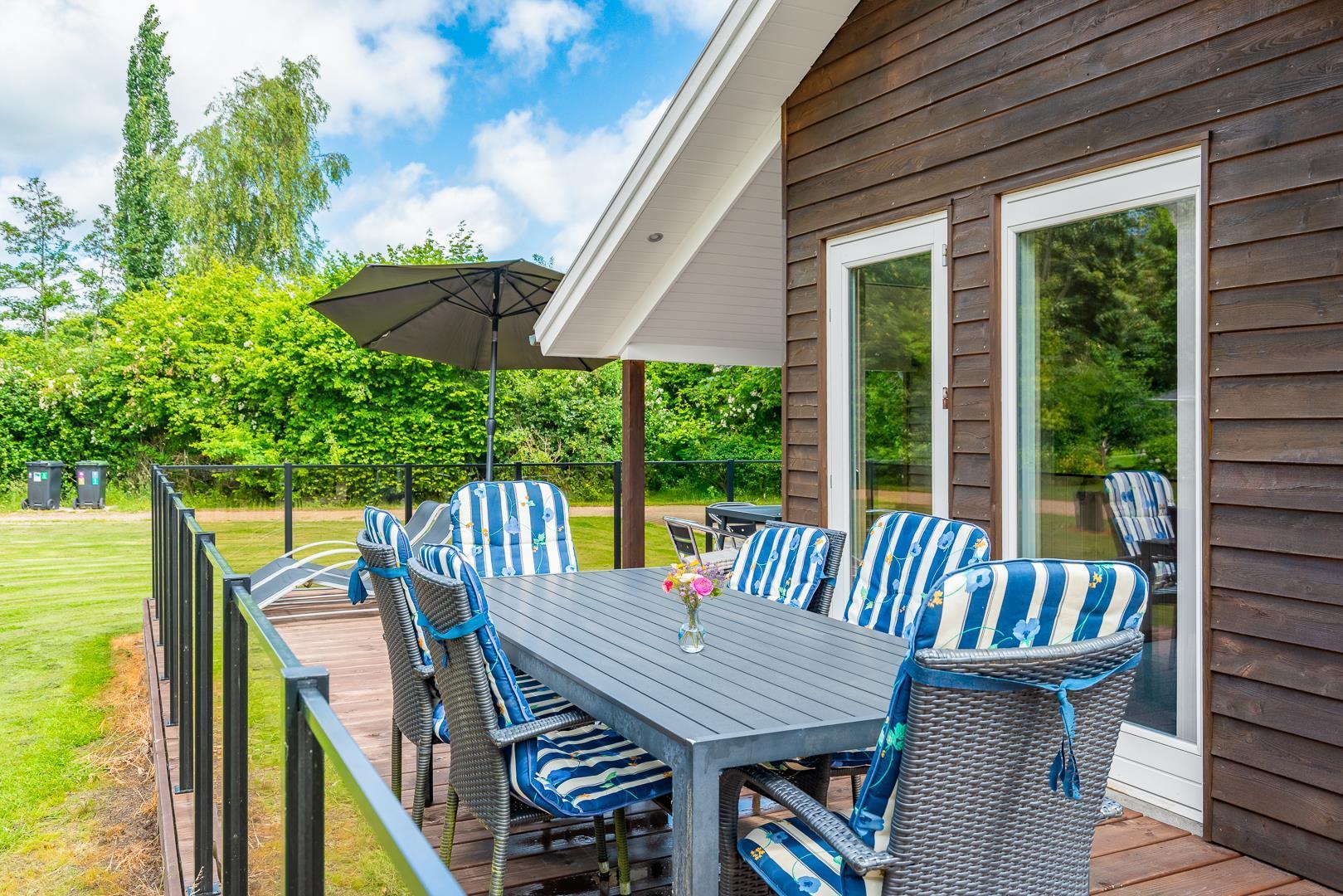 Feriehuset har et pænt badeværelse med spa og sauna, som giver ekstra komfort. Det kombinerede køkken og stue er husets samlingspunkt med spiseplads samt TV i både stue og værelser. Udenfor kan man nyde terrassen, der går rundt om det meste af huset, både åben og overdækket, samt en dejlig grillplads.