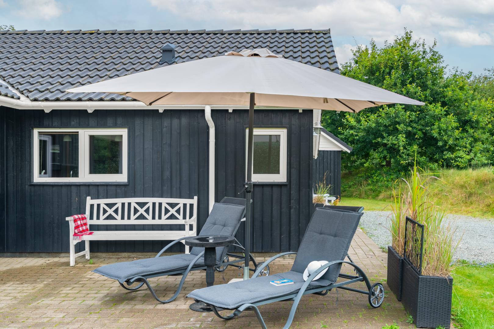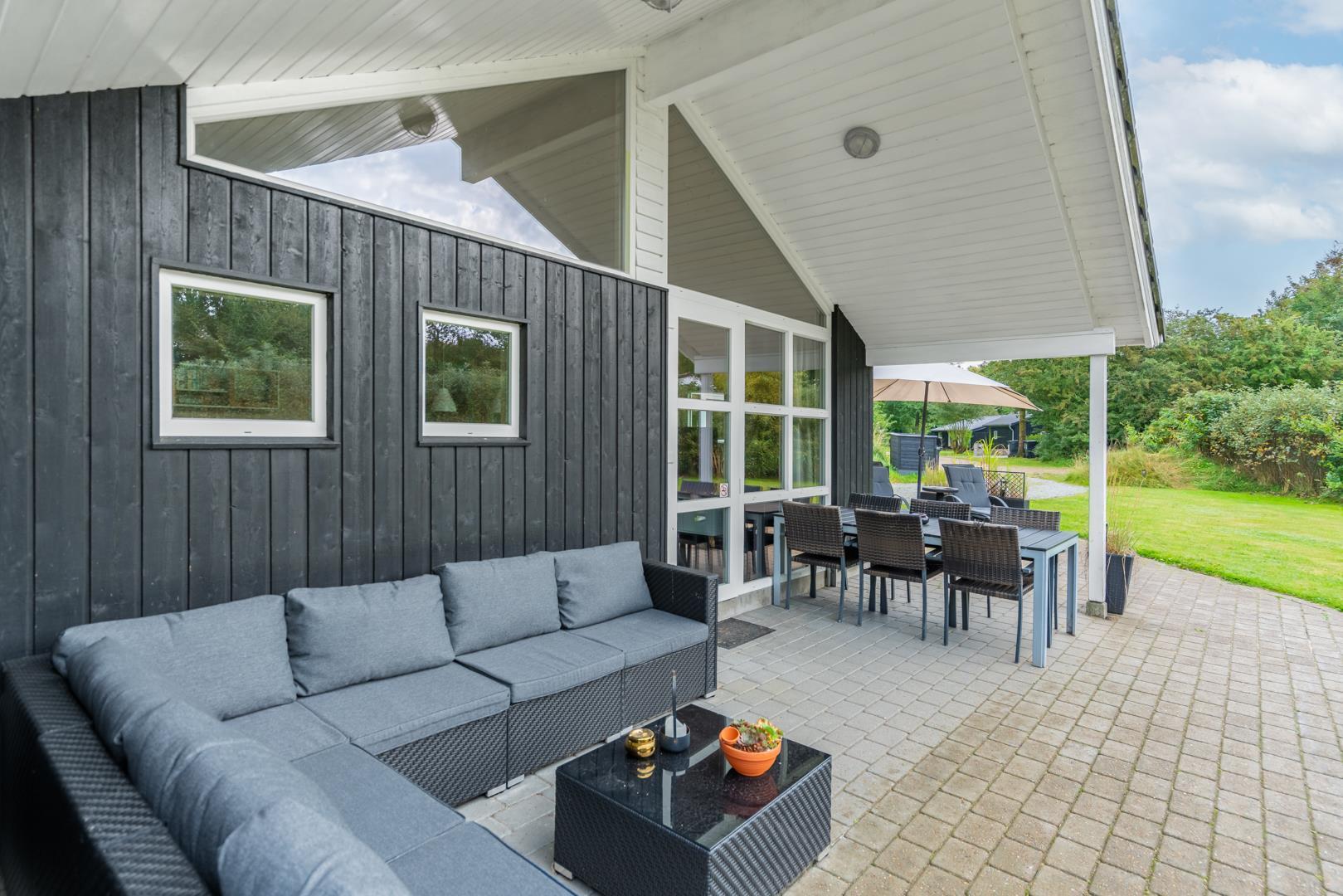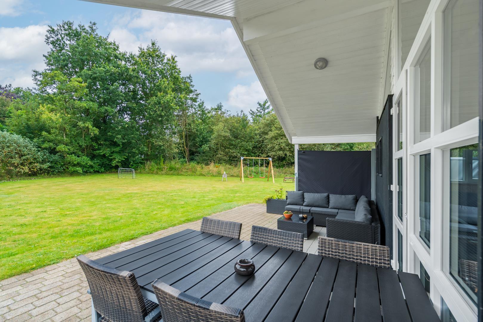 Stor terrasse med flere sidde muligheder, en del af terrassen er overdækket og vil kunne benyttes en stor del af året.