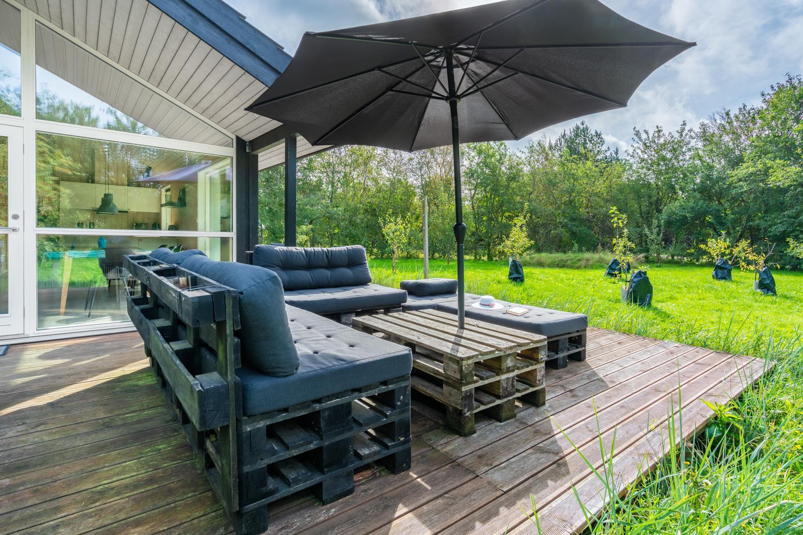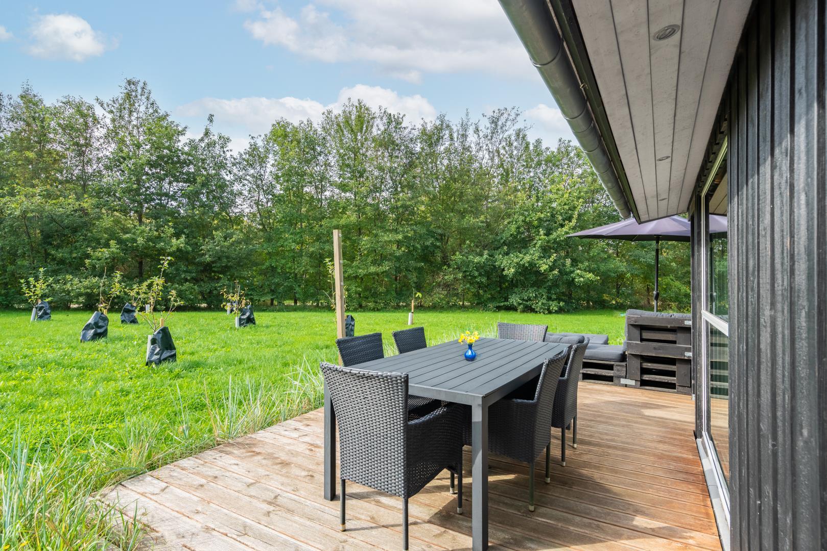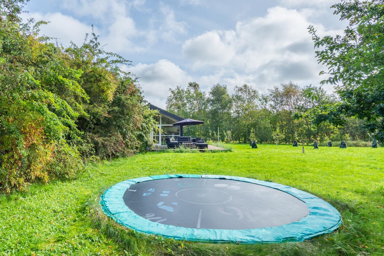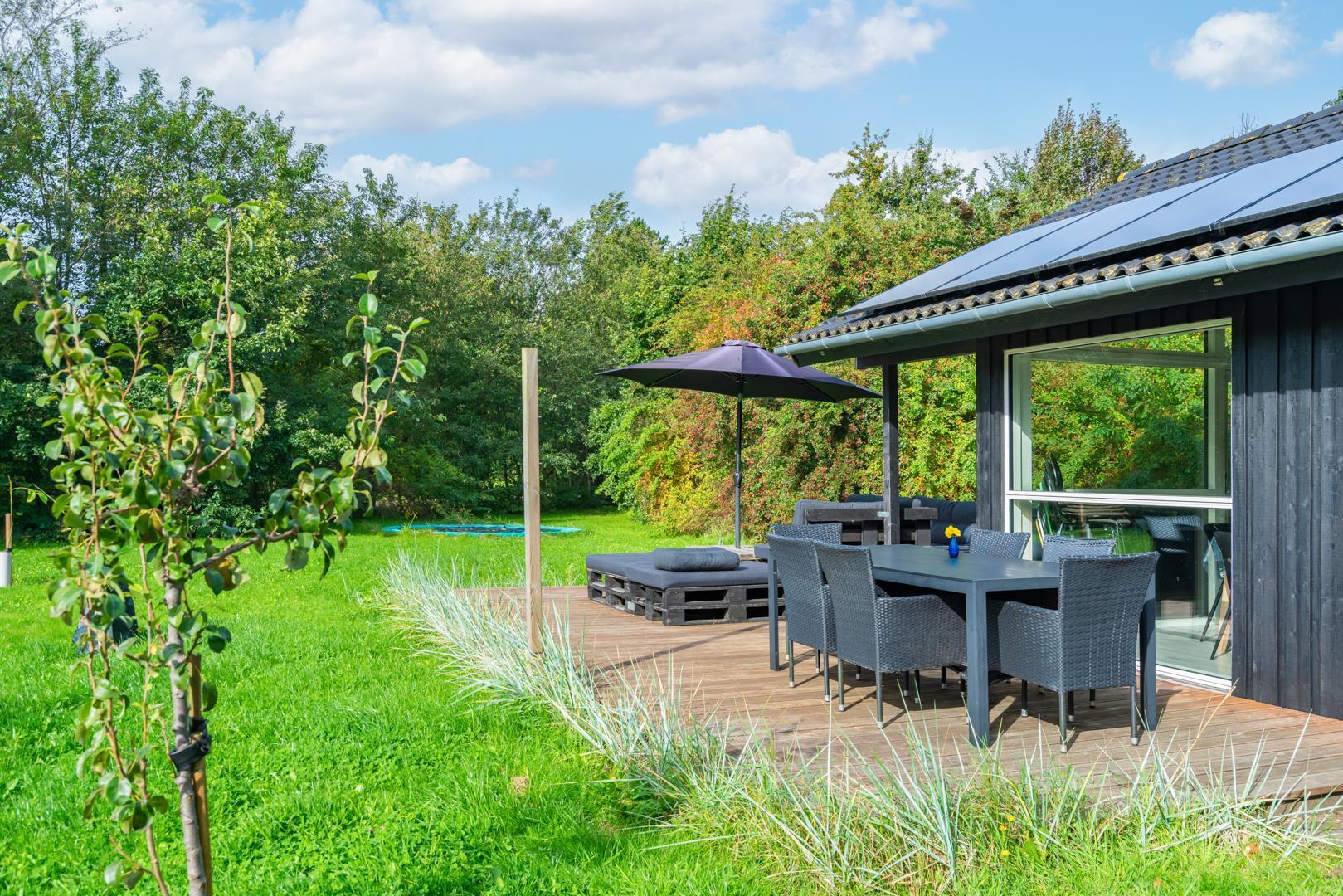 Udenfor finder I en dejlig, grøn grund med masser af plads til leg og afslapning. På den overdækkede terrasse kan I nyde morgenkaffen i solen eller grille om aftenen, mens børnene more sig på trampolinen.