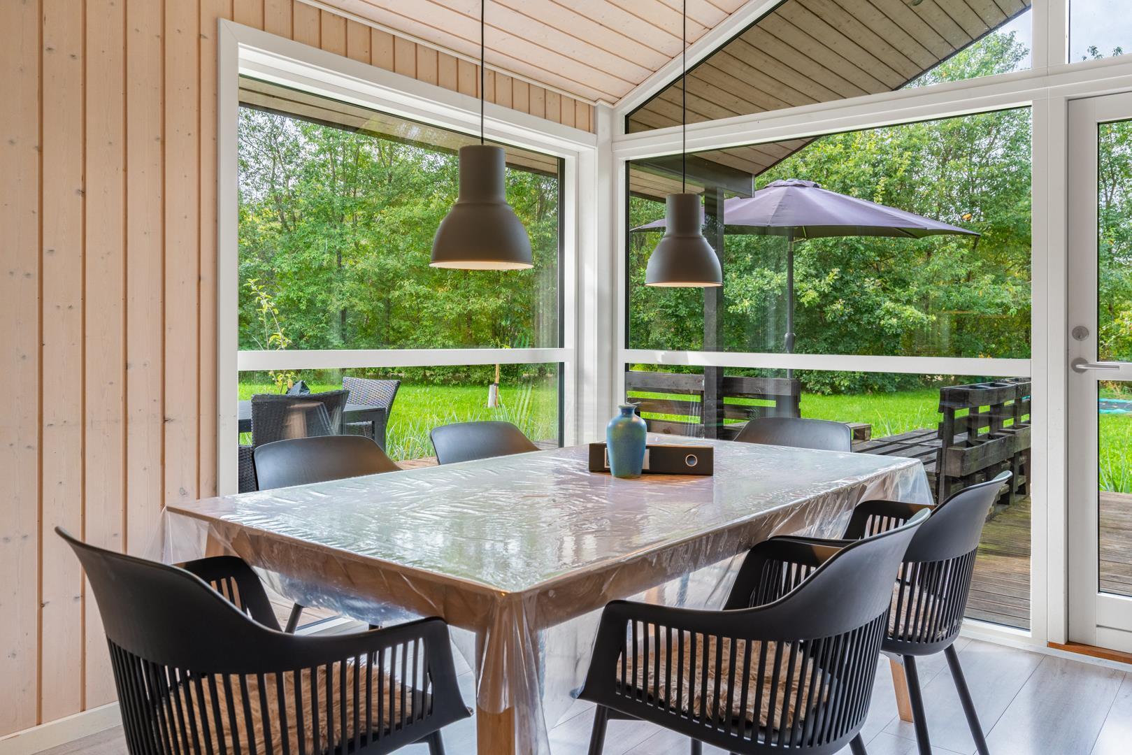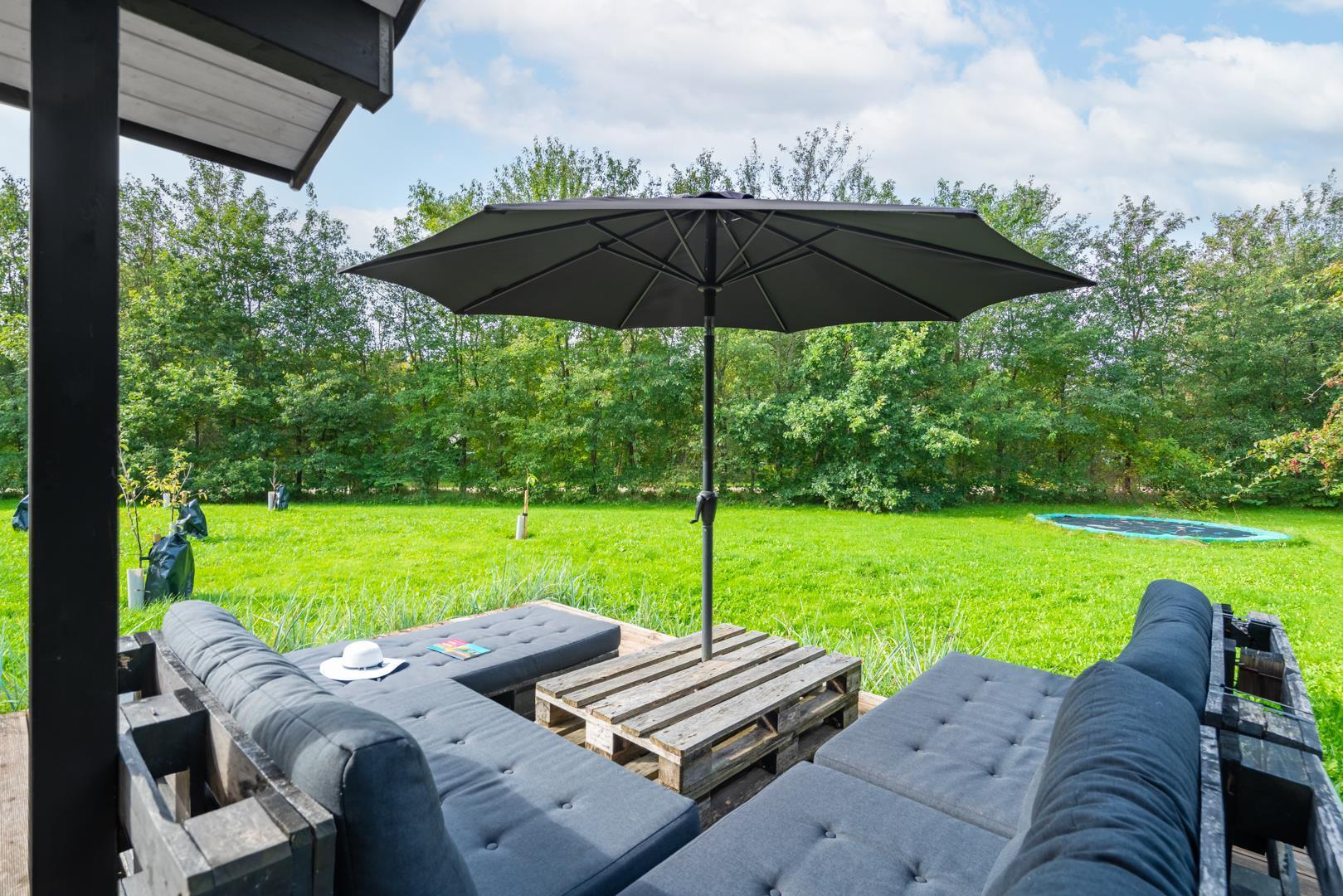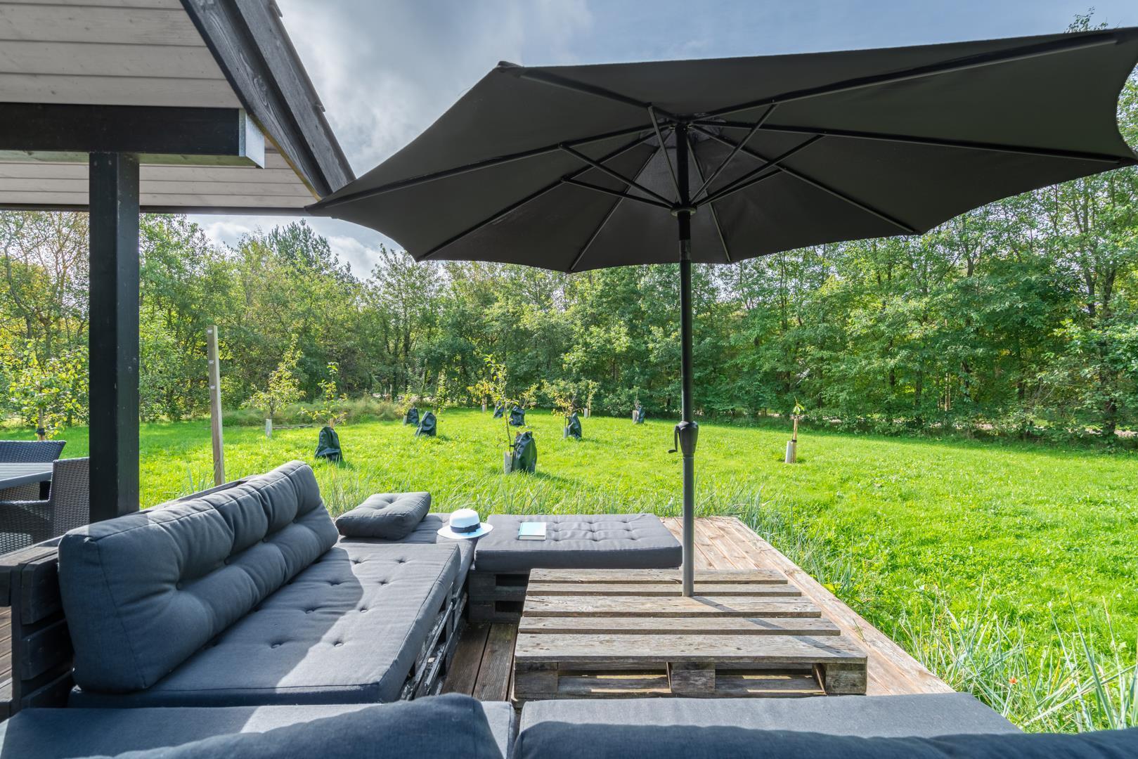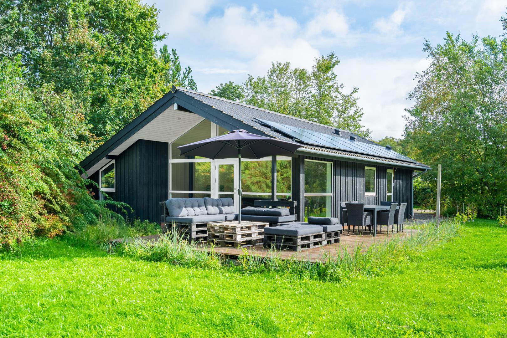 Udenfor finder I en dejlig, grøn grund med masser af plads til leg og afslapning. På den overdækkede terrasse kan I nyde morgenkaffen i solen eller grille om aftenen, mens børnene more sig på trampolinen.