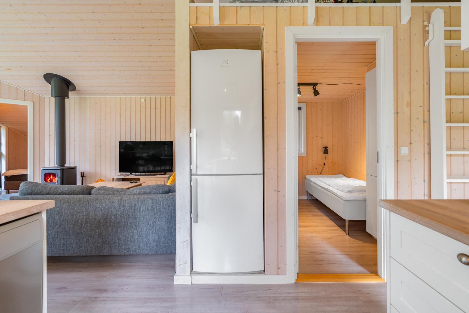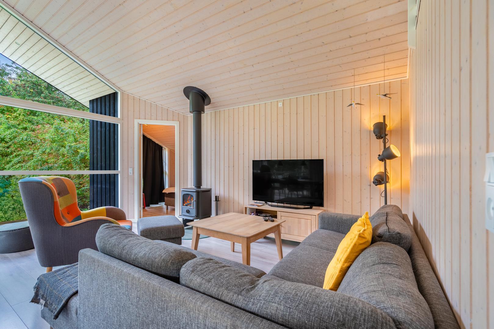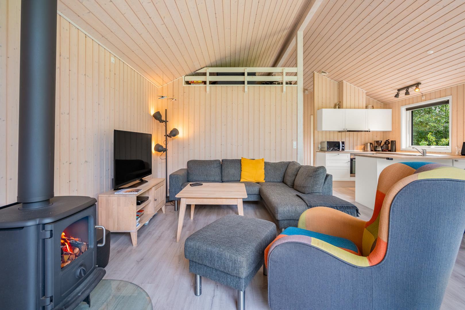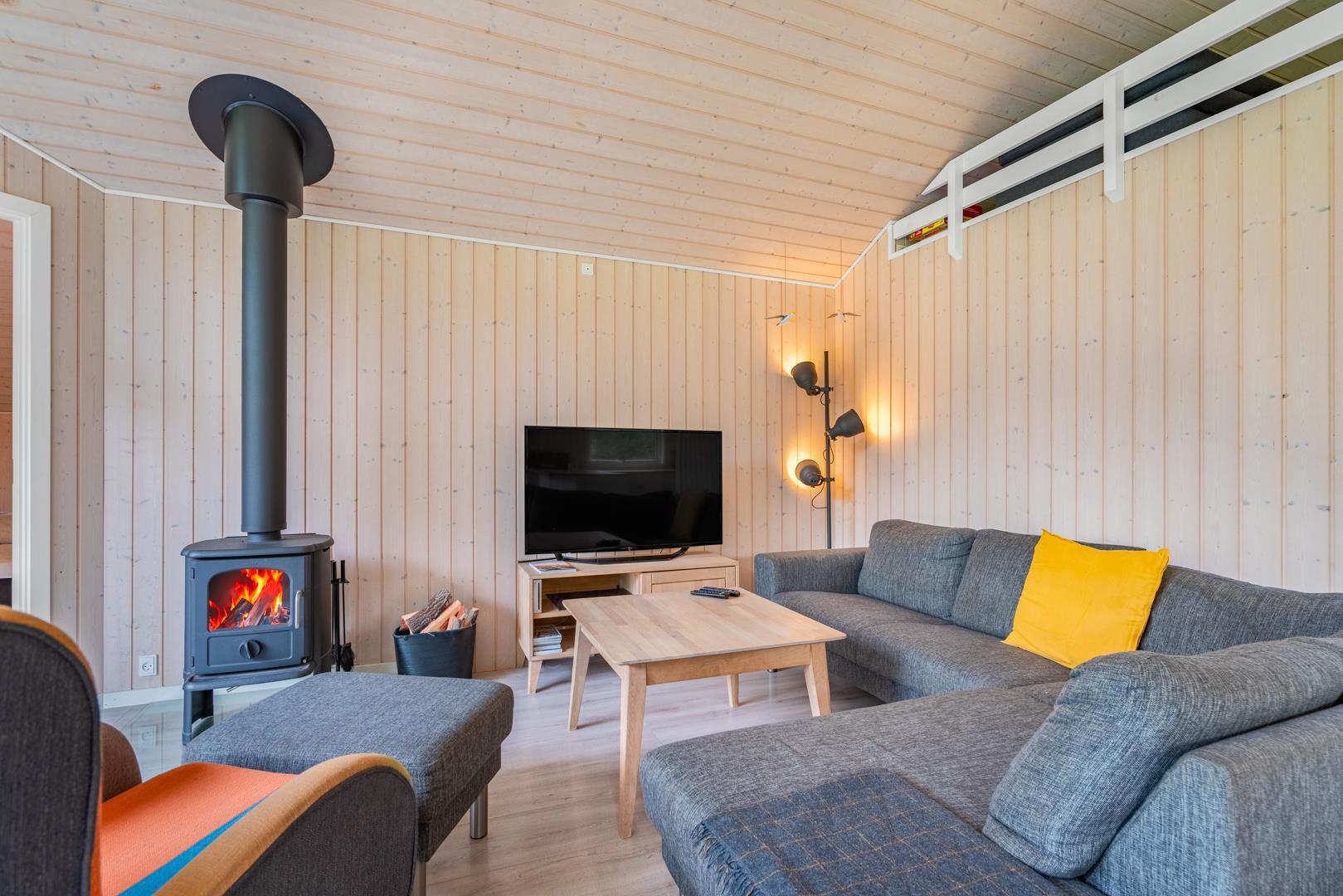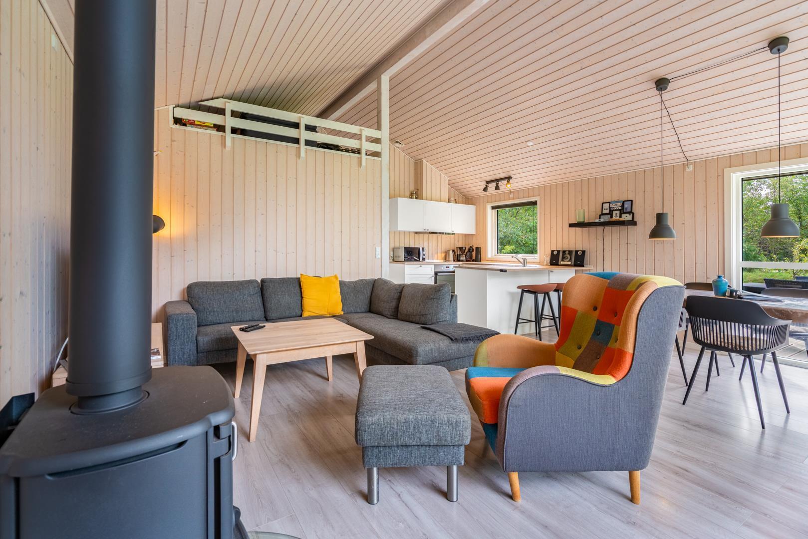 Sommerhuset byder på en lyst og indbydende stue med brændeovn, som spreder varme og hygge på kølige dage. En moderne varmepumpe sørger for et behageligt indeklima året rundt.
