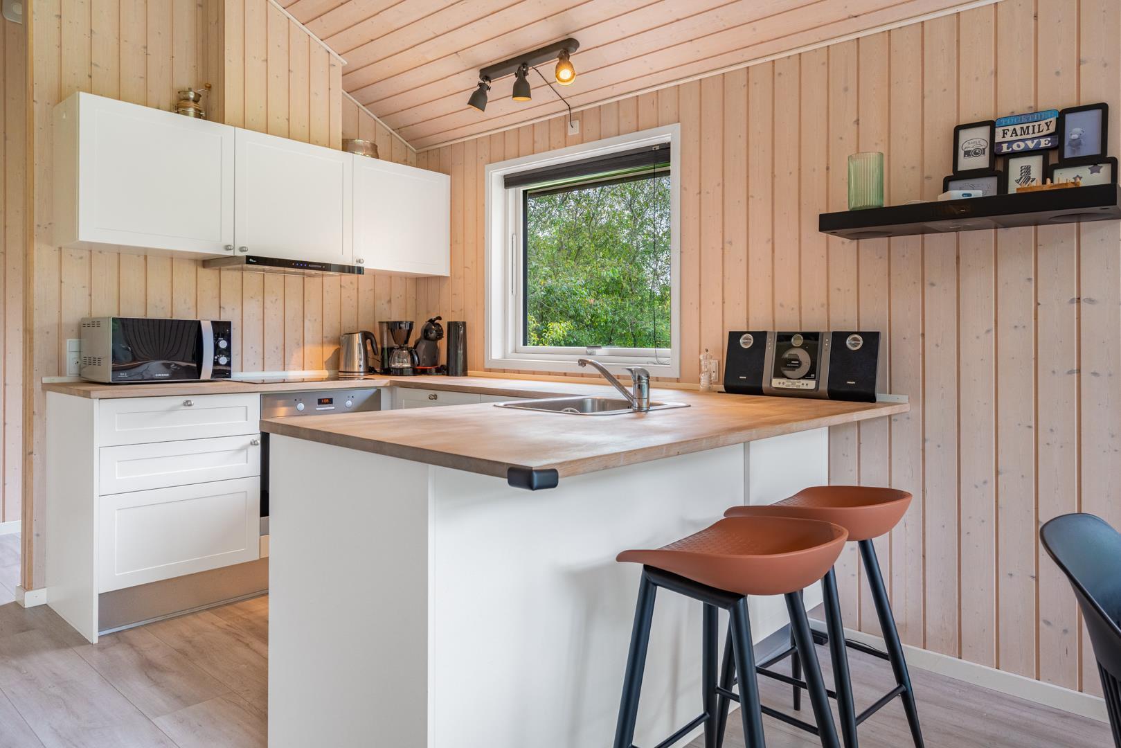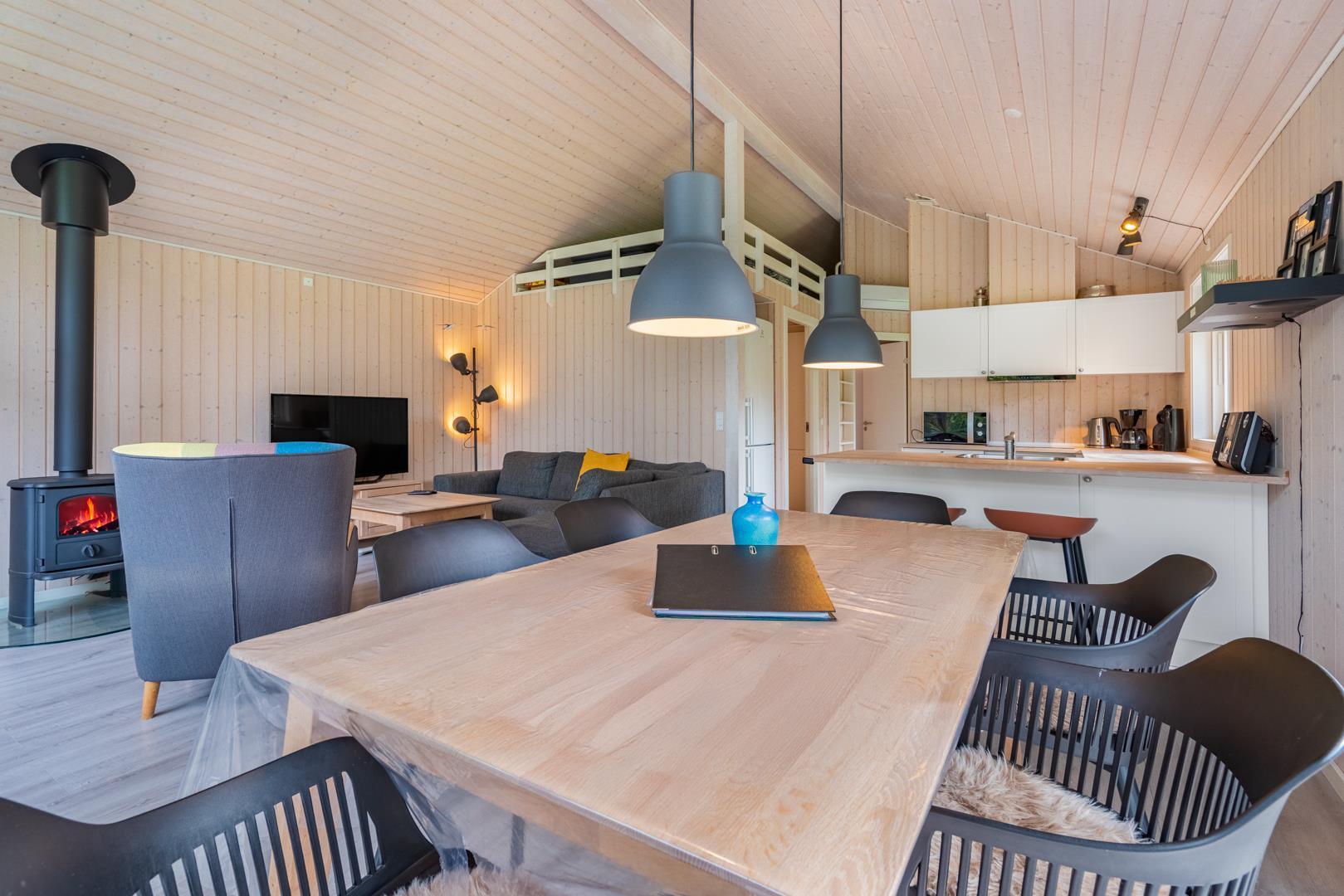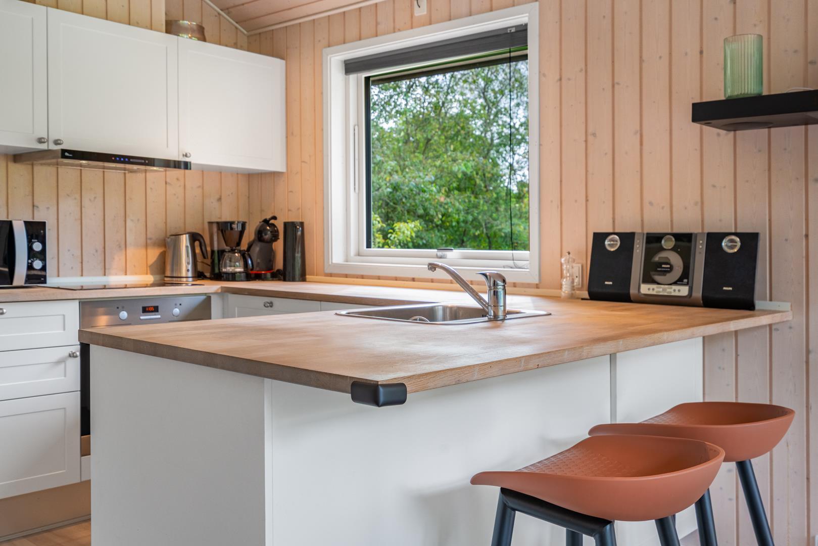 Det åbne køkken er godt udstyret med opvaskemaskine og alt, hvad I skal bruge til feriens madlavning. Spisepladsen samler familien omkring måltiderne, og i stuen er der både tv og spillekonsol til hyggelige aftener. Badeværelset har gulvvarme, og der findes vaskemaskine – praktisk, især ved længere ophold.
