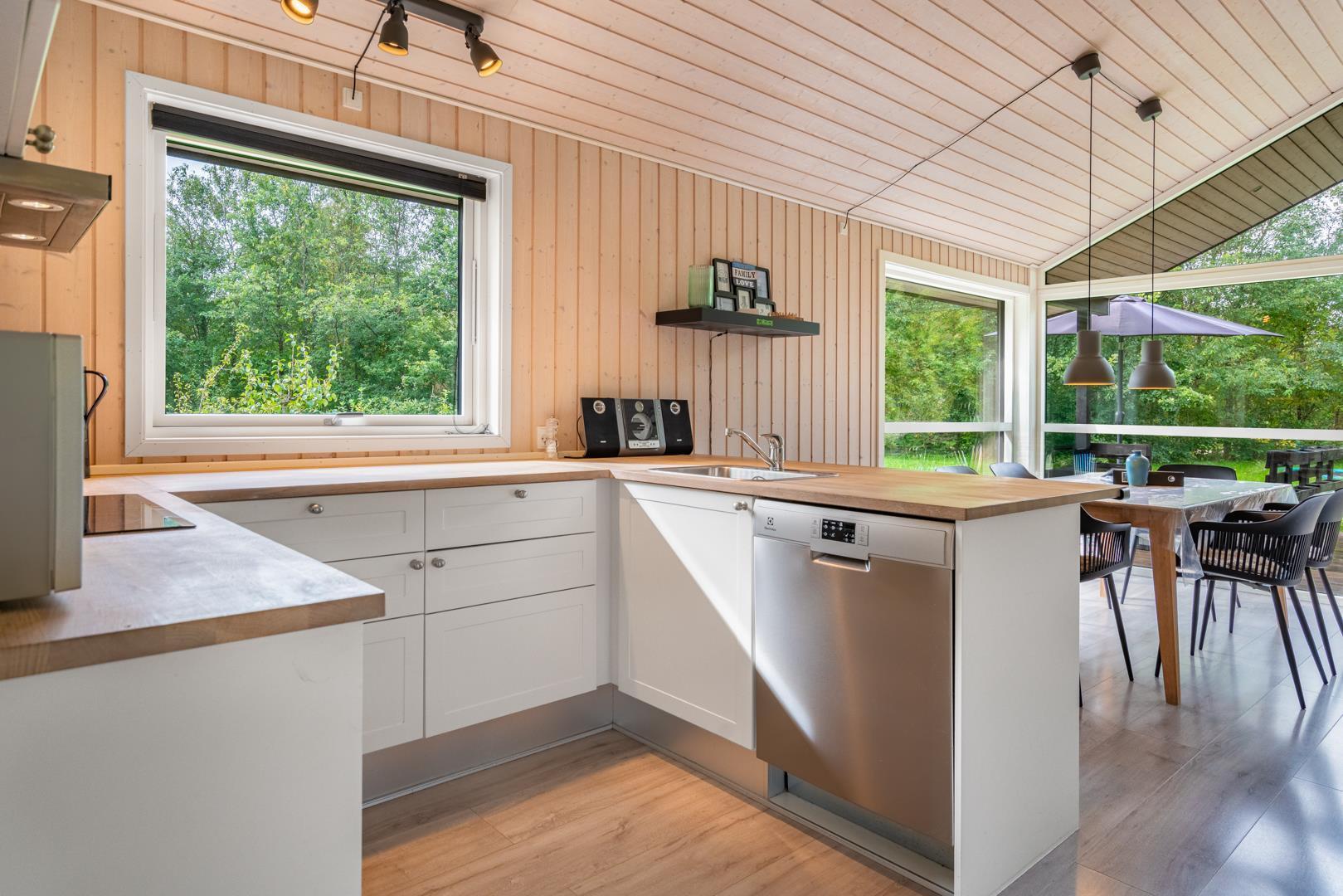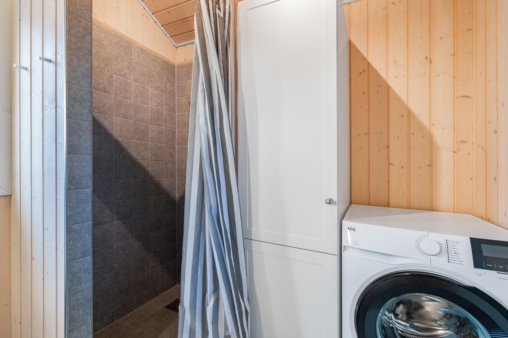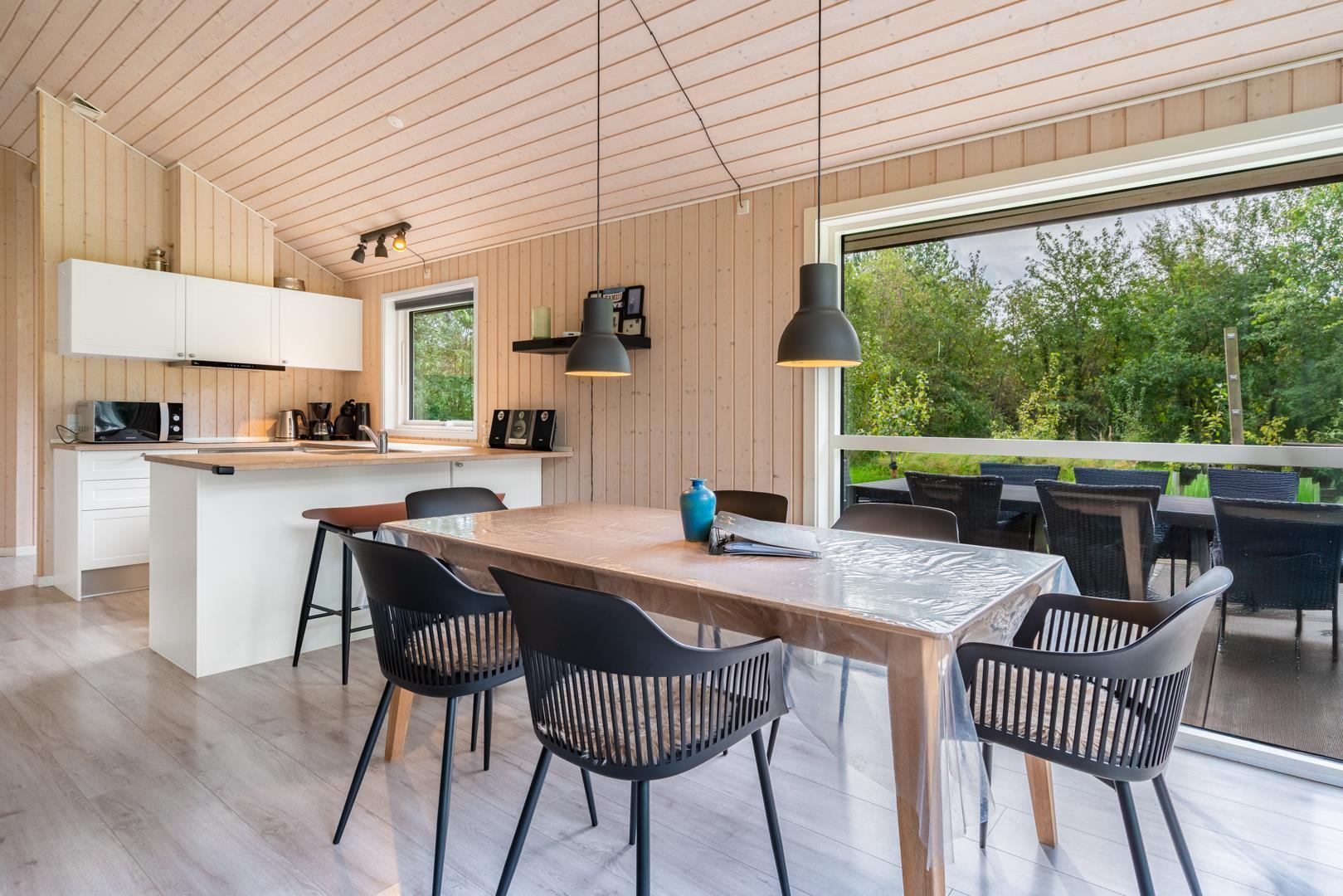 Det åbne køkken er godt udstyret med opvaskemaskine og alt, hvad I skal bruge til feriens madlavning. Spisepladsen samler familien omkring måltiderne, og i stuen er der både tv og spillekonsol til hyggelige aftener. Badeværelset har gulvvarme, og der findes vaskemaskine – praktisk, især ved længere ophold.