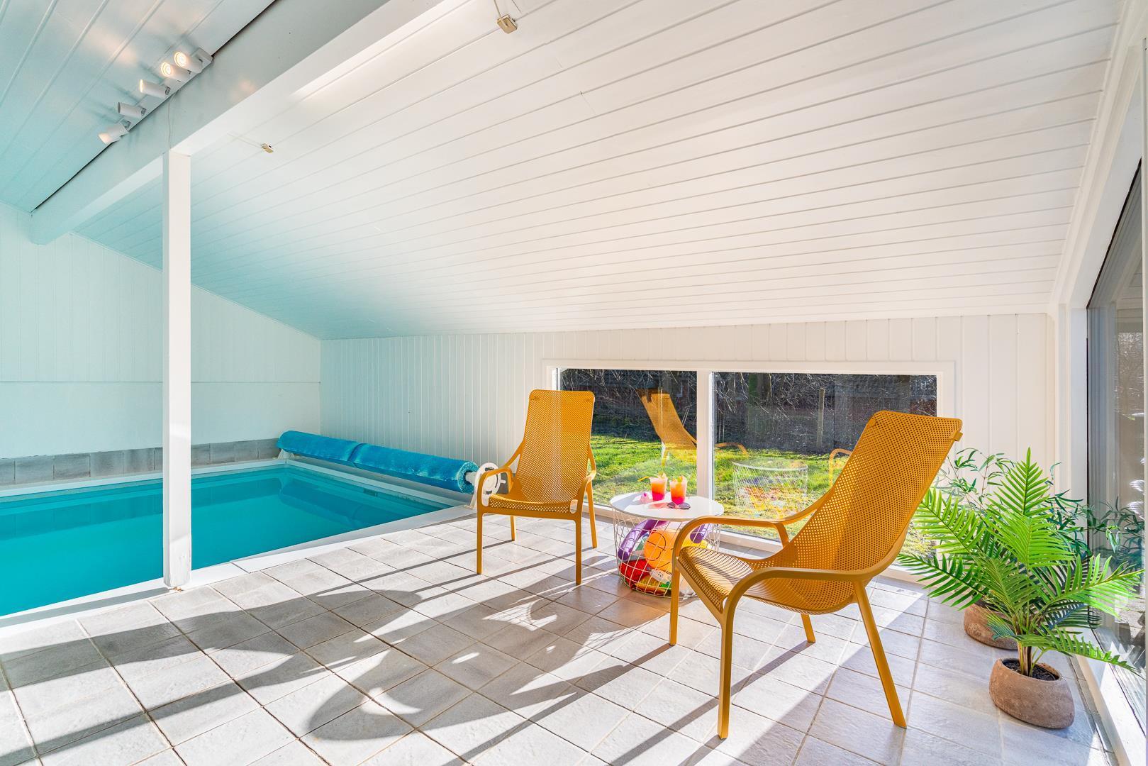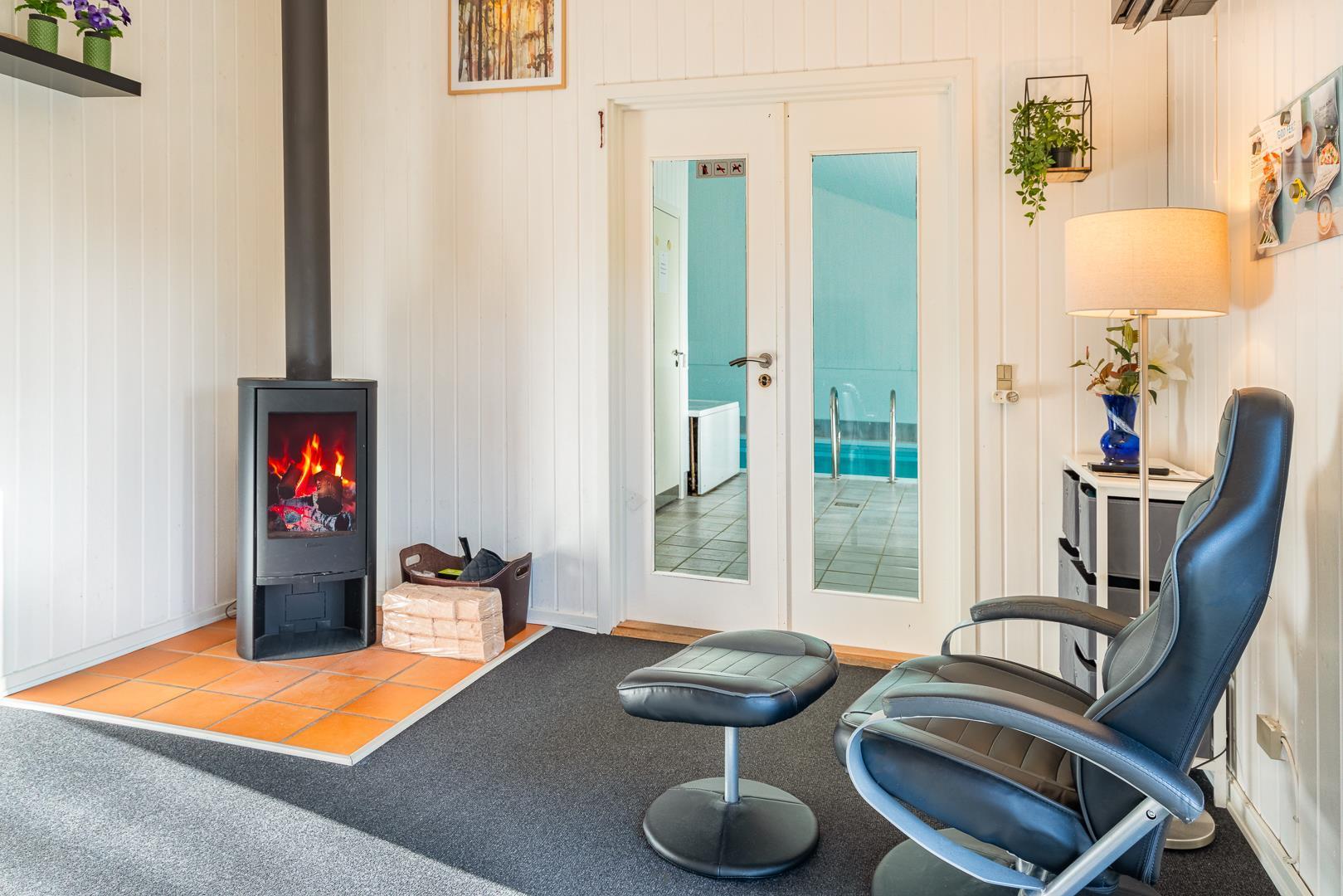 Lyst og moderne indretning med pool, sauna og brændeovn