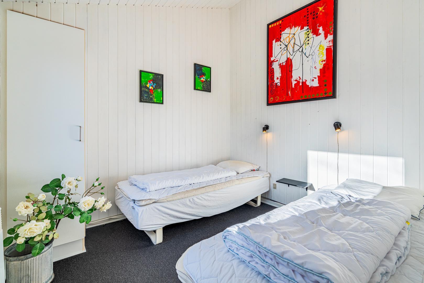 Når man træder ind i sommerhuset, mærker man straks den hyggelige atmosfære. De 153 m² er lyst og venligt indrettet med fokus på komfort og fællesskab. Her er fire soveværelser – tre med dobbeltsenge og ét med to enkeltsenge – så der er god plads til alle.