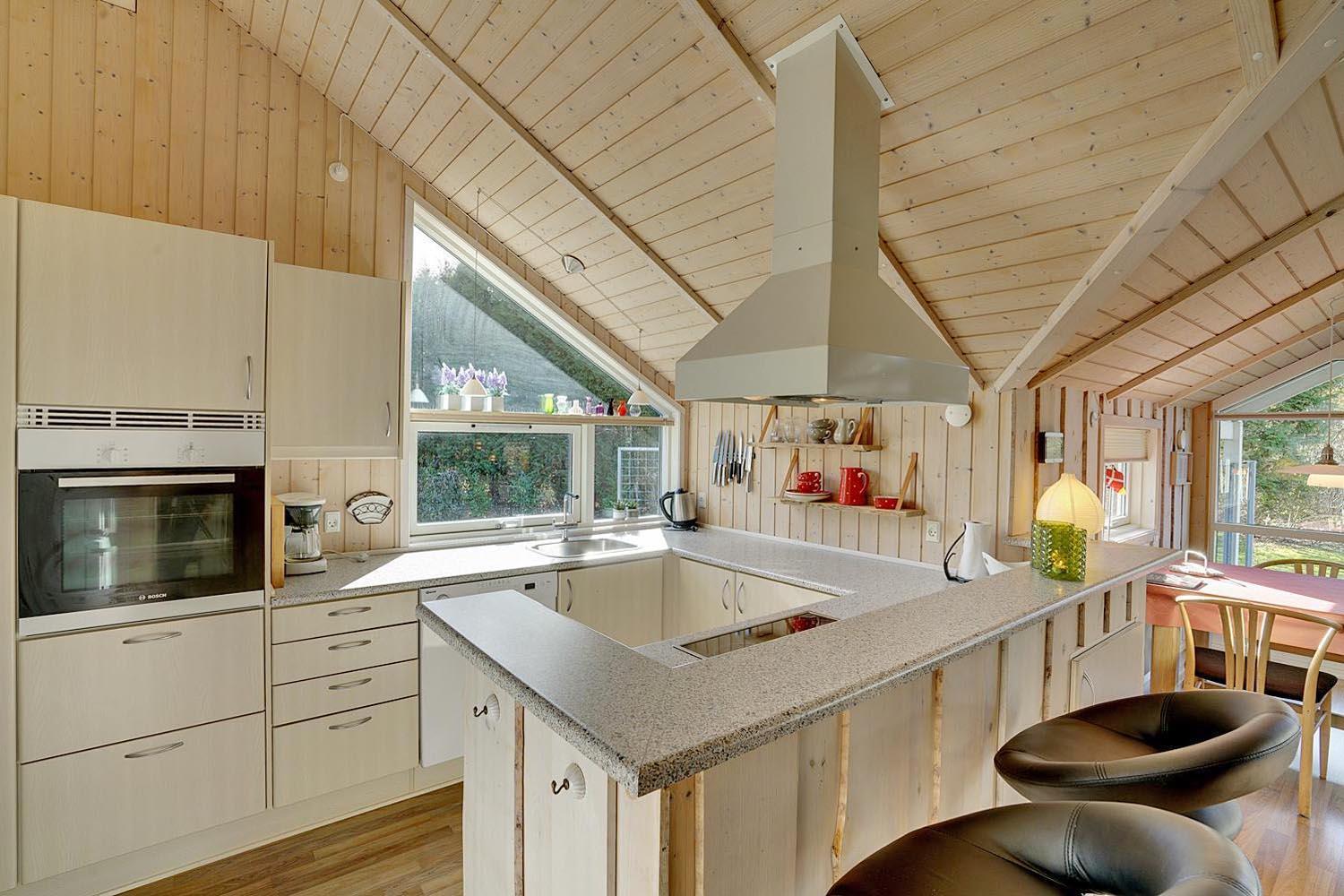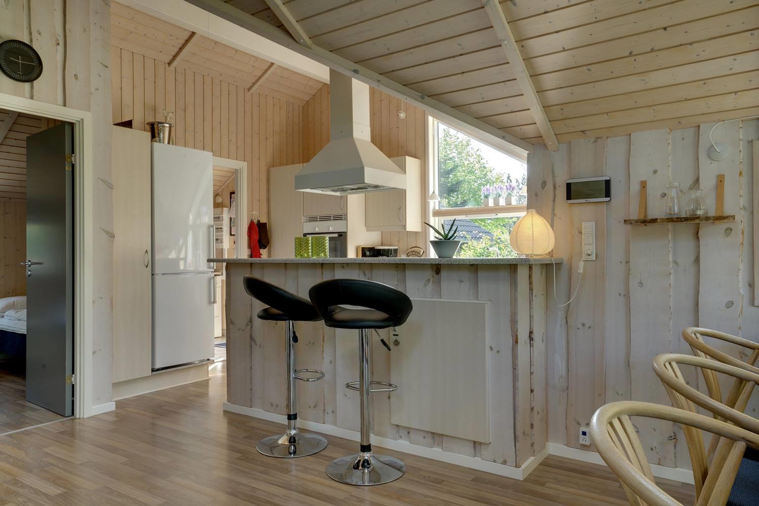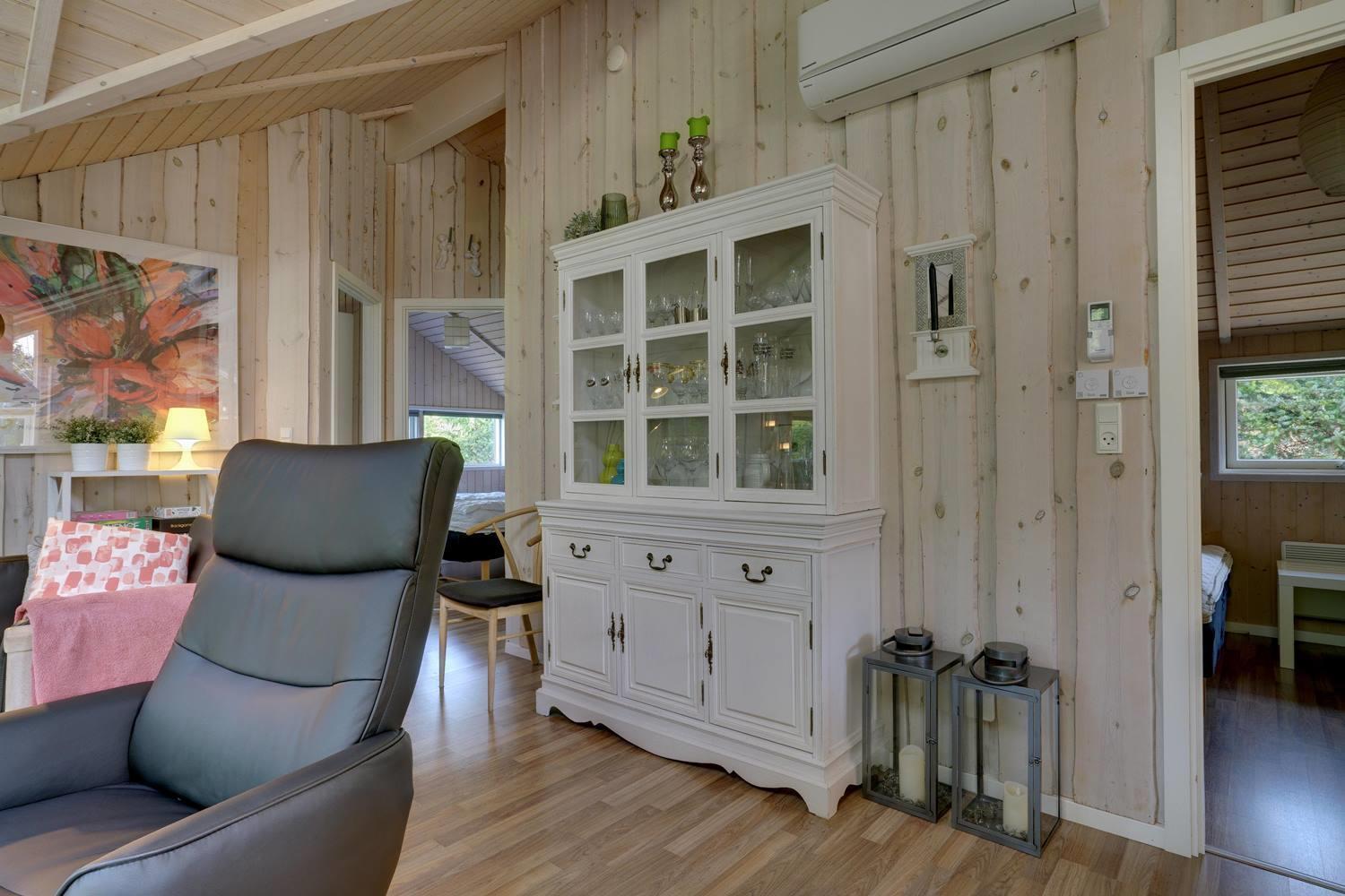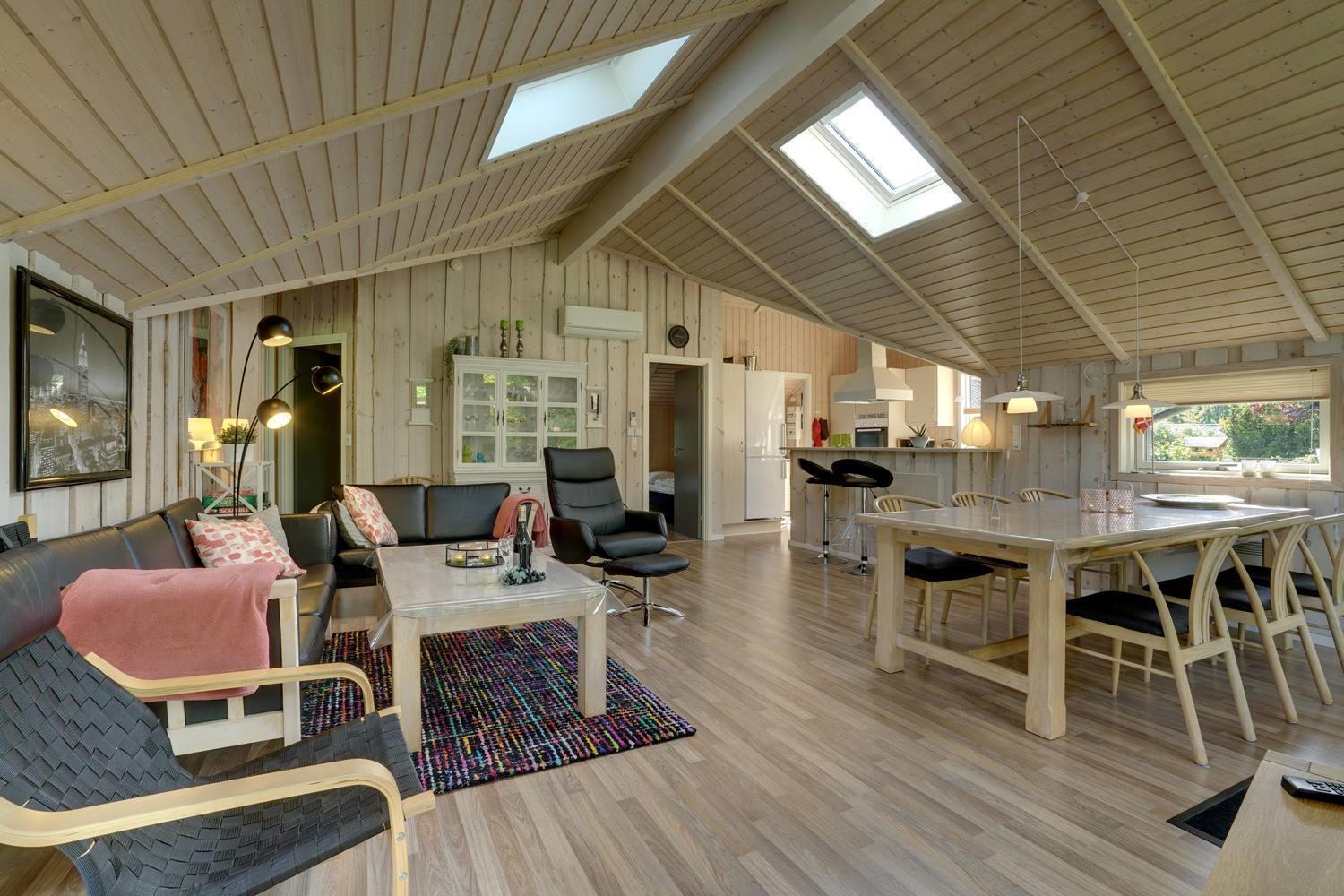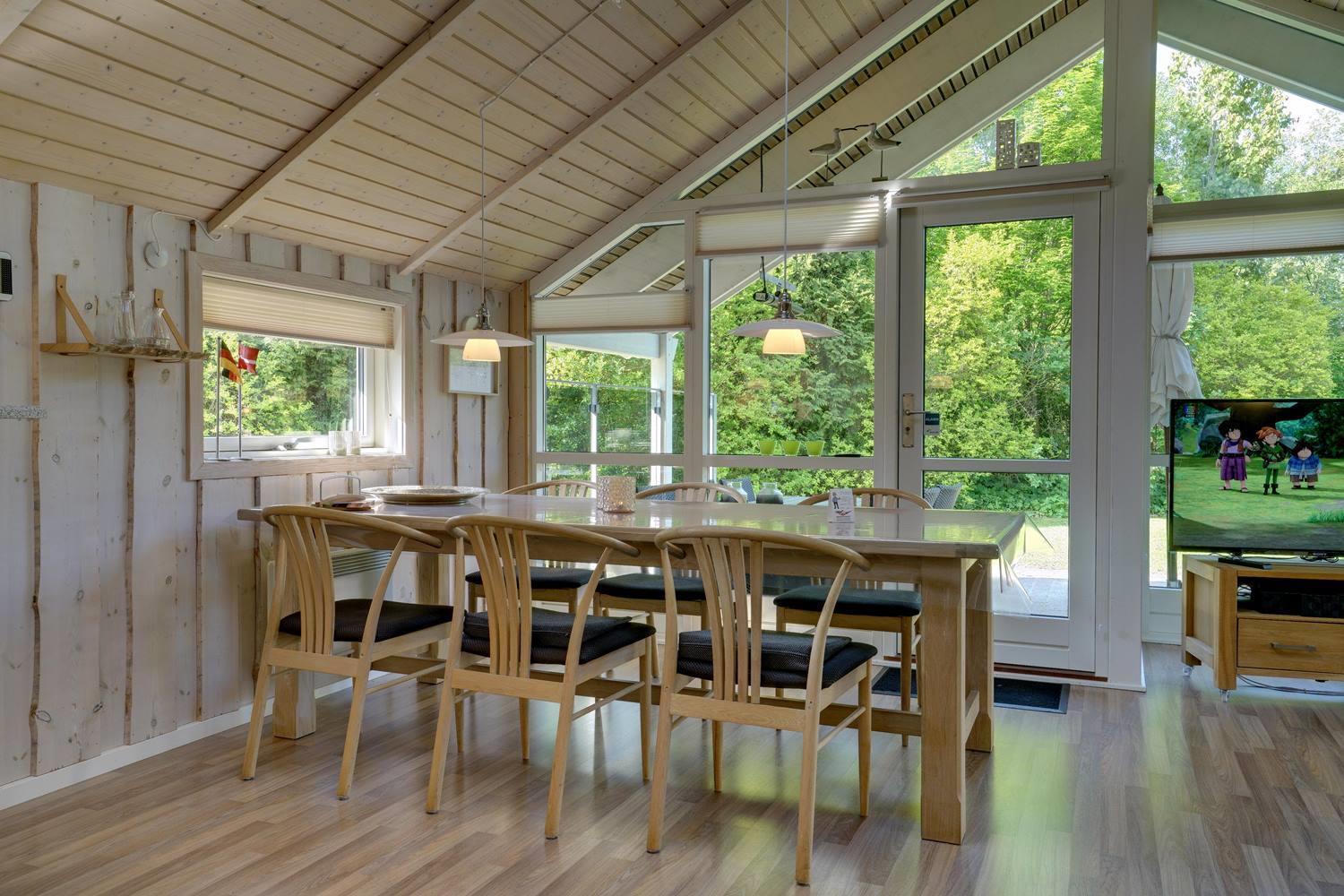 Køkkenet er moderne med store vinduespartier og åbner op mod en hyggelig stue, hvor både TV, brændeovn og varmepumpe skaber en varm og indbydende atmosfære. I anneks er der et aktivitetsrum med blandt andet fodboldbord og dart, perfekt til familieunderholdning.