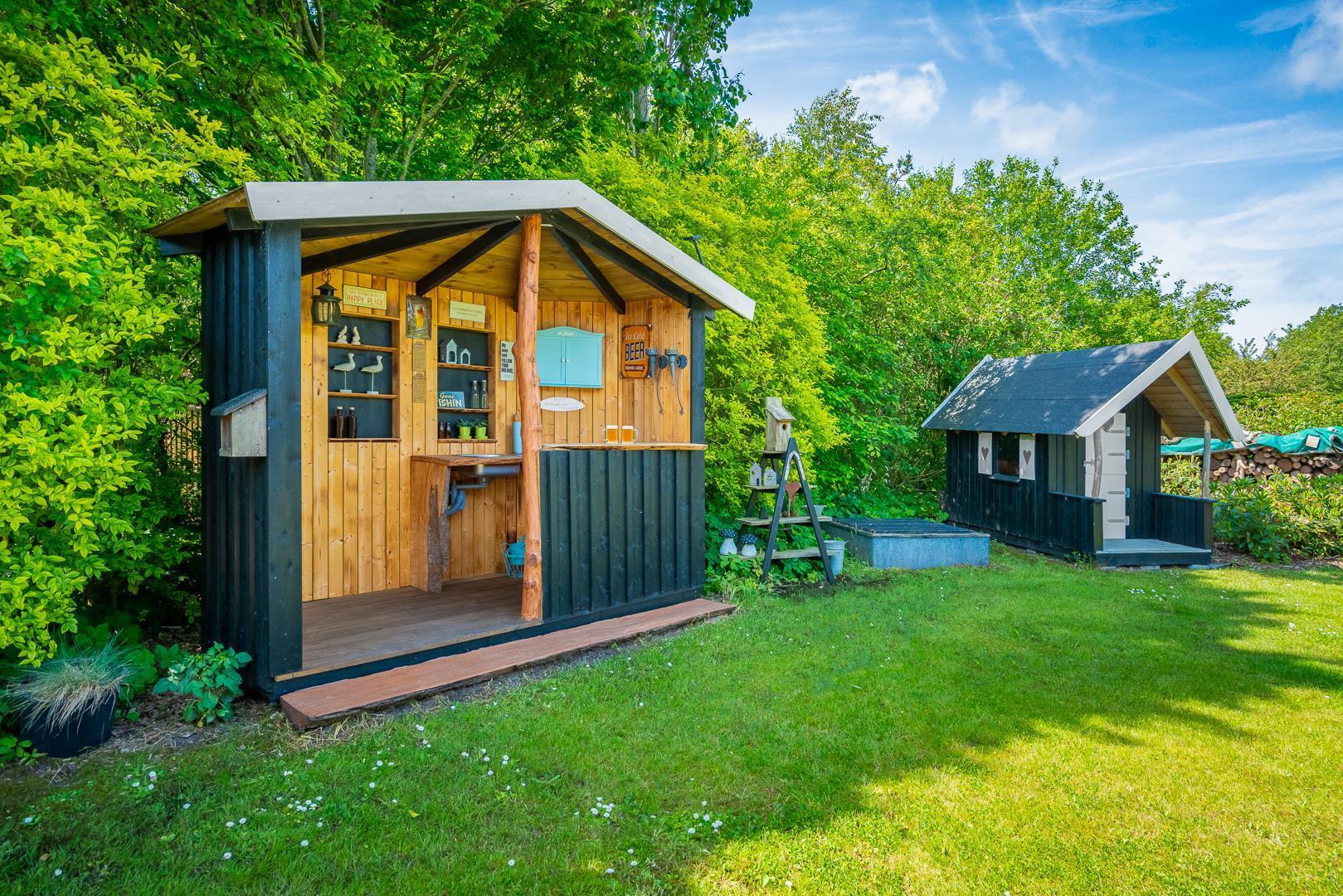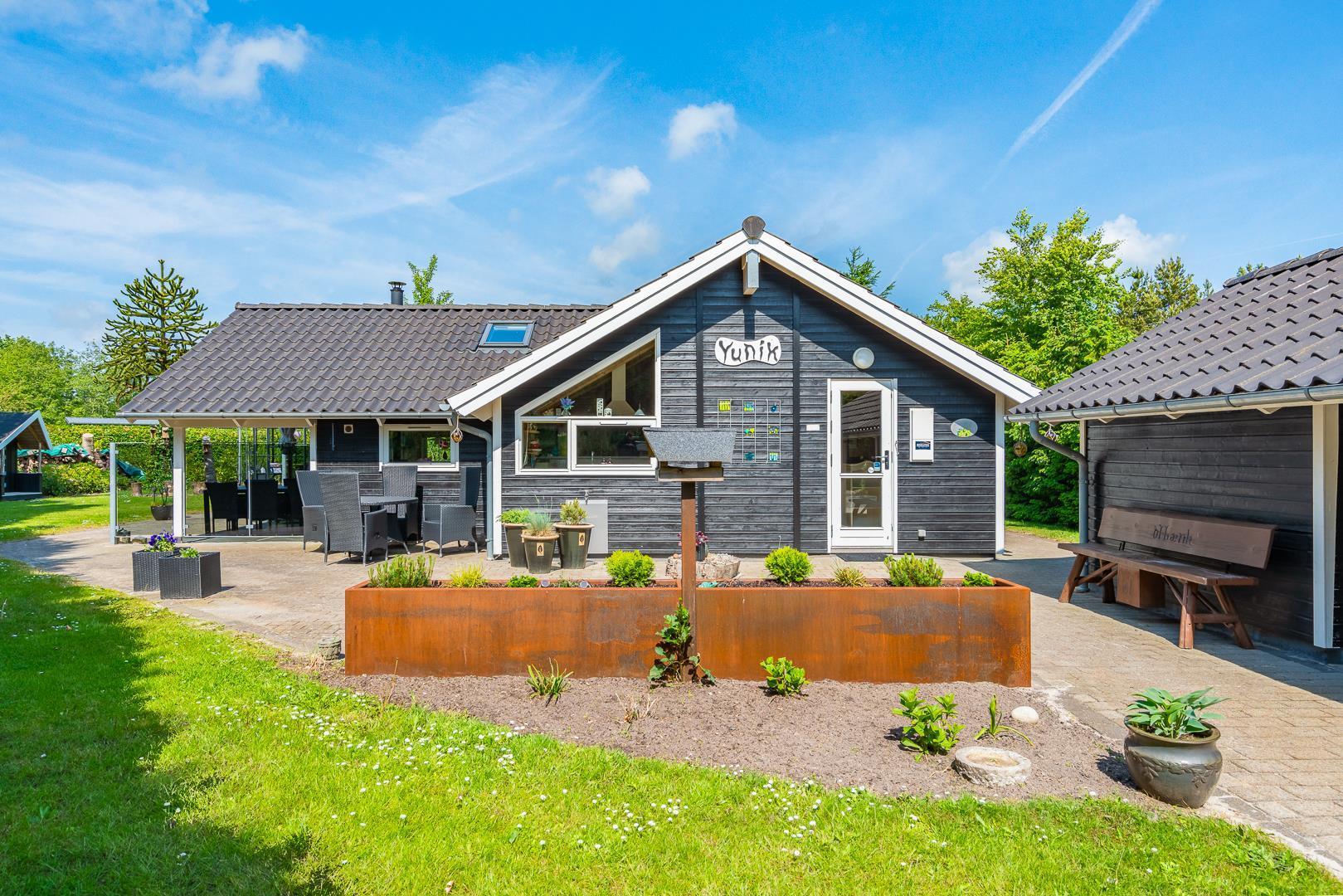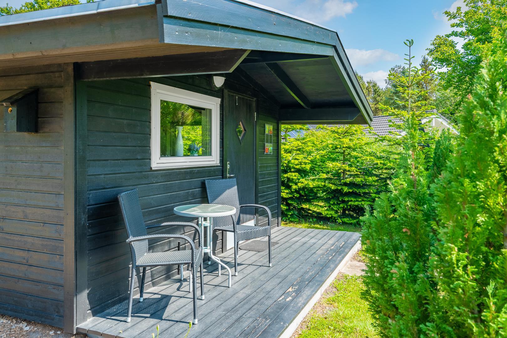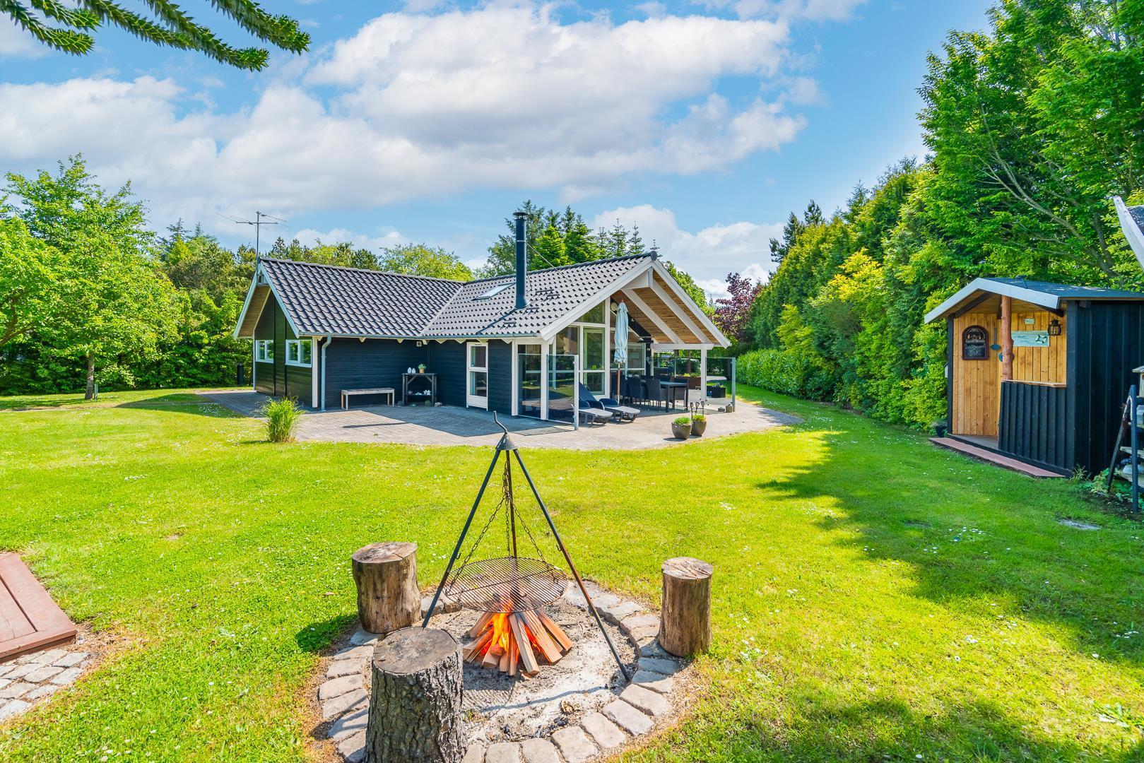 Udendørs kan gæsterne nyde den overdækkede terrasse med bålsted og elektrisk terrassevarmer, gynge og sandkasse til børnene samt gode lækroge, der indbyder til afslapning og hyggelige stunder sammen.