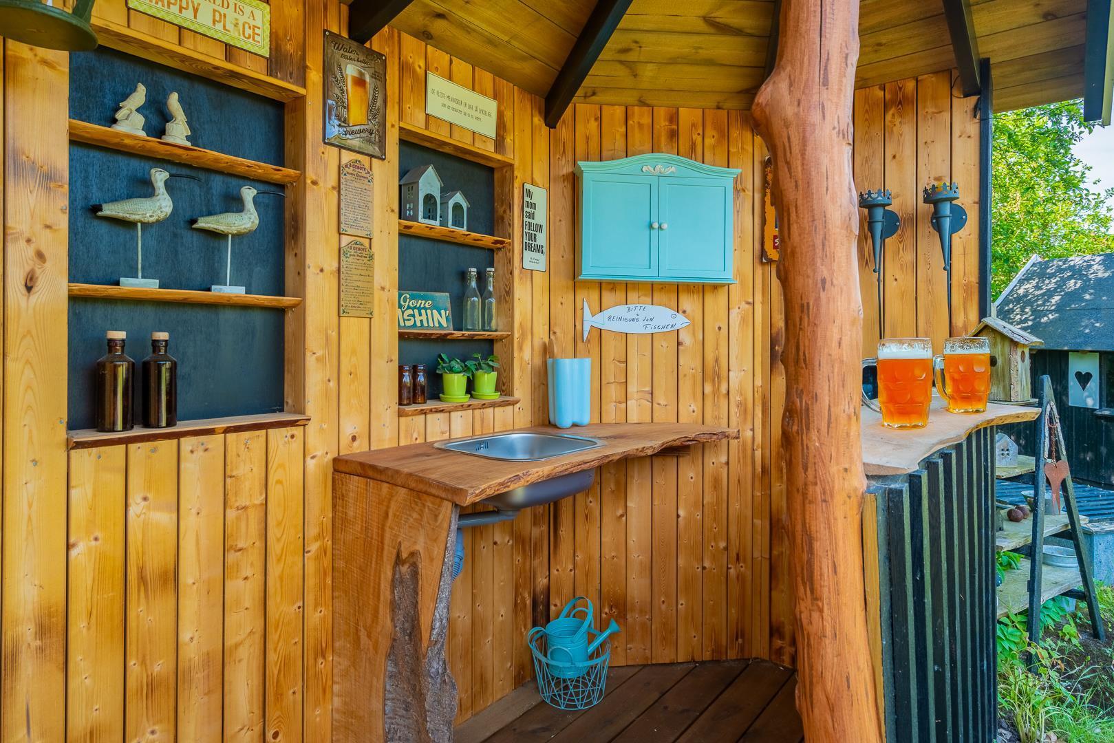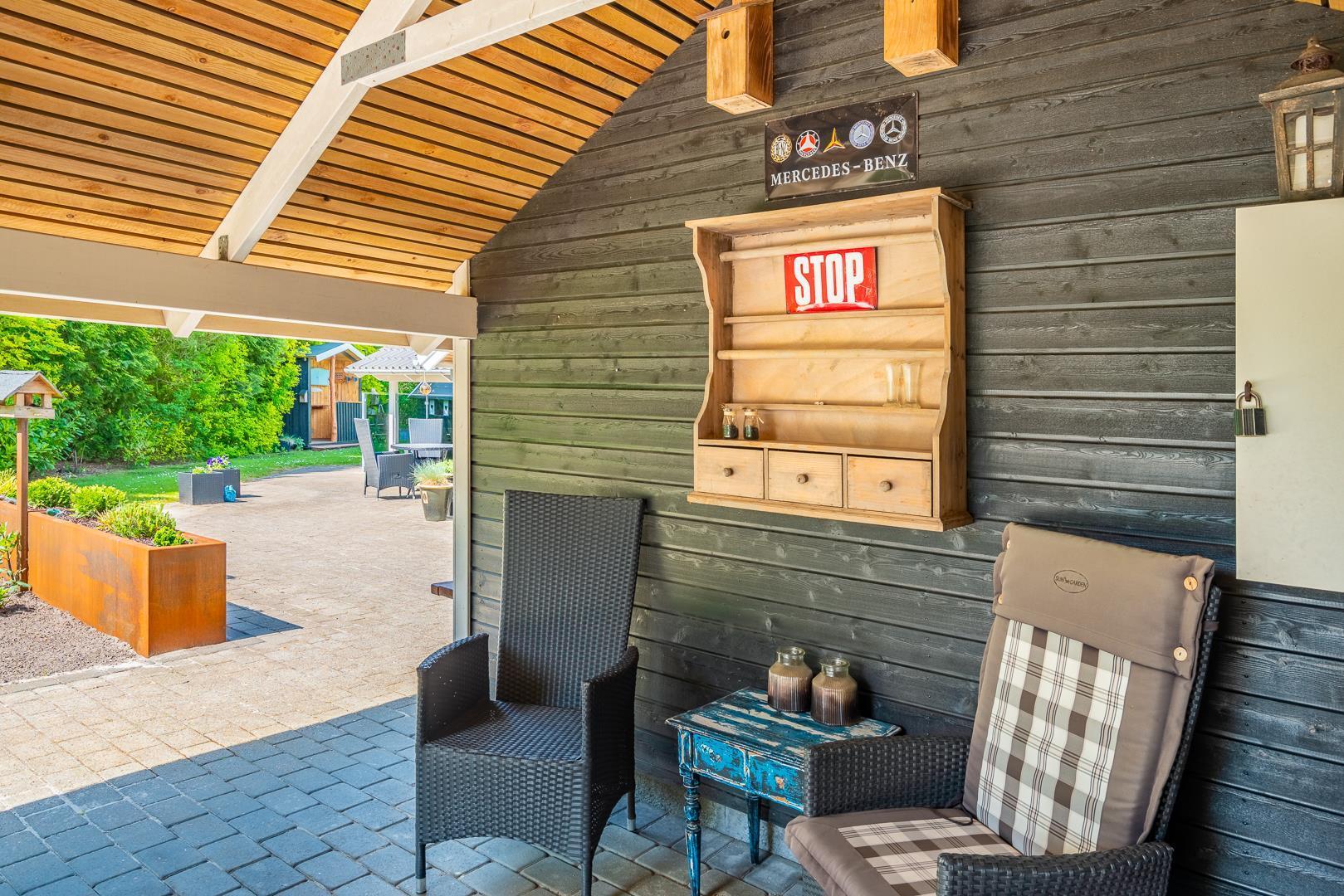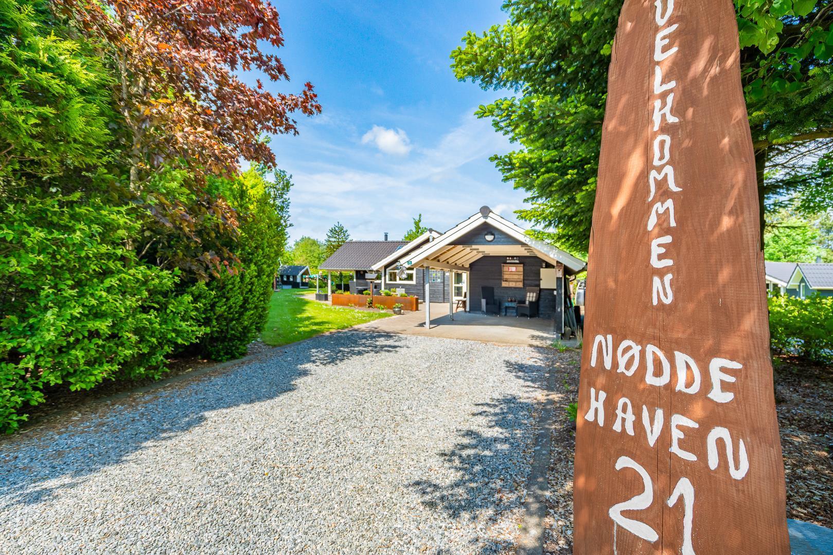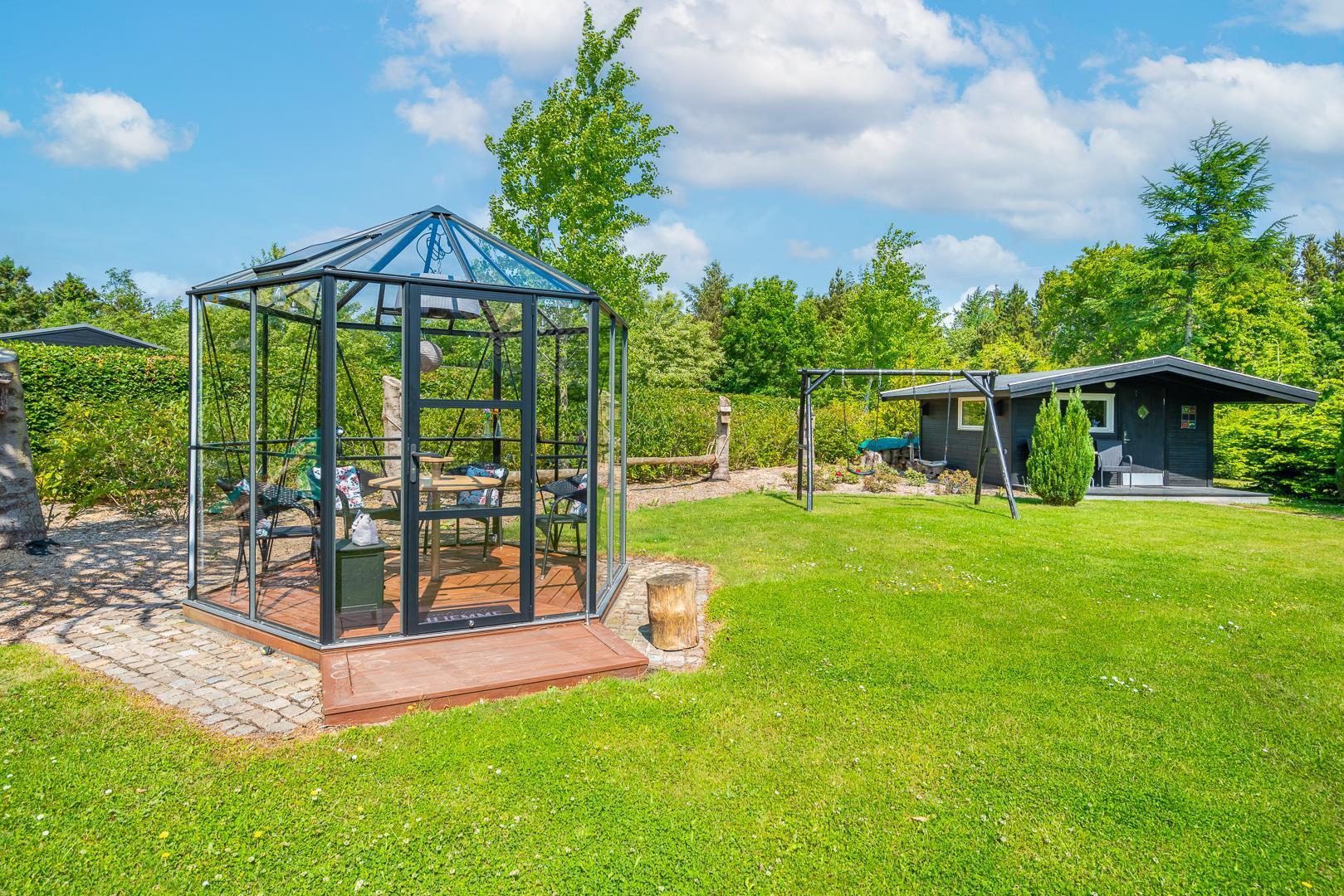 Udendørs kan gæsterne nyde den overdækkede terrasse med bålsted og elektrisk terrassevarmer, gynge og sandkasse til børnene samt gode lækroge, der indbyder til afslapning og hyggelige stunder sammen.