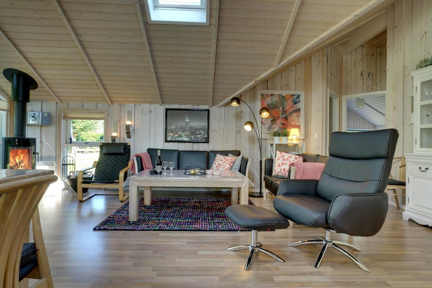 Hyggeligt feriehus i Jegum Ferieland med aktivitetsrum, brændeovn og stor terrasse med bålsted.