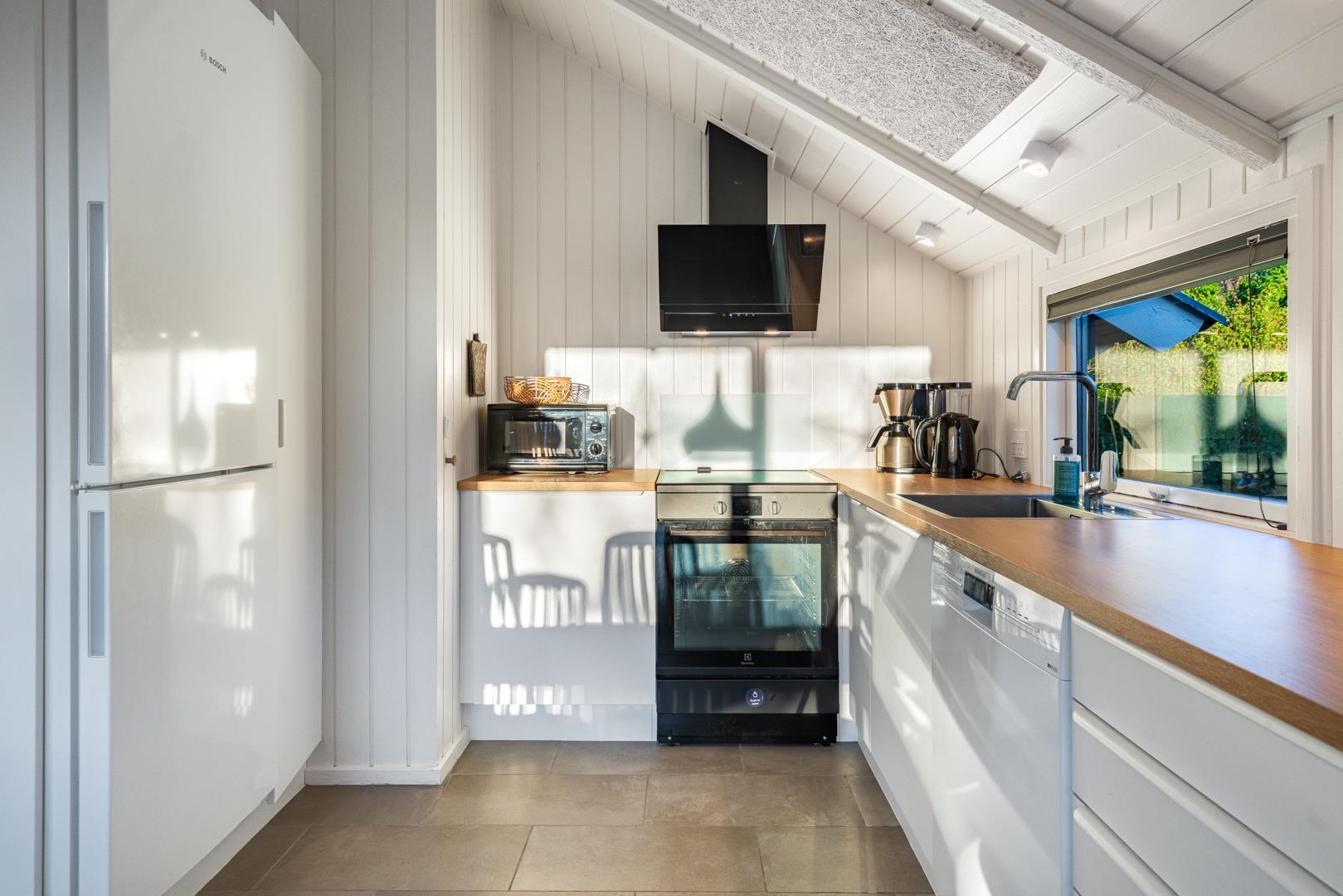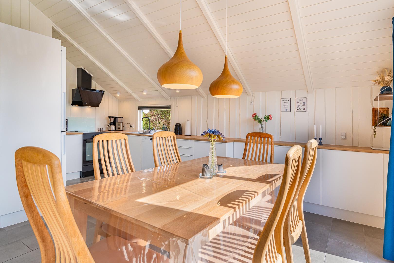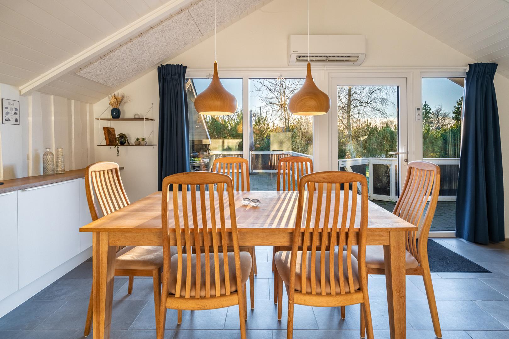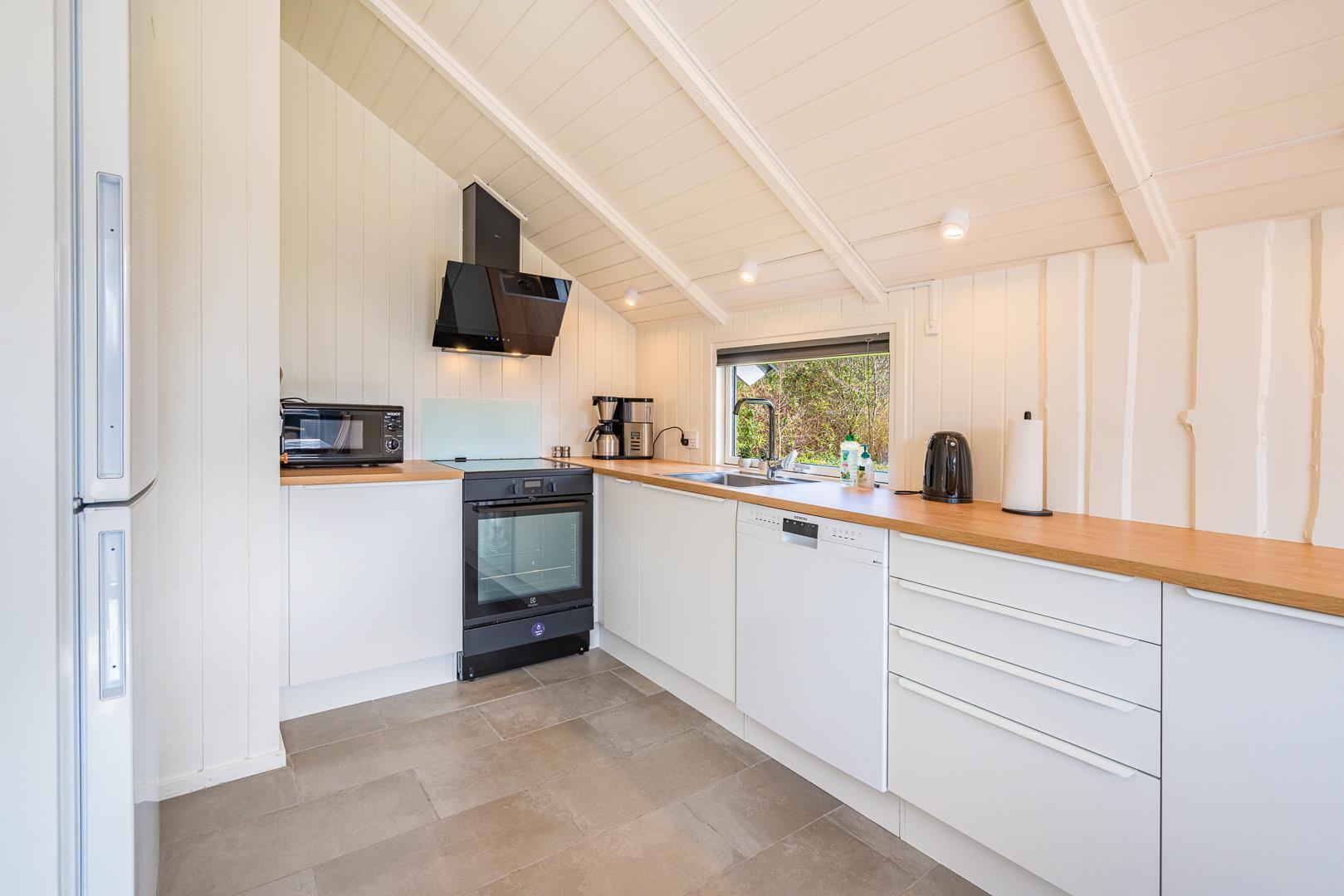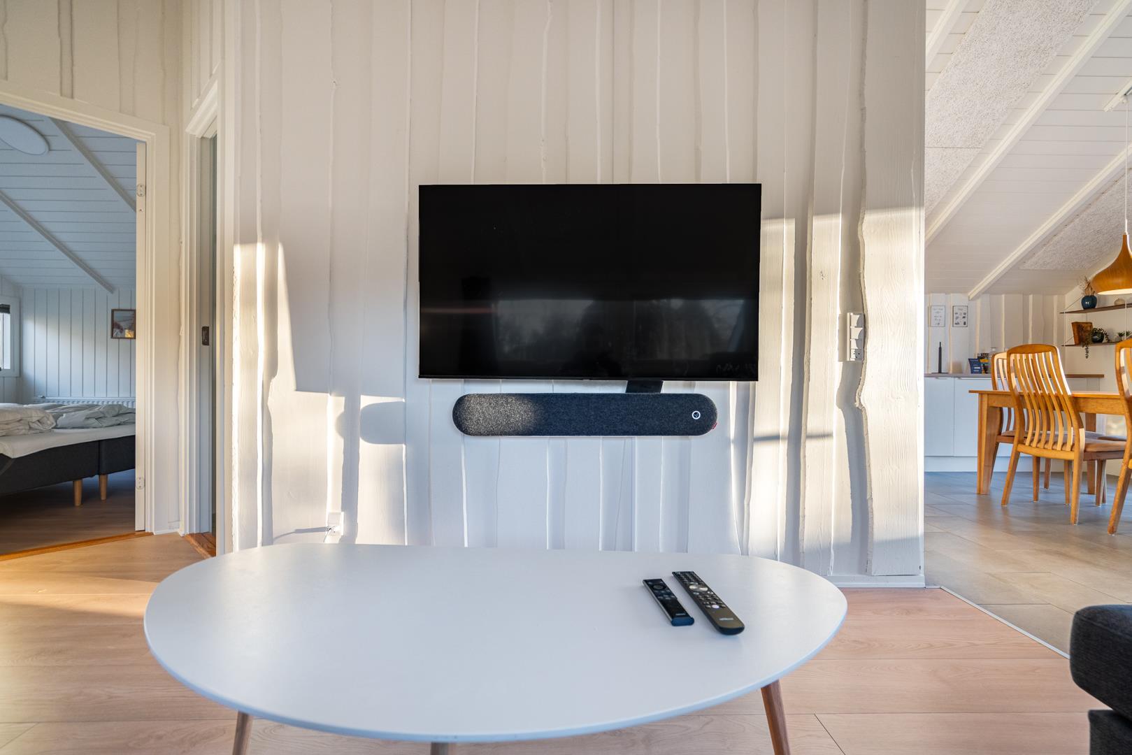 Efter en dag i den friske luft kan I slænge jer i sofaen, se en film via Chromecast eller bare nyde stilheden. En varmepumpe sørger for et behageligt indeklima. Det moderne køkken er godt udstyret med alt, hvad I behøver – herunder en opvaskemaskine. Ved siden af indbyder det store spisebord til fælles måltider og hyggelige aftener.