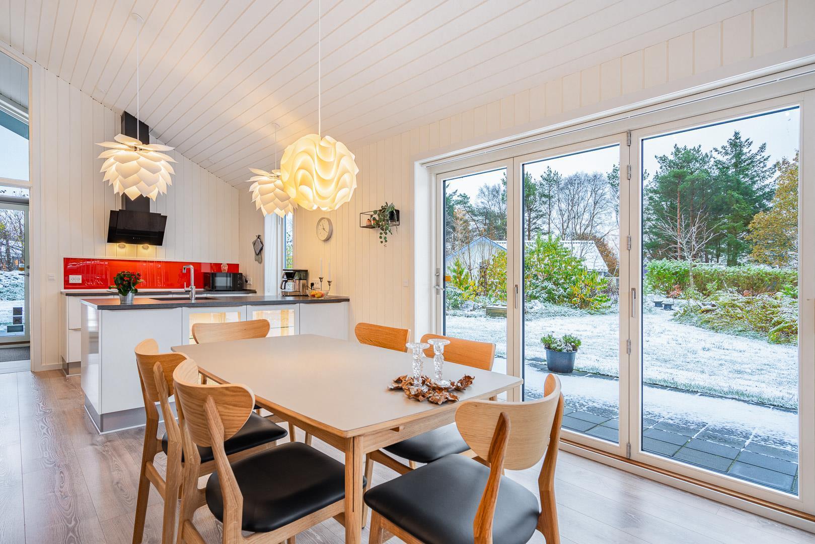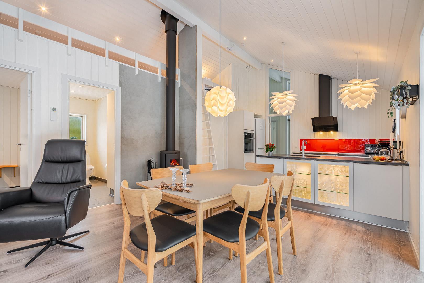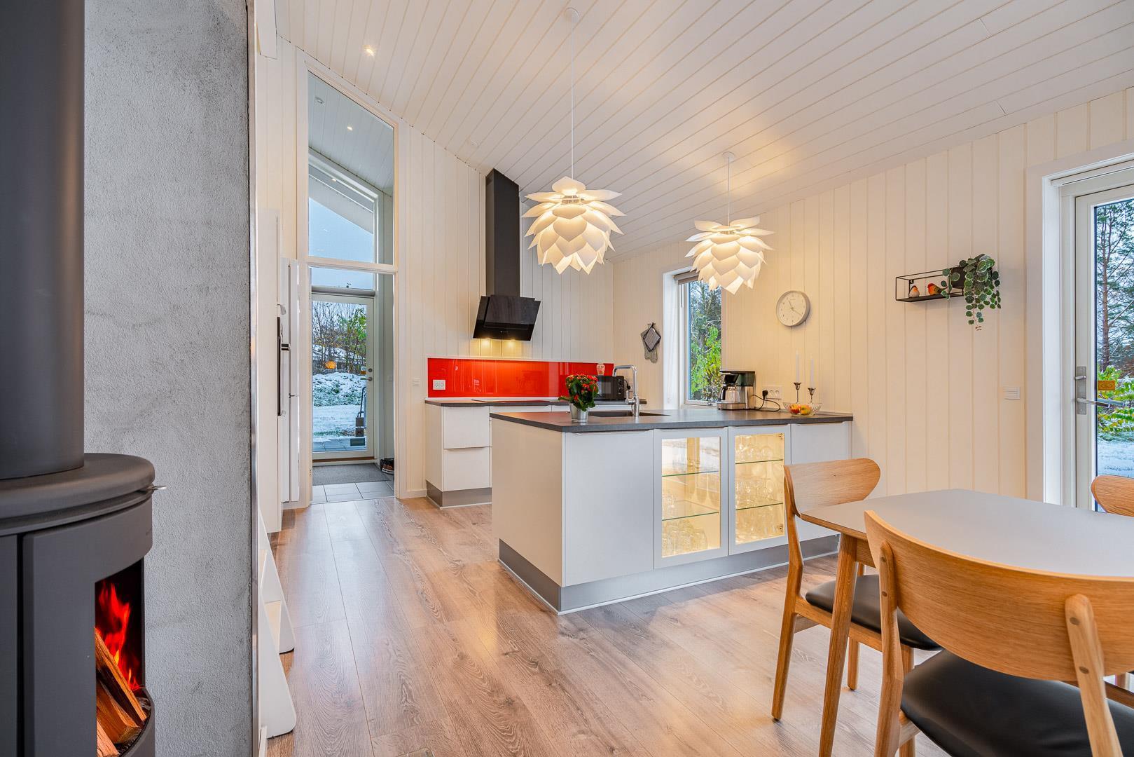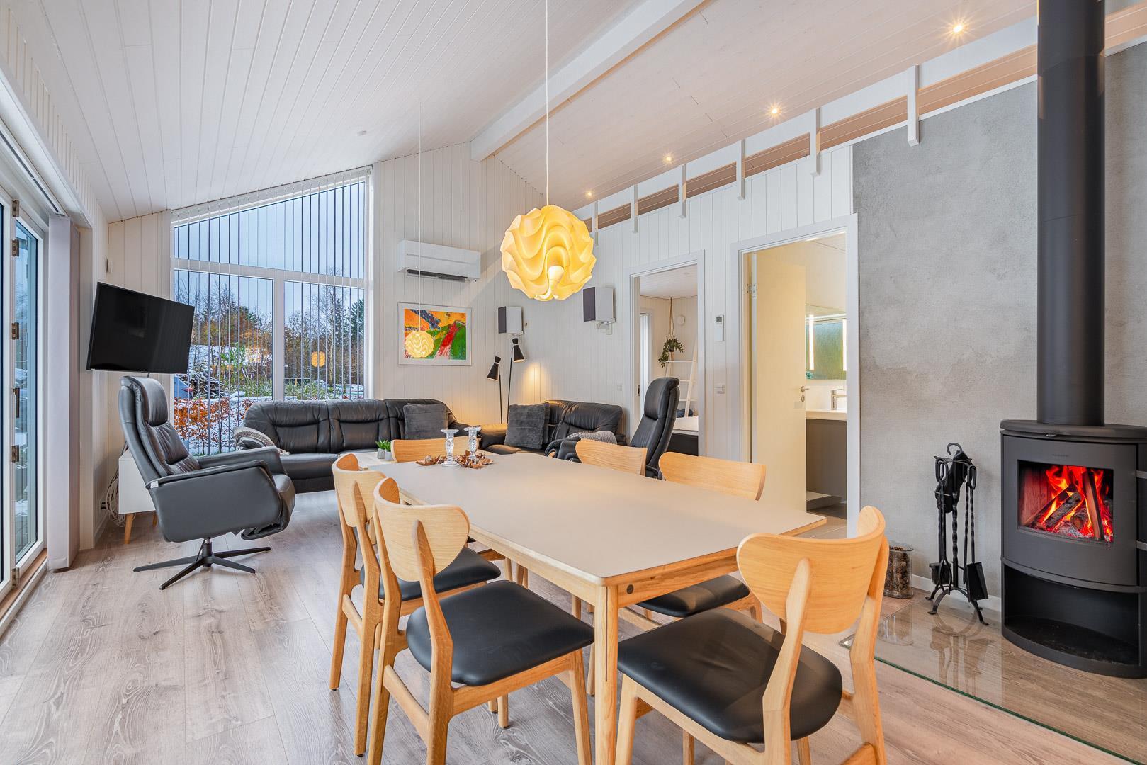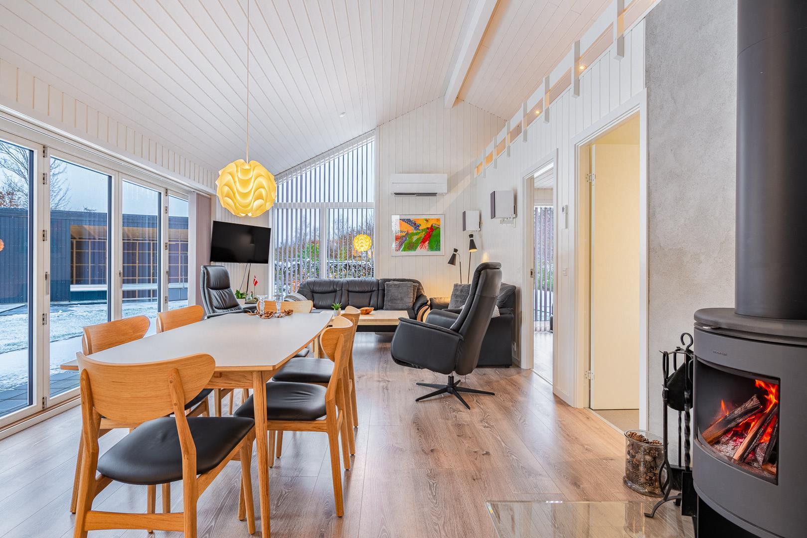 Den åbne stue med brændeovn skaber en hyggelig ramme om aftenerne – perfekt efter en frisk gåtur ved havet eller en dag i naturen. En moderne varmepumpe sørger for et behageligt indeklima uanset årstid, og de store vinduer lukker lyset ind og giver en dejlig kontakt til naturen udenfor.