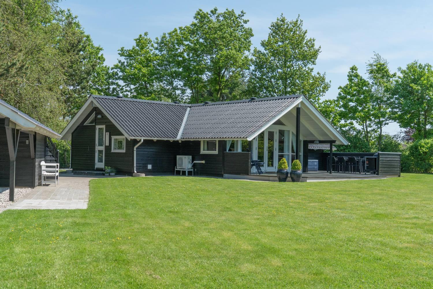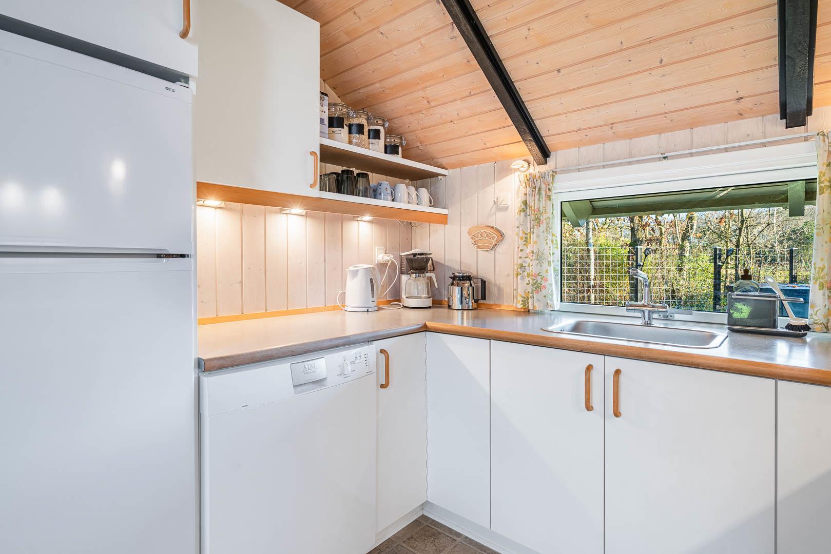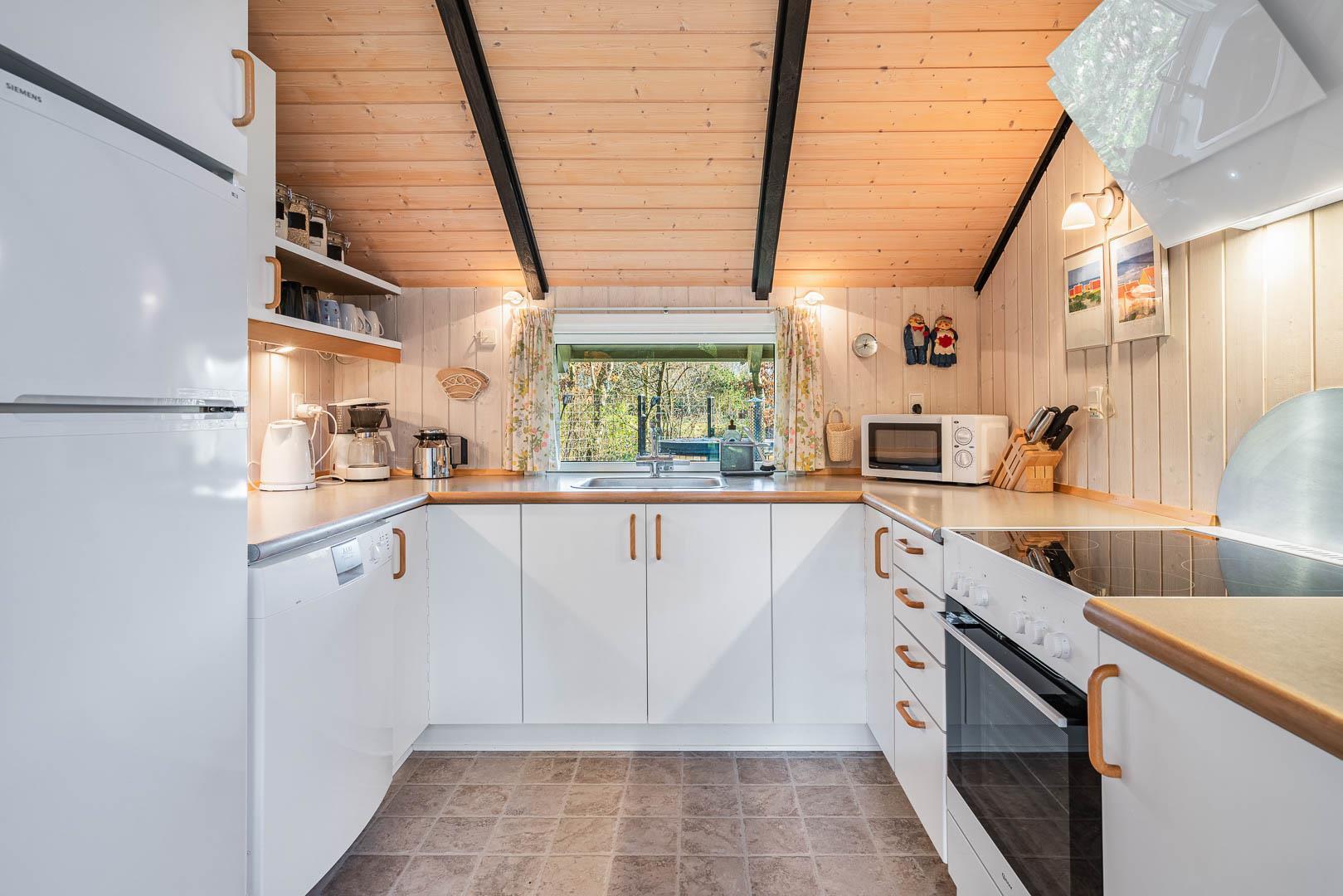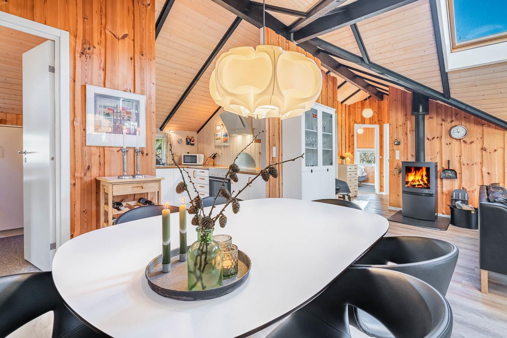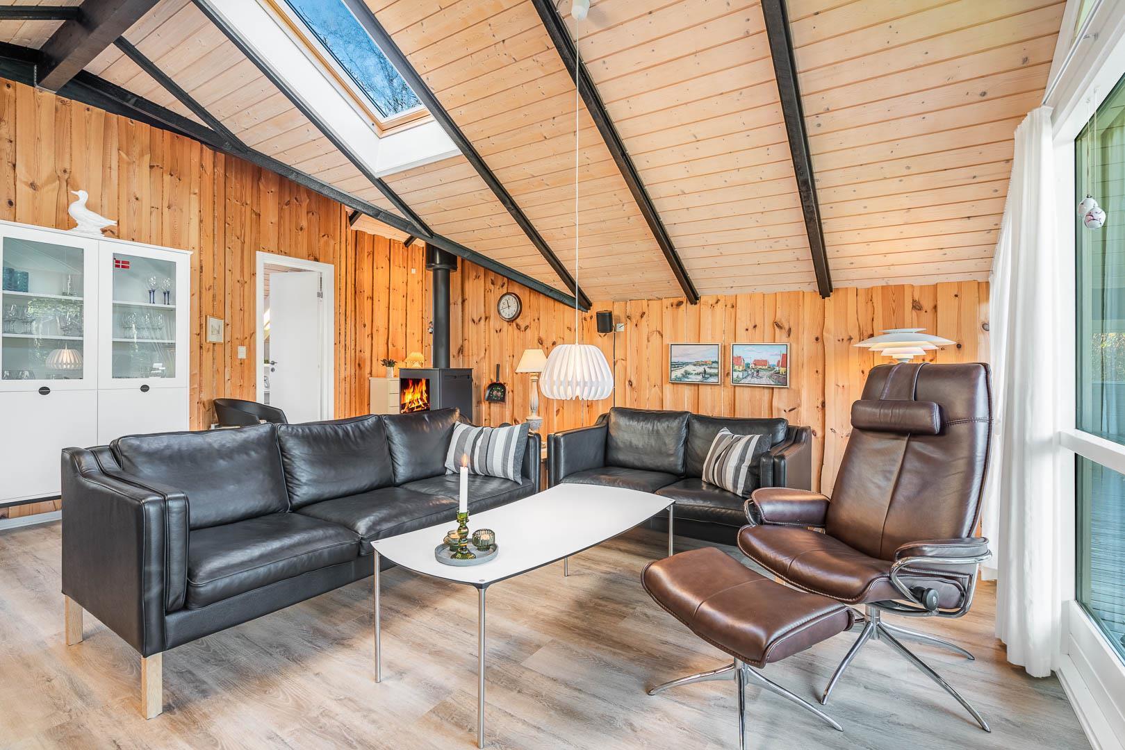 På en skøn grund, med masser af grøn beplantning, der afskærmer og giver både læ og giver en uforstyrret grund, finder I dette meget personlige og velplejede feriehus. Her er stor græsplæne med gynger, sandkasse og fodboldmål, for de gæster der ønsker at benytte mulighederne for bolspil og leg. 3 soverum med dobbeltsenge. Køkken med opvaskemaskine og mikroovn i forbindelse med spiseplads og en hyggelig stue, hvor brændeovn eller varmepumpe kan være varmekilderne på kolde dage. Badeværelse med spa og sauna, samt et gæstetoilet. I entreen adgang til bryggers, hvor du finder du vaskemaskine og tørretumbler samt opbevaringsplads.