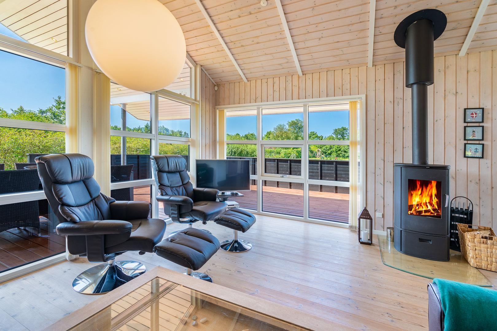 Sommerhuset kombinerer hygge, komfort og funktionalitet på bedste vis. Den lyse stue indbyder til afslappende timer foran brændeovnen, og med både Chromecast, varmepumpe og spillekonsol er der underholdning for både børn og voksne – uanset årstid.