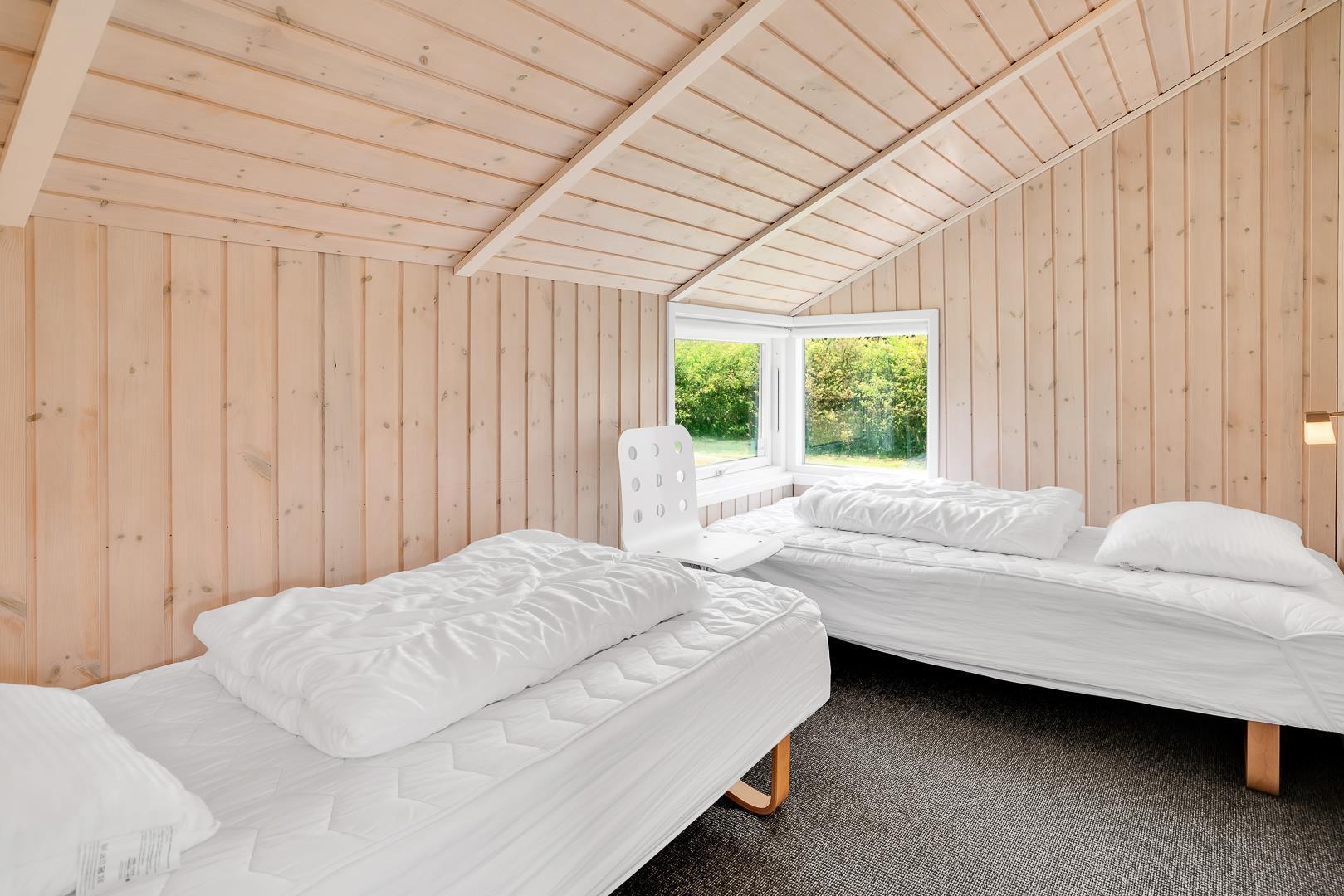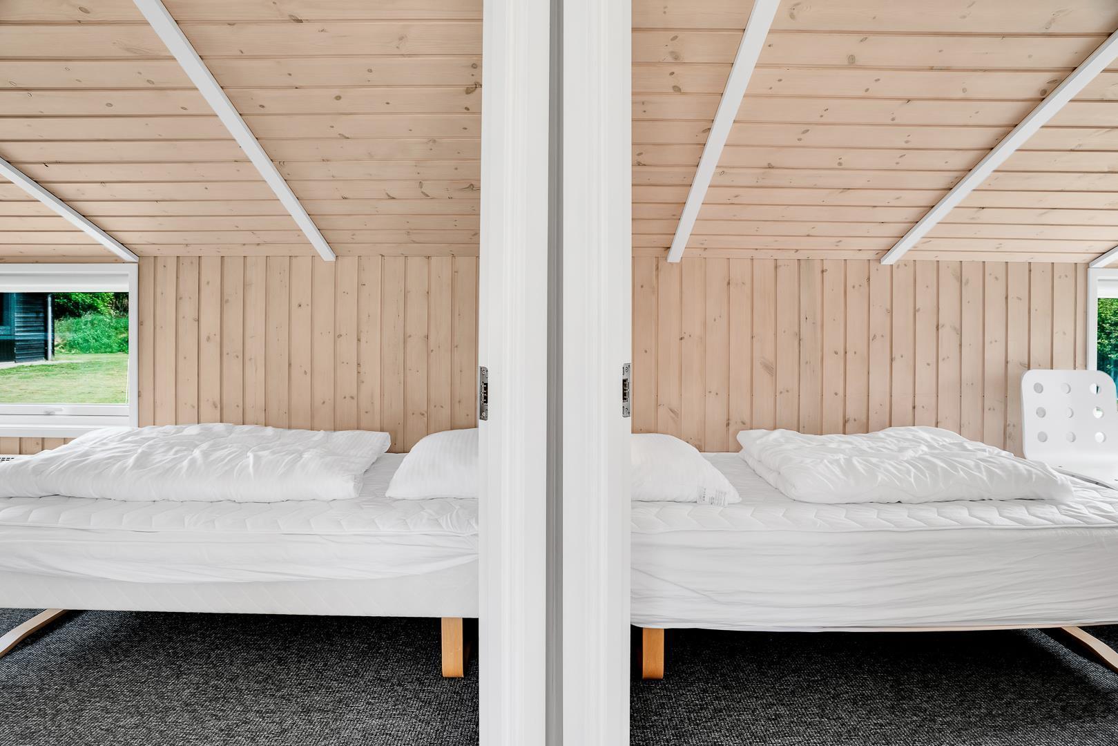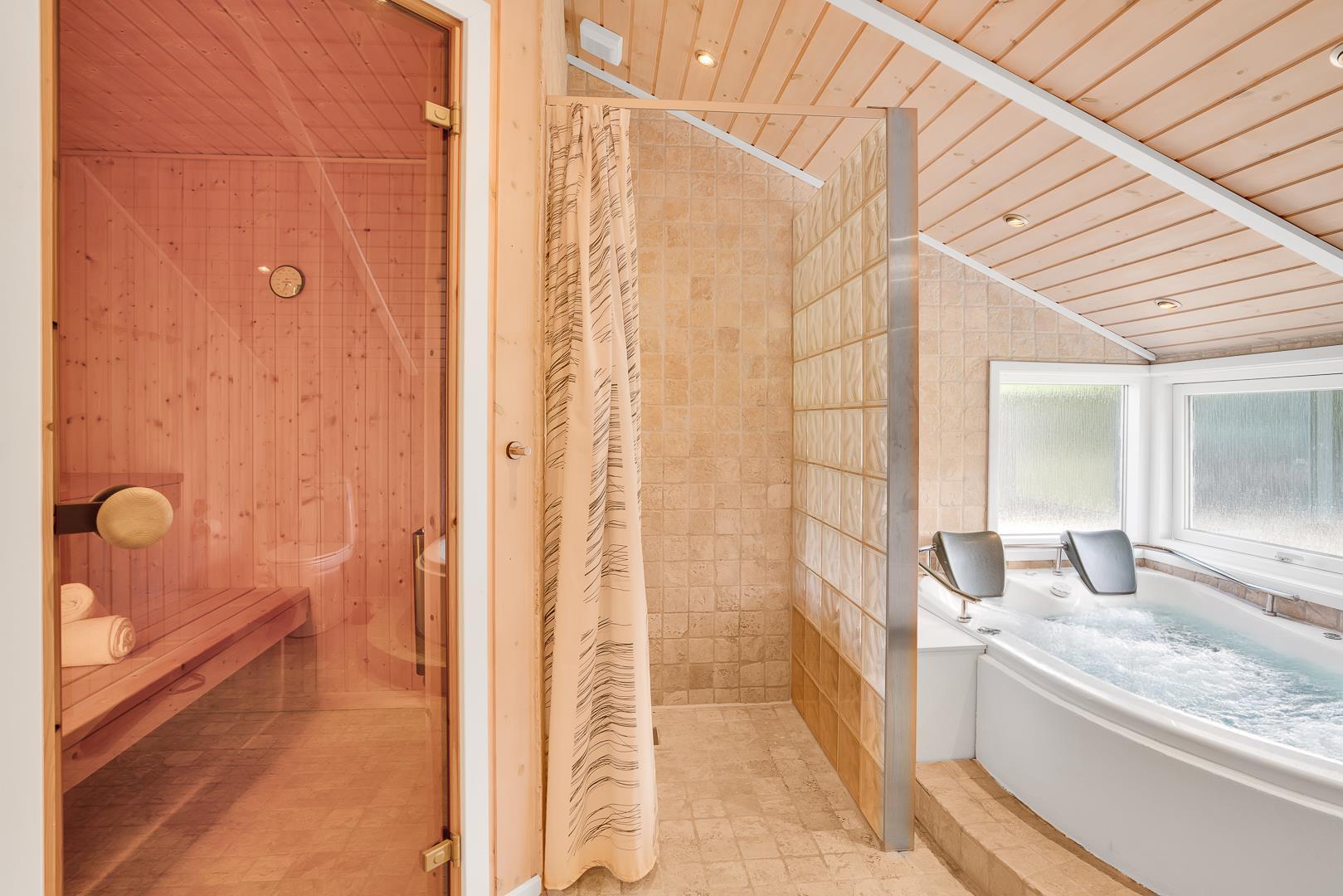 Sommerhuset har tre gode soveværelser – to med dobbeltsenge og ét med to enkeltsenge – og to flotte badeværelser med bruser og gulvvarme. I det ene badeværelse finder I både spa og sauna, så I kan nyde ægte wellness efter en aktiv dag i naturen.