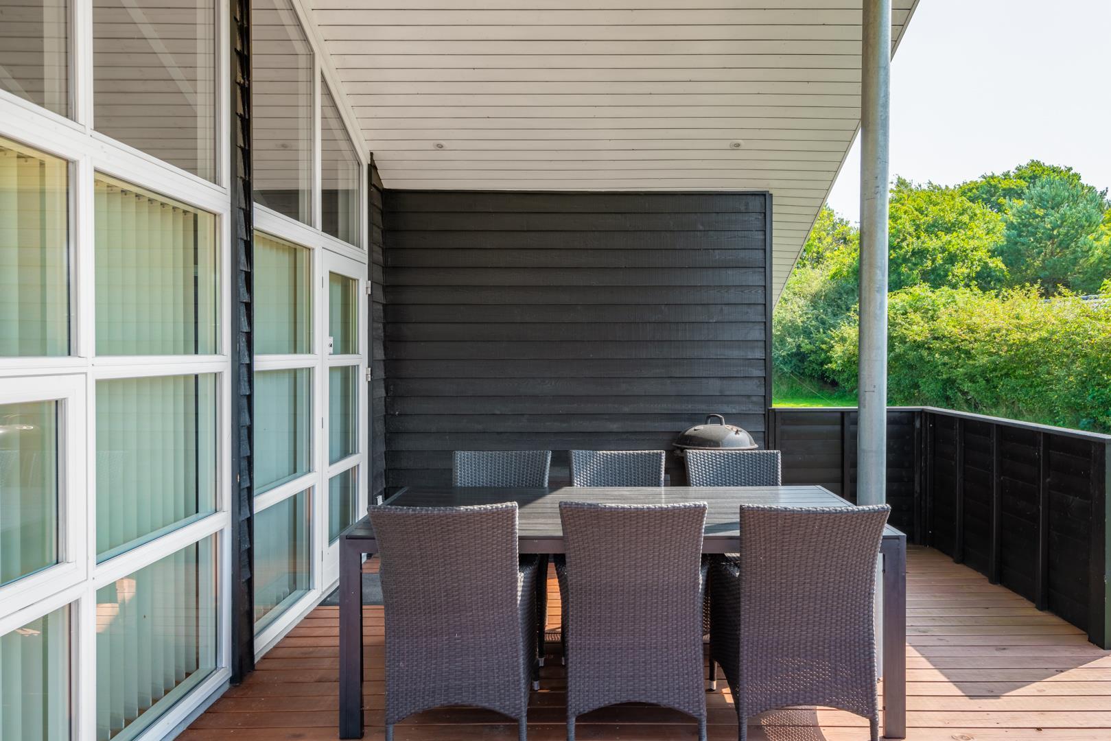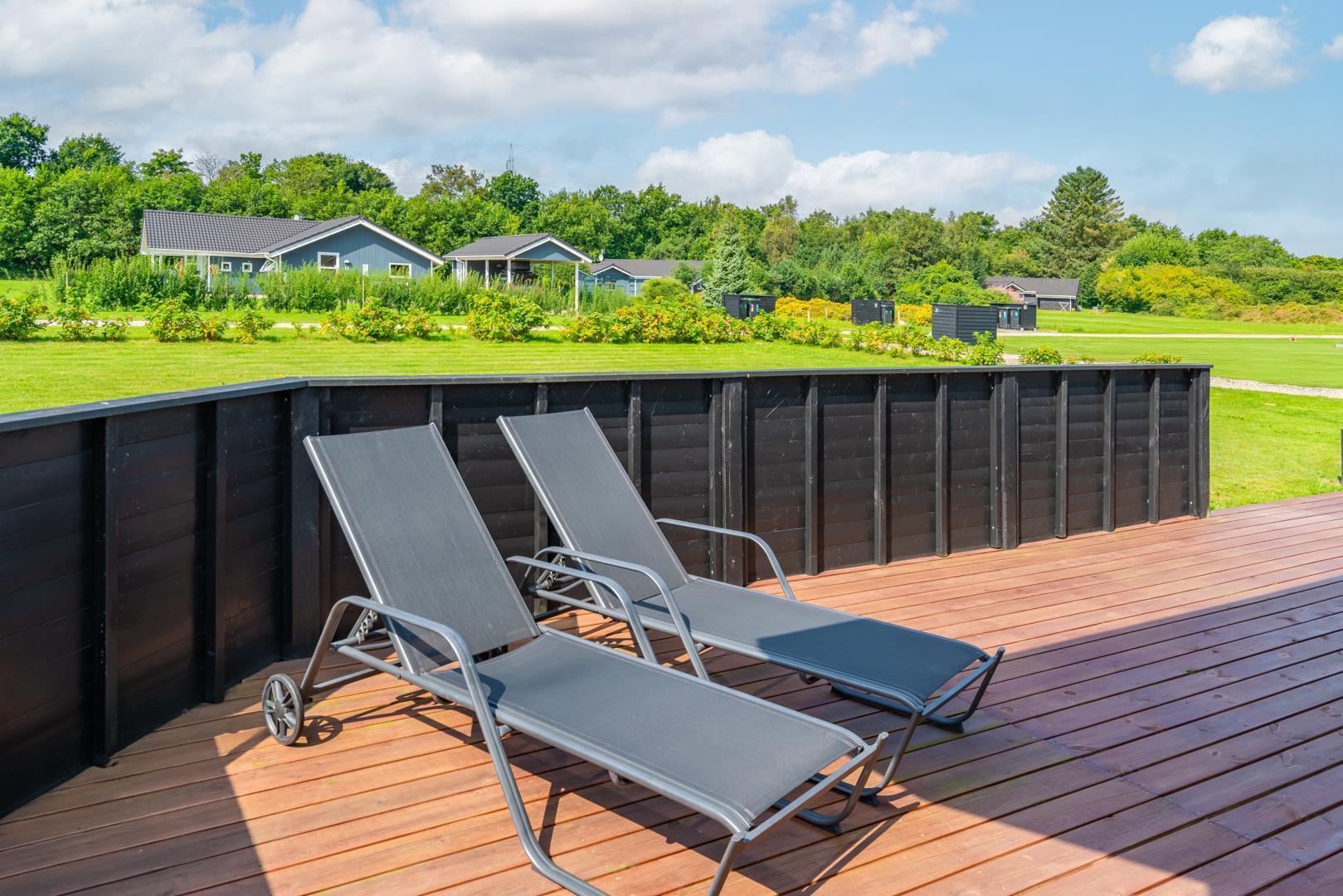 Udenfor kan I nyde den friske luft på den store, delvist overdækkede terrasse – perfekt til morgenkaffe i solen eller hyggelige aftener, selv hvis vejret skulle skifte.