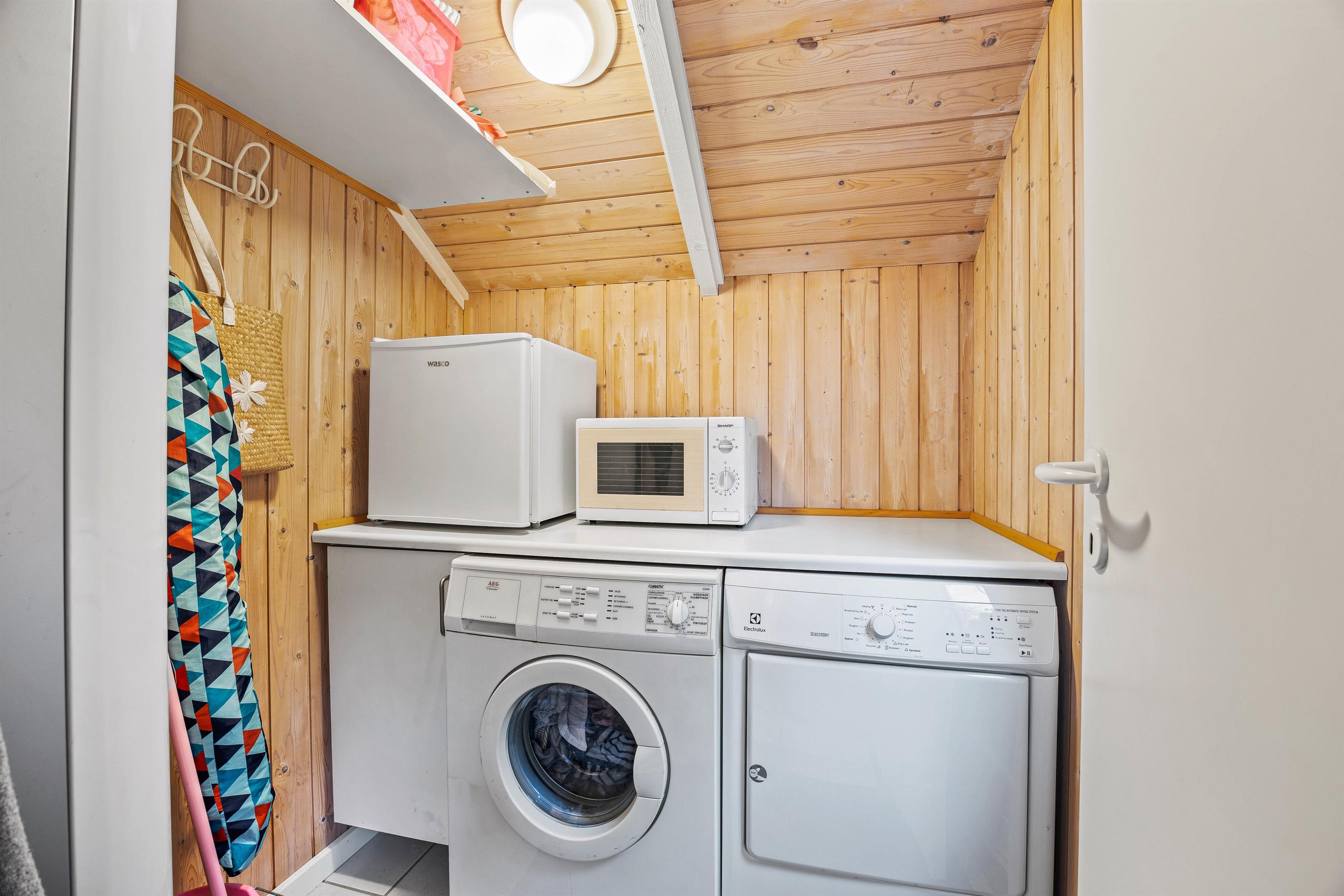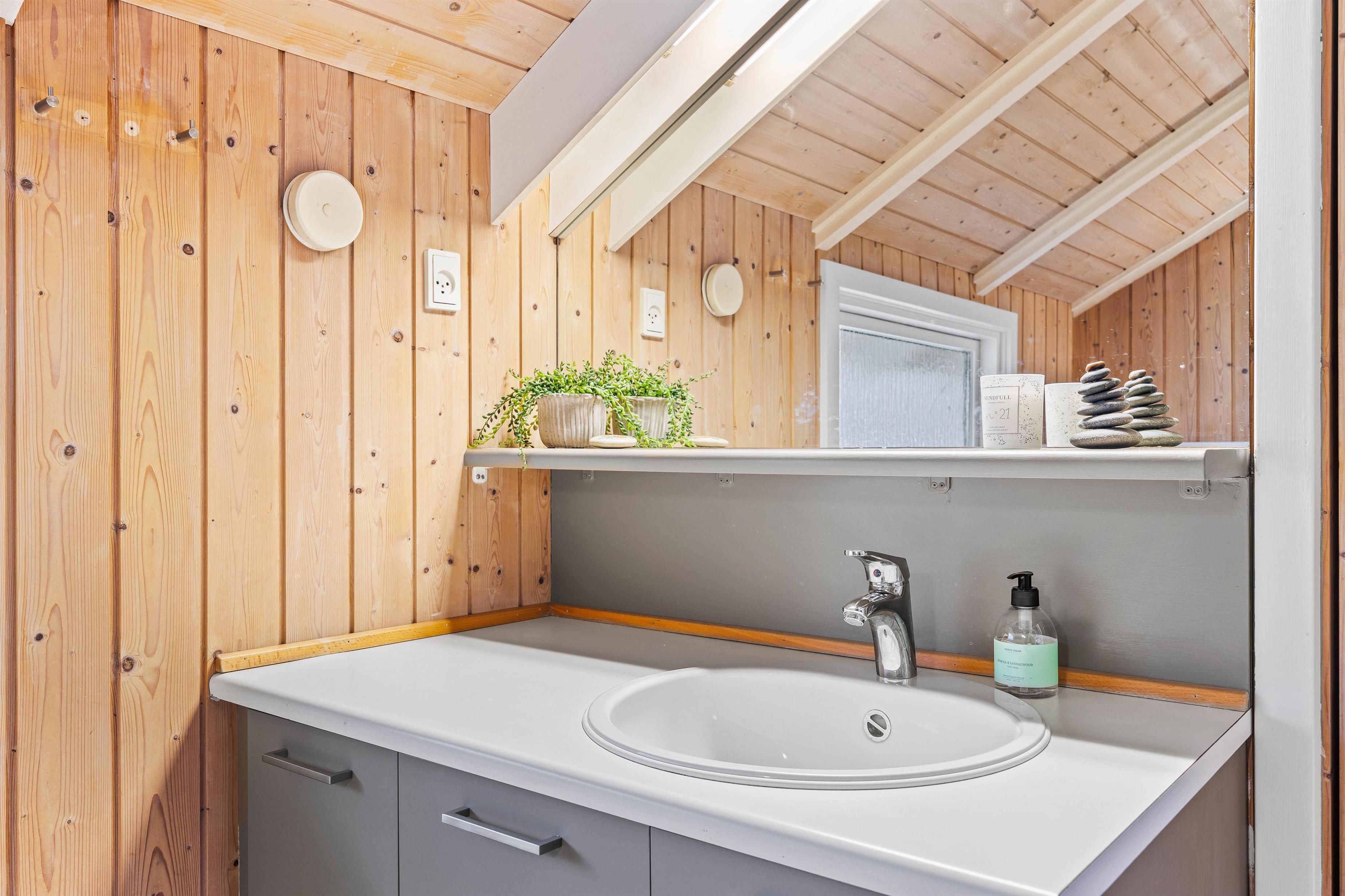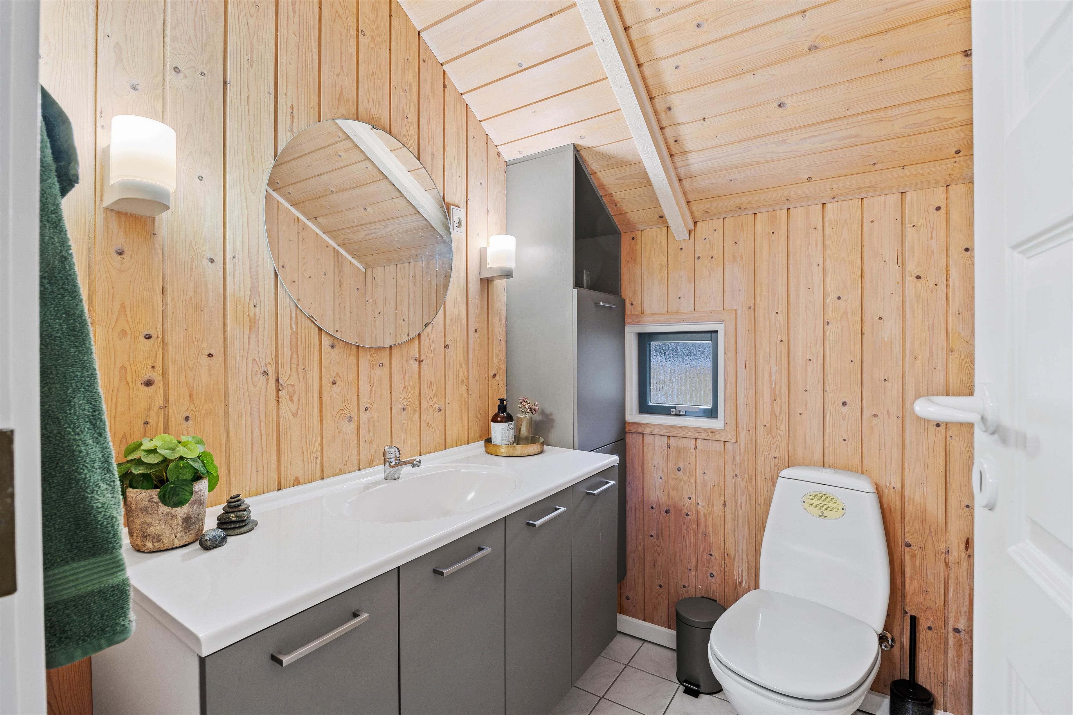 I badeværelset finder I en skøn tømmespa, perfekt til afslapning. Derudover er der også et praktisk gæstetoilet til rådighed. Dertil finder I også både vaskemaskine og tørretumbler i feriehuset, så I ikke skal bekymre jer om garderoben.