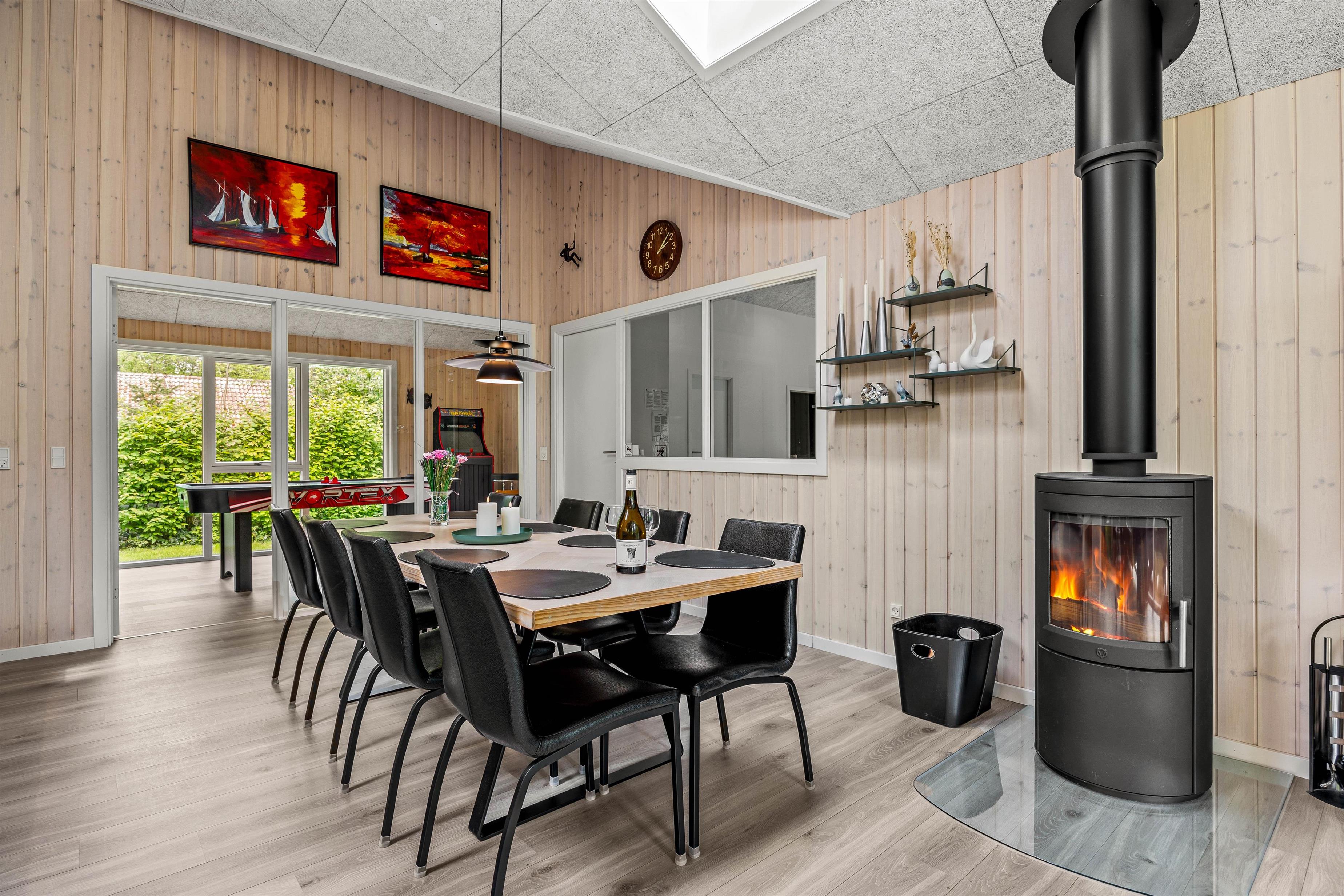 Sommerhuset på 161 m2 i Jegum Ferieland er ikke kun et sted at bo, men også et sted for leg og afslapning. Højdepunktet er poolrummet, der indeholder den 20 m2 store swimmingpool, et boblebad og den varme sauna. Her er der rig mulighed for afslapning, dykning og vandleg – et fantastisk sted uanset vejret. Aktivitetsrummet vil helt sikkert også blive nydt af alle feriegæster uanset alder, da her både er dart, airhockey og en arkademaskine. Her kan I spille om opvasken eller sætte ny high score.
