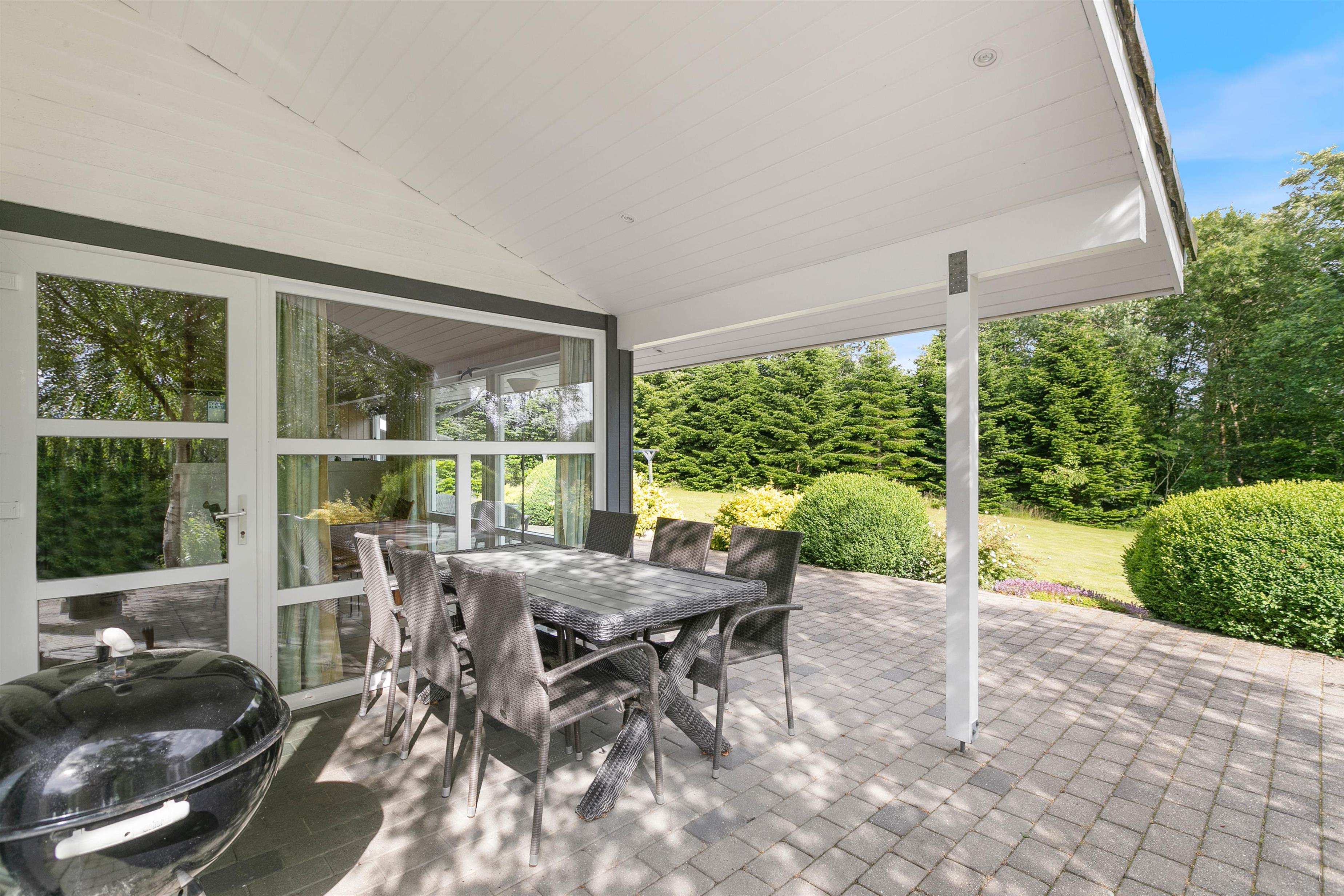 Den delvist overdækkede terrasse løber langs 2 sider af feriehuset. Læn jer tilbage i de komfortable havemøbler og nyd en friskbrygget kaffe, mens børnene leger med hunden i græsset. Her er der god plads til alt fra kongespil til boldspil. Imens børnene leger, kan familiens grillmester tænde op i grillen og fremtrylle et dejligt måltid – den helt rigtige måde at afslutte dagen på!