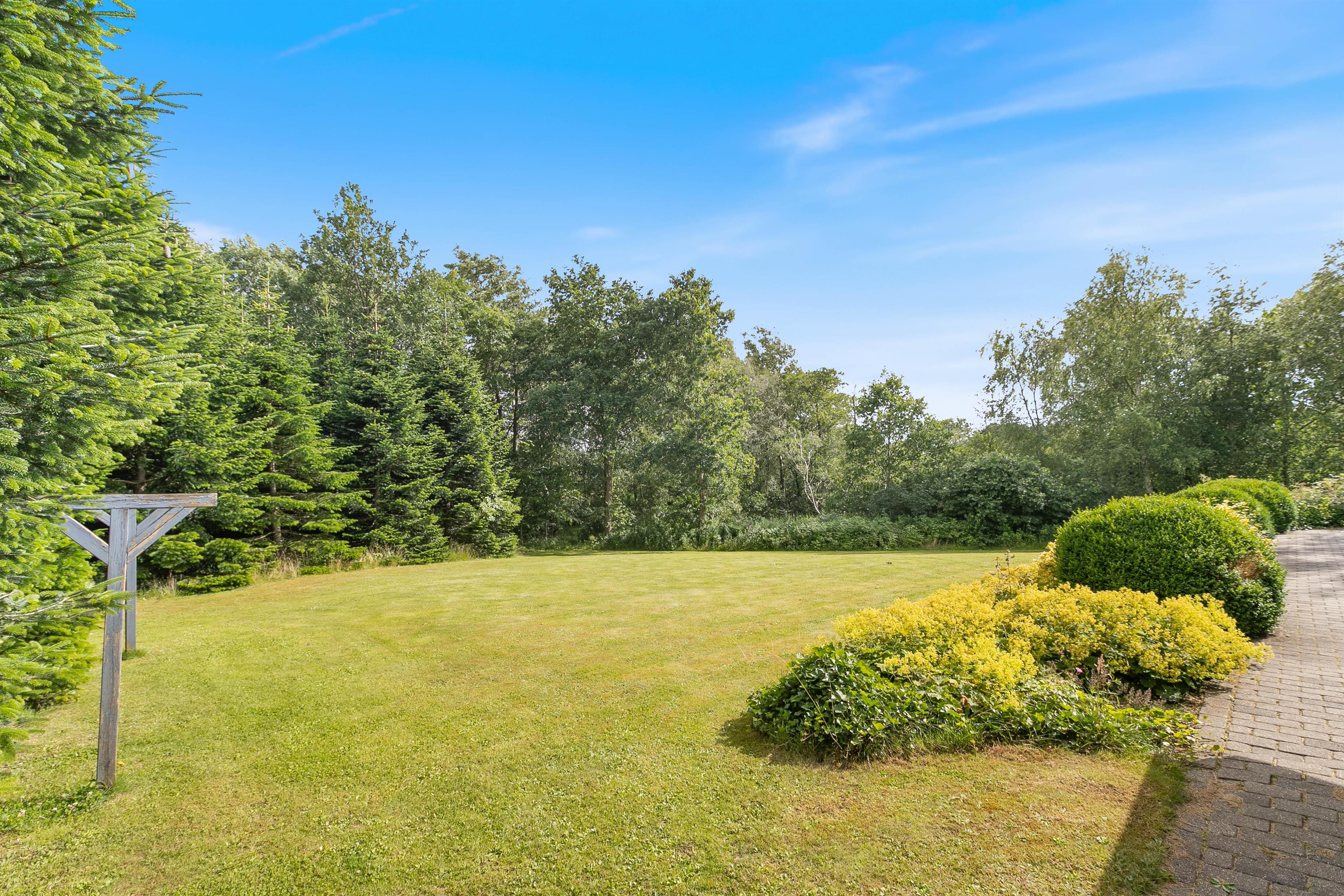 Feriehuset har en rolig beliggenhed på en stor naturgrund med en dejlig terrasse og have. Ejendommen grænser op til et naturbeskyttet område, hvor det ikke er ualmindeligt at se vilde dyr. De omkringliggende træer skærmer også godt af for nærmeste naboer og vinden, så her kan I virkelig nyde de dejlige sommerdage.