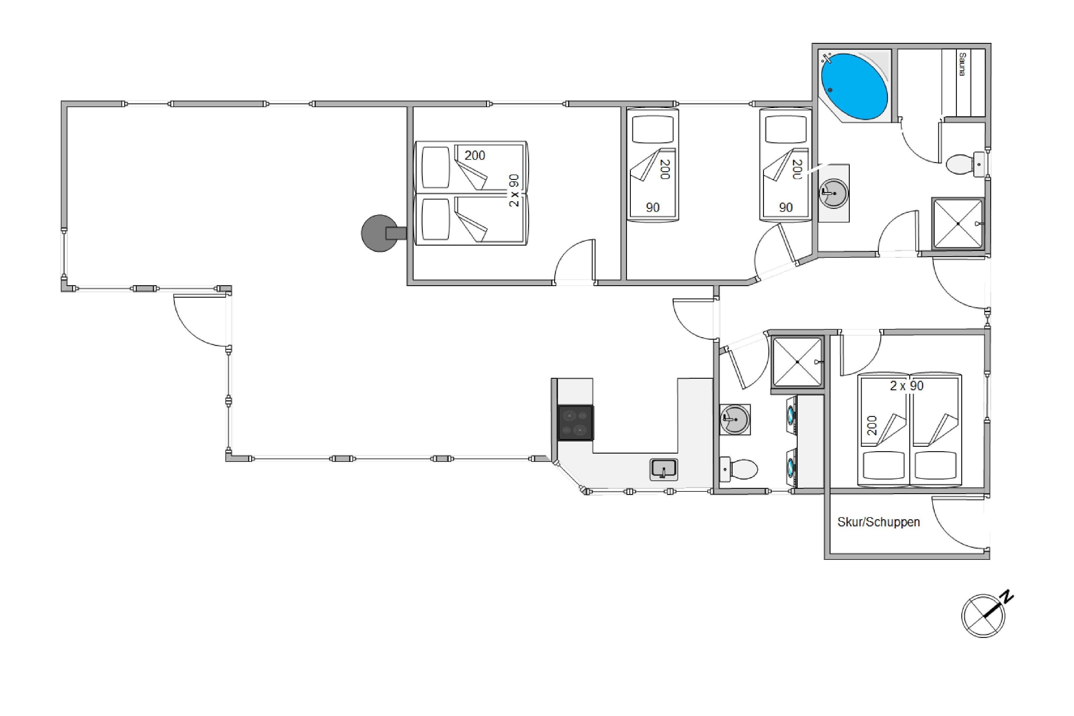 Der er 2 velholdte badeværelser, hvoraf det største har både boblebad og sauna til afslapning. Nyd lange saunagus eller en dukkert i det varme vand i boblebadet og slap af. Når det bliver sent, kan I dele jer op i 3 hyggelige soveværelser og lade batterierne op. Alle soveværelser har god opbevaringsplads og gulvtæpper.