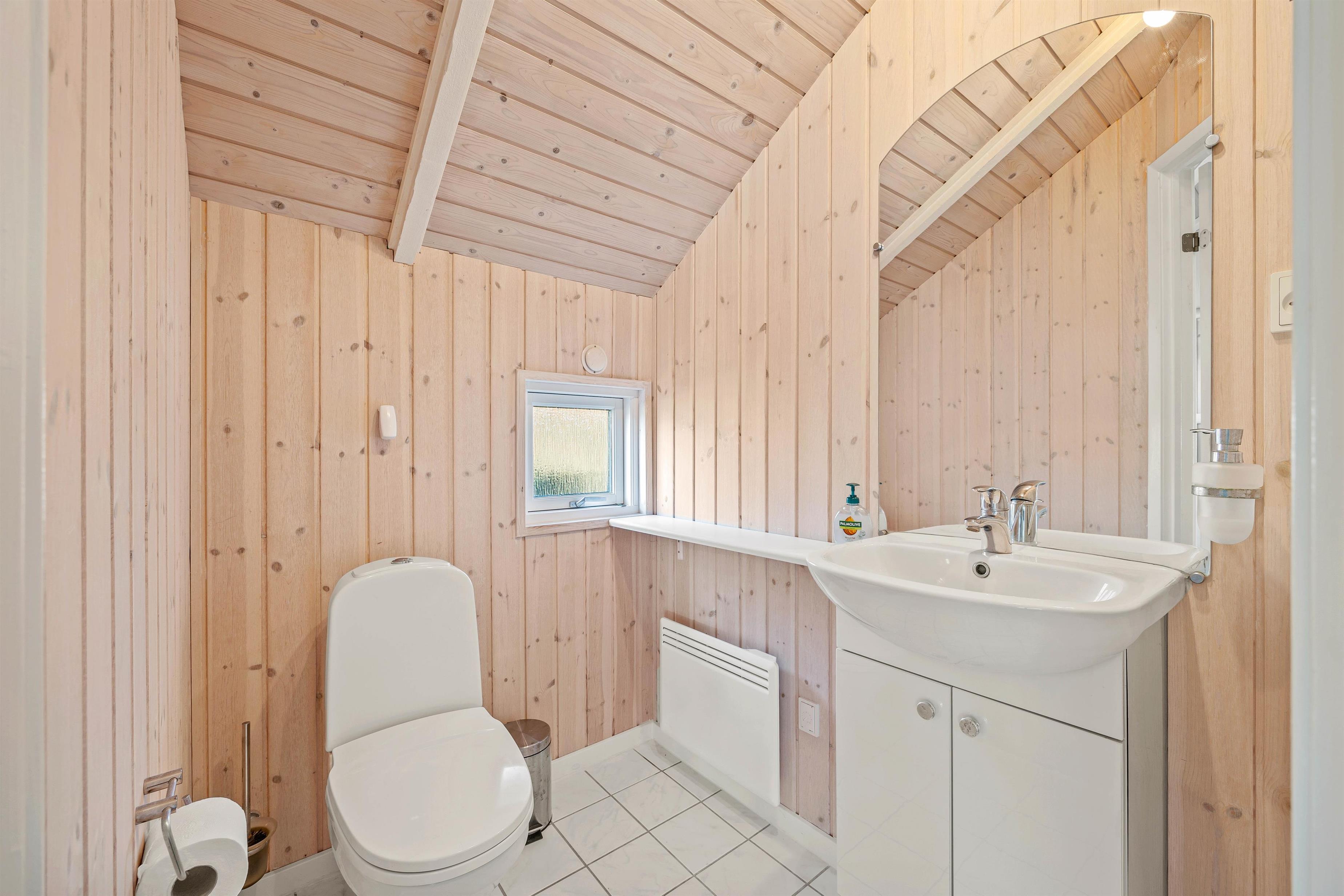 I sommerhuset er der et badeværelse samt et gæstetoilet, så der ikke opstår alt for lang kø om morgenen. Der er gulvvarme på både badeværelset og på gæstetoilettet. Desuden er der vaskemaskine og tørretumbler i feriehuset. På badeværelset er der spabad og sauna, hvor I rigtig kan slappe af og nyde roen.