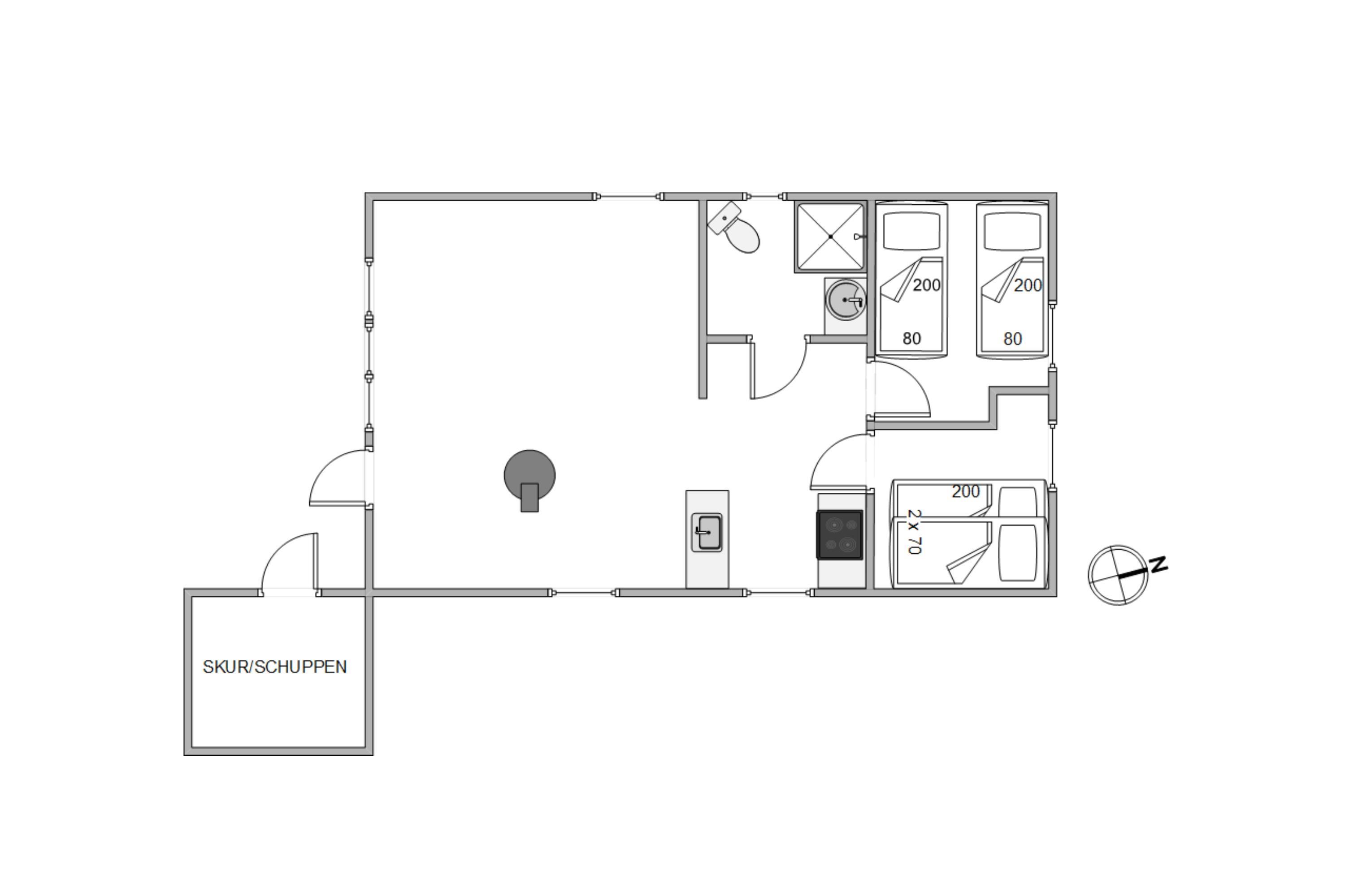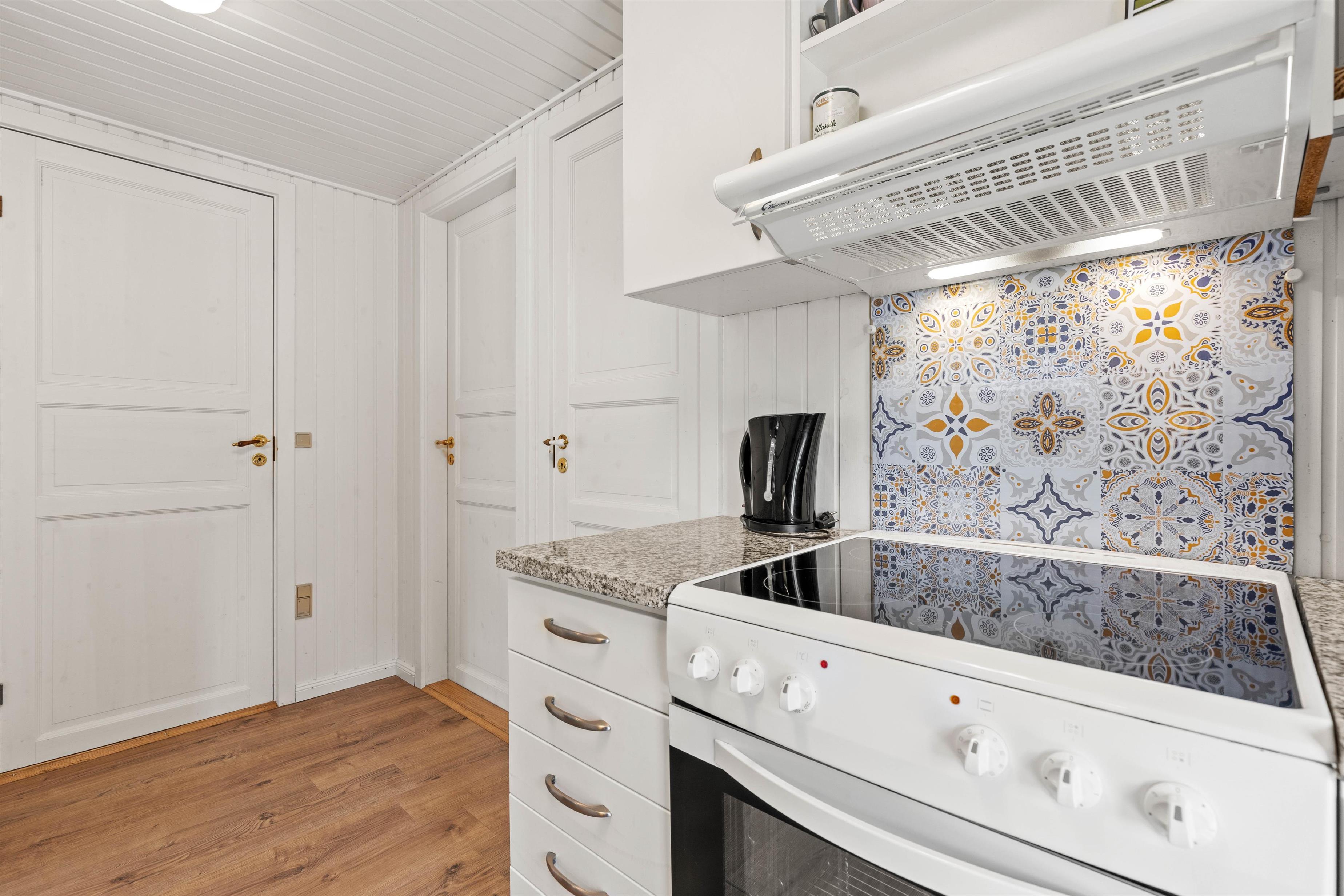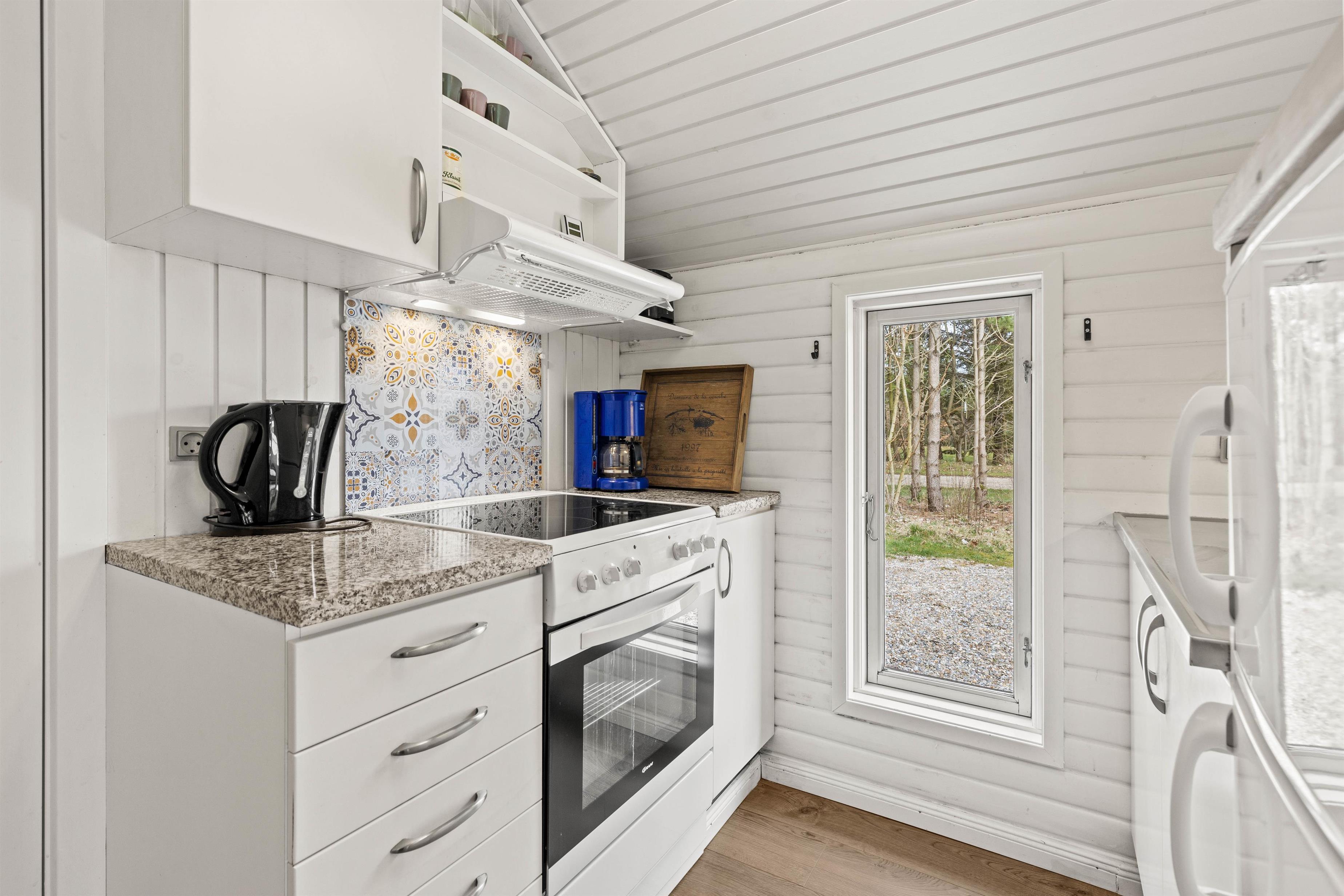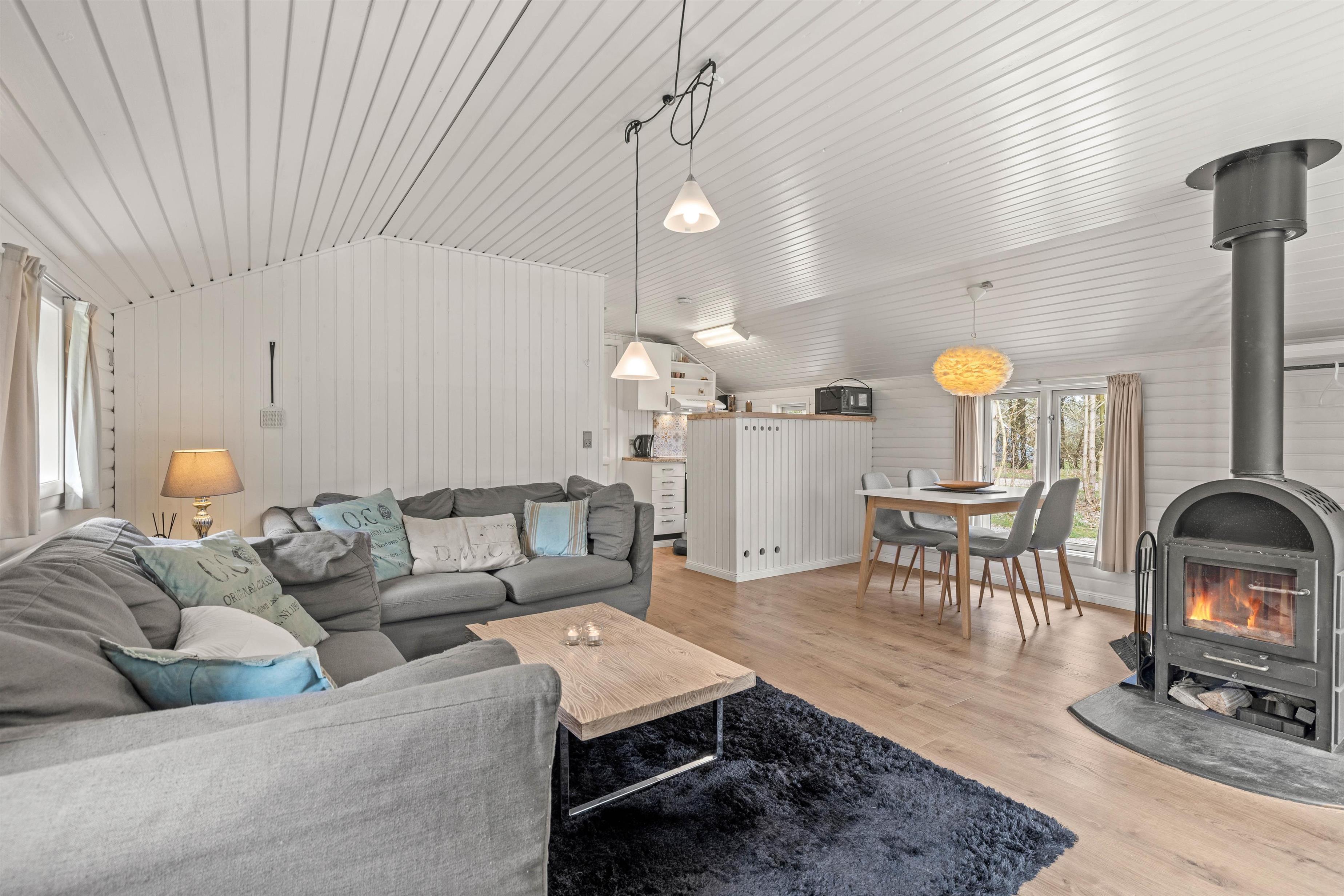 I sommerhusets hjerte ligger stuen, hvor en charmerende brændeovn skaber en varm og hyggelig atmosfære. Det er her, du kan samle familien til lange samtaler, eller bare nyde en stille stund med en kop te i hånden, mens ilden knitrer i baggrunden.
