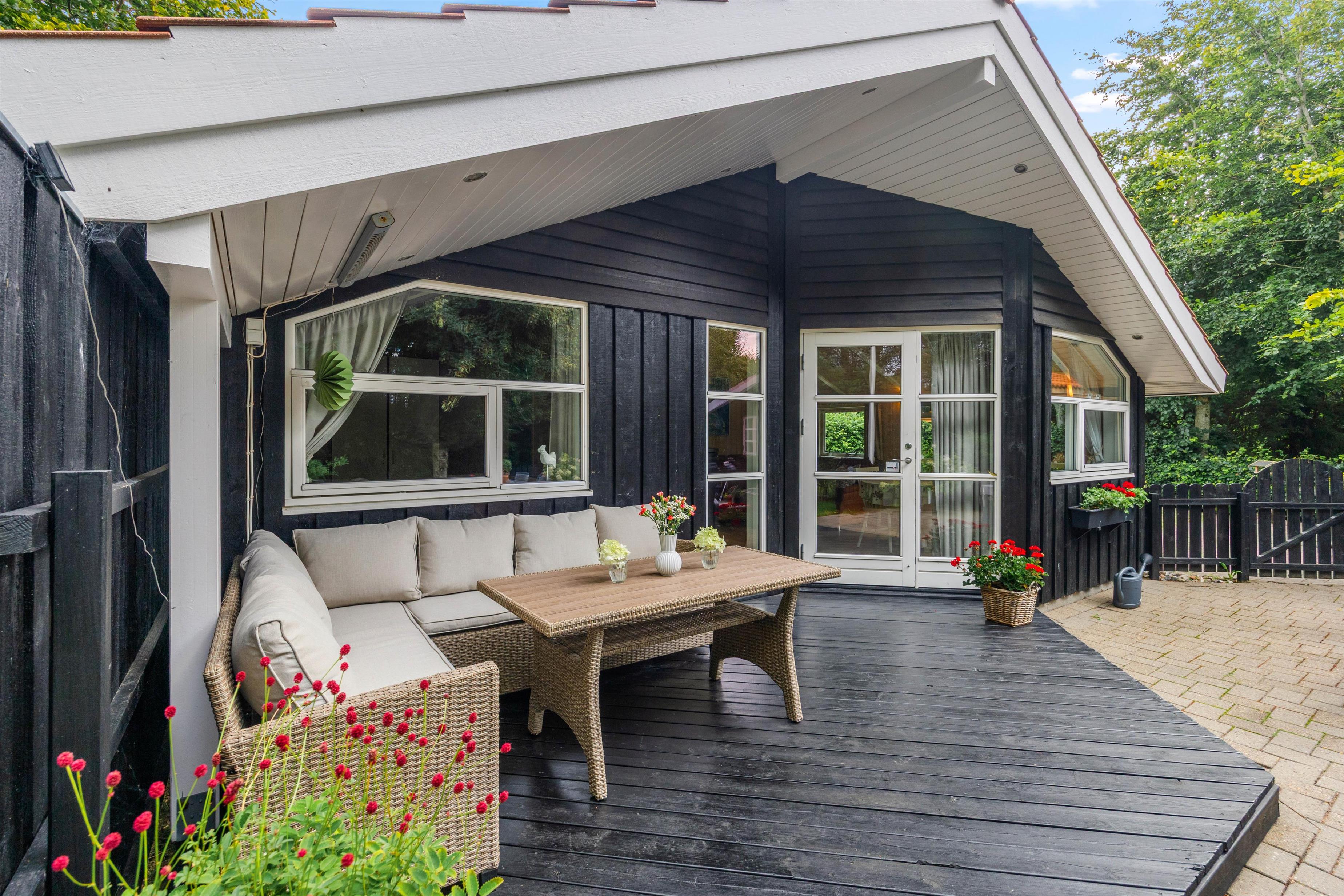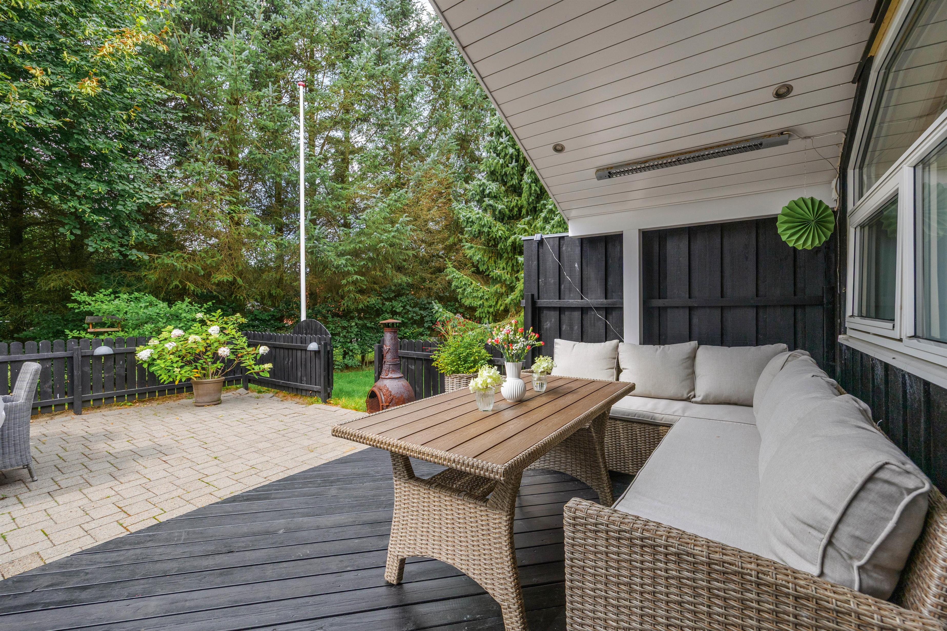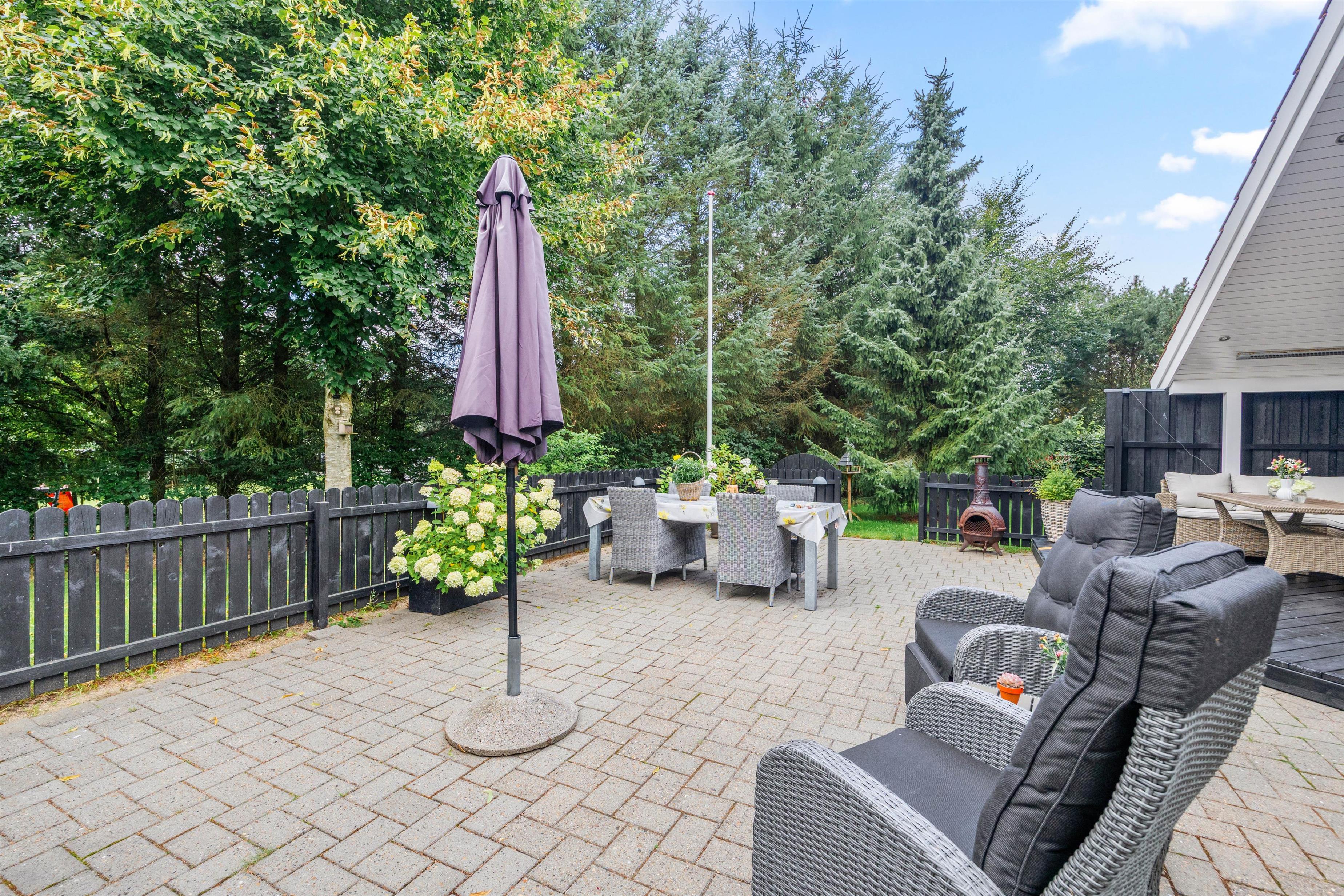 Fra stuen kan I gå direkte ud på den overdækkede og afskærmede del af terrassen, så I kan sidde ude, selv hvis det skulle dryppe lidt. Et trin ned derfra og I befinder jer under åben himmel. Den store flisebelagte terrasse er lukket af, så hunden ikke bare vandrer på eventyr på egen hånd. Havemøblerne, parasollen og grillen er alt, I behøver for at nyde en solrig dag udenfor.