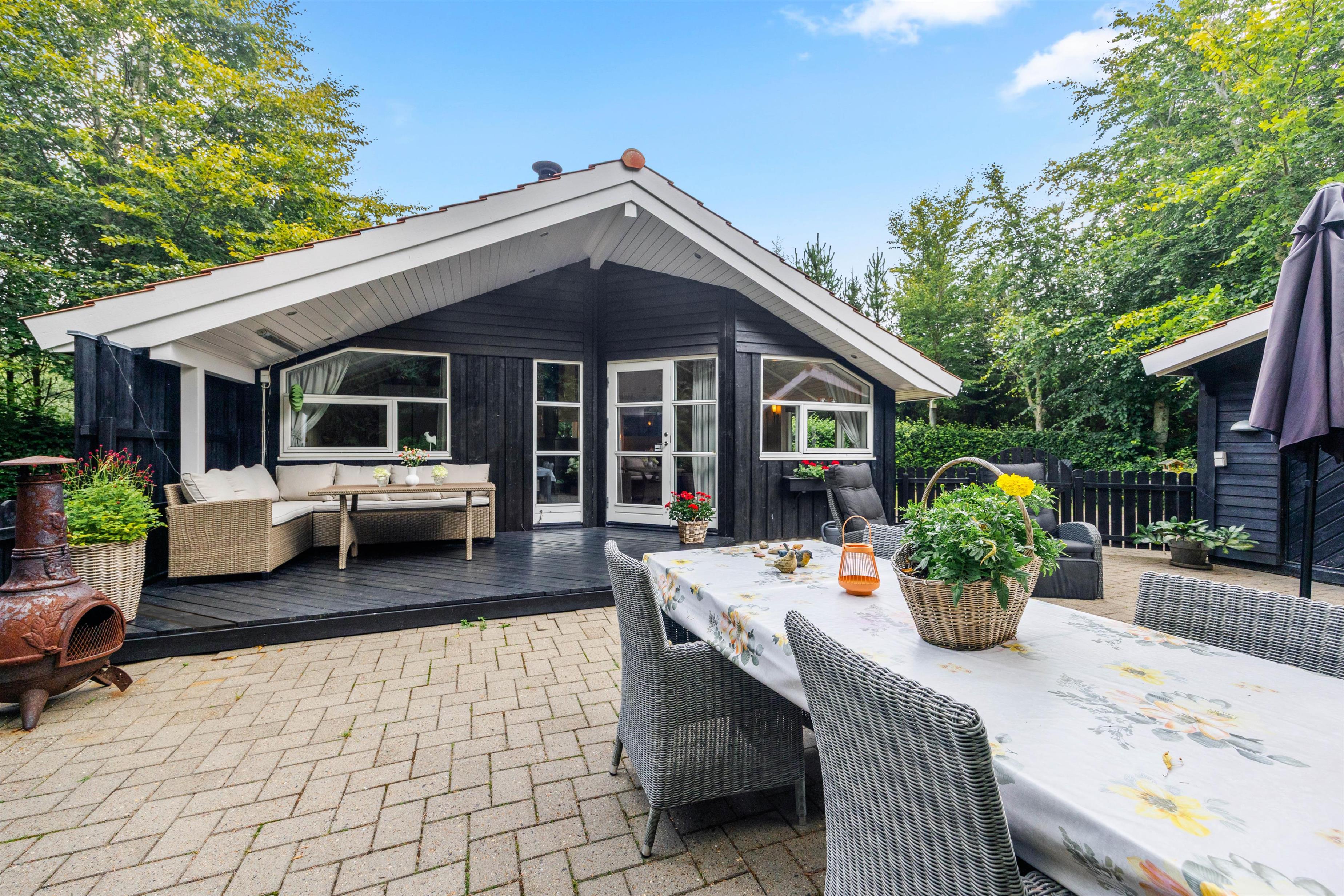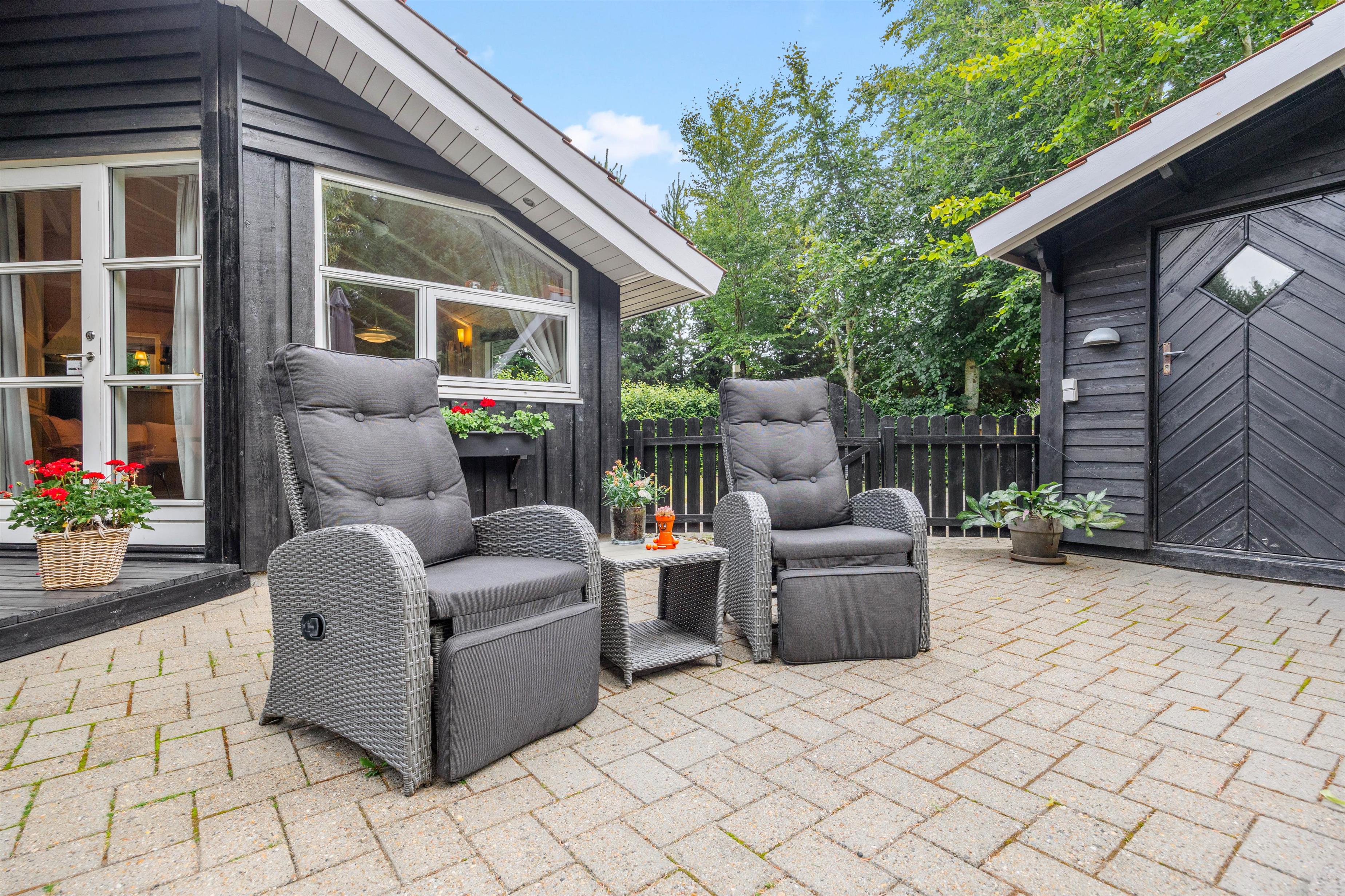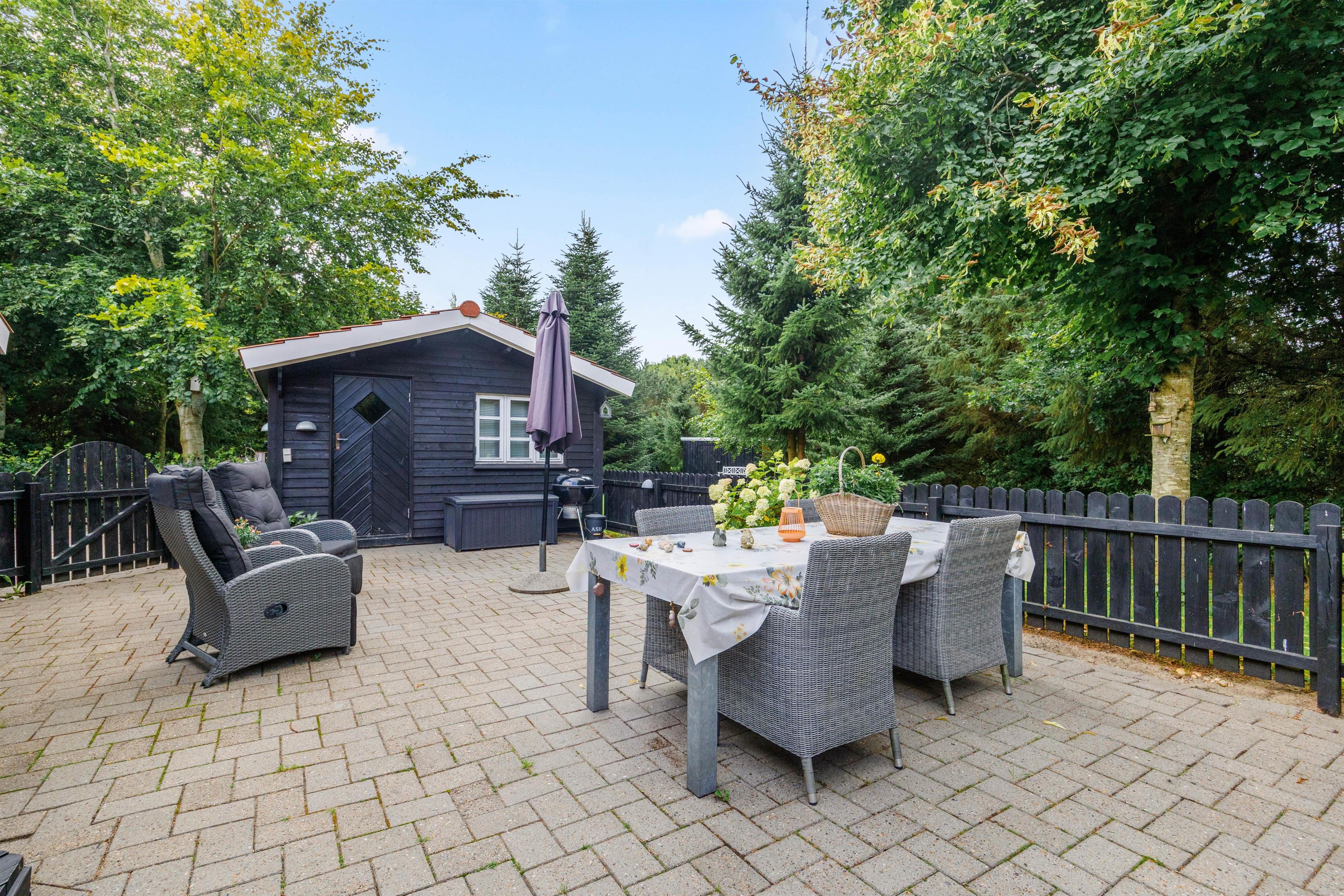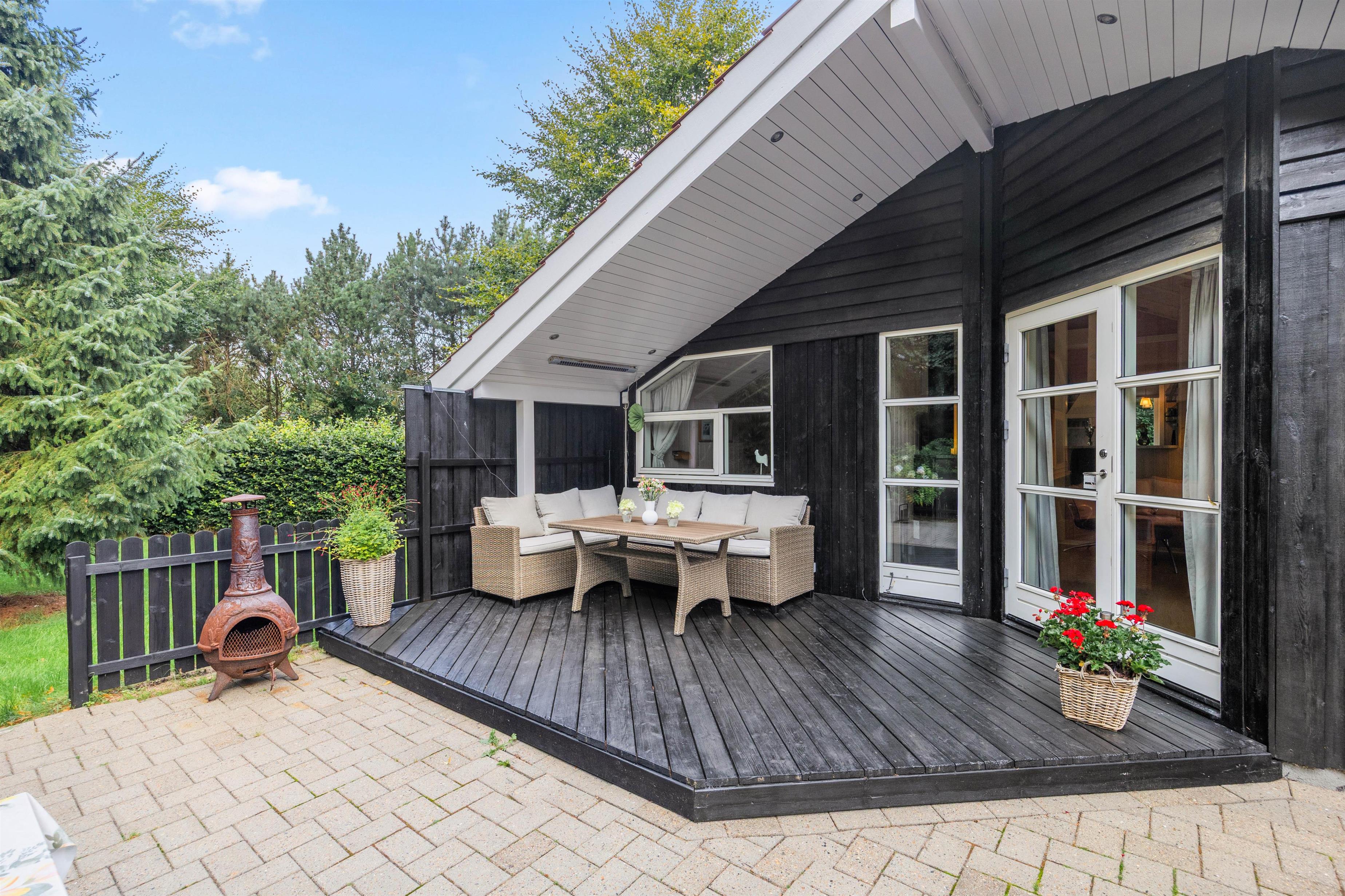 Fra stuen kan I gå direkte ud på den overdækkede og afskærmede del af terrassen, så I kan sidde ude, selv hvis det skulle dryppe lidt. Et trin ned derfra og I befinder jer under åben himmel. Den store flisebelagte terrasse er lukket af, så hunden ikke bare vandrer på eventyr på egen hånd. Havemøblerne, parasollen og grillen er alt, I behøver for at nyde en solrig dag udenfor.