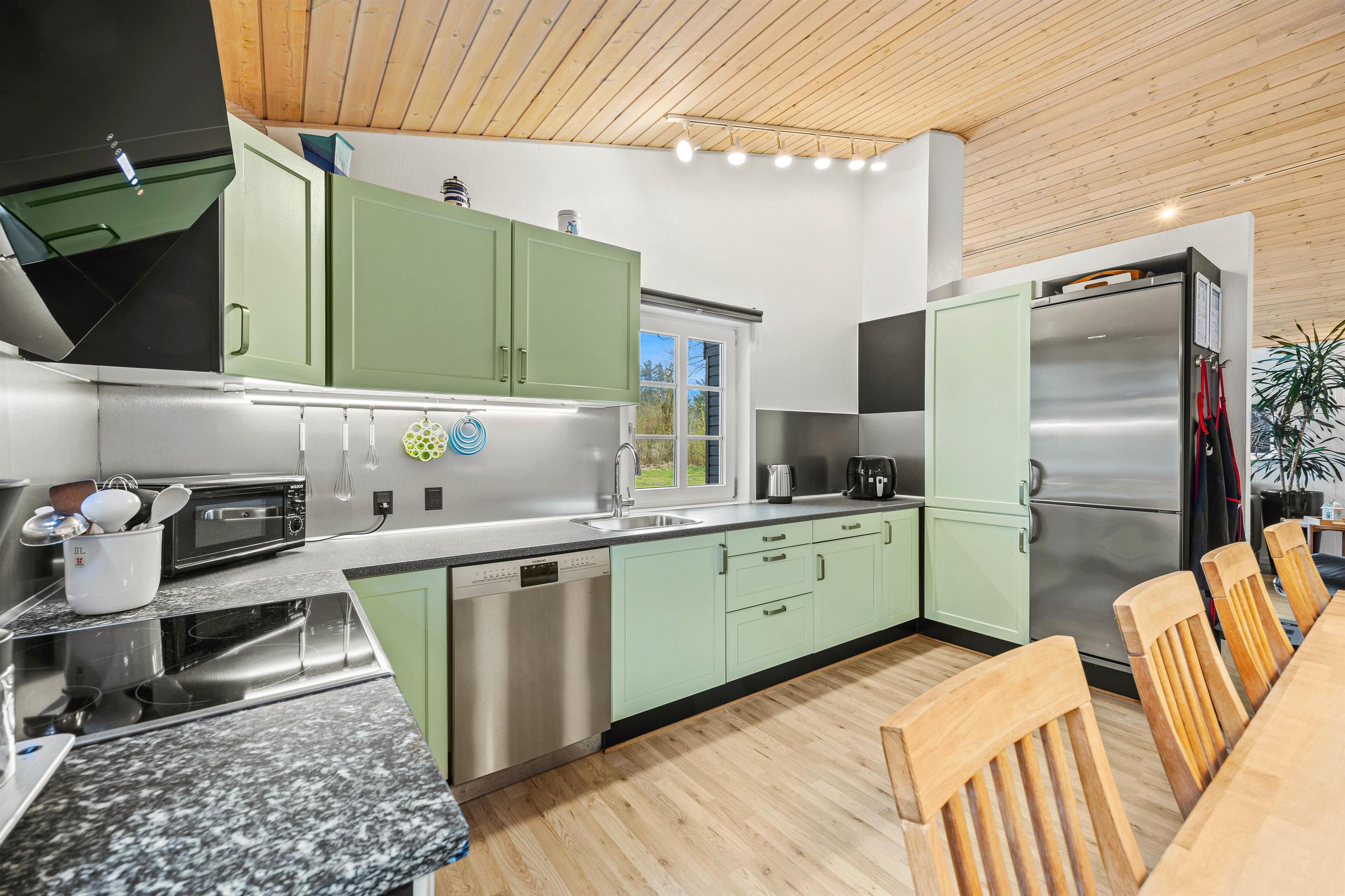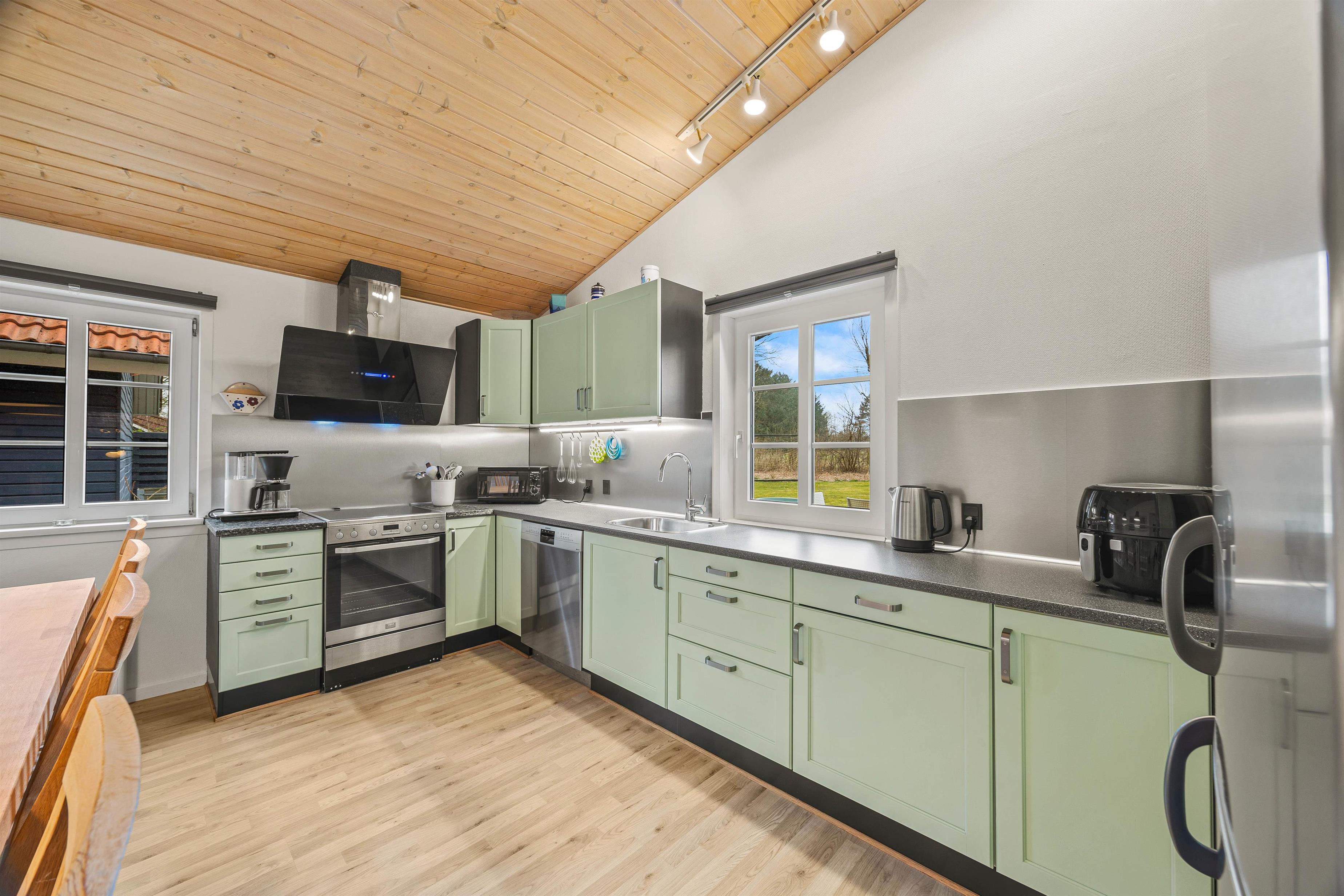 Indenfor finder I køkkenet udstyret med alle nødvendige faciliteter til at gøre jeres ophold så behageligt som muligt. Her finder I en airfryer til nye kulunariske oplevelser og en praktisk opvaskemaskine, der gør oprydningen efter måltiderne legende let. I samme rum finder I et rummeligt spiseområde, hvor hele familien eller vennegruppen kan samle sig til hyggelige måltider.