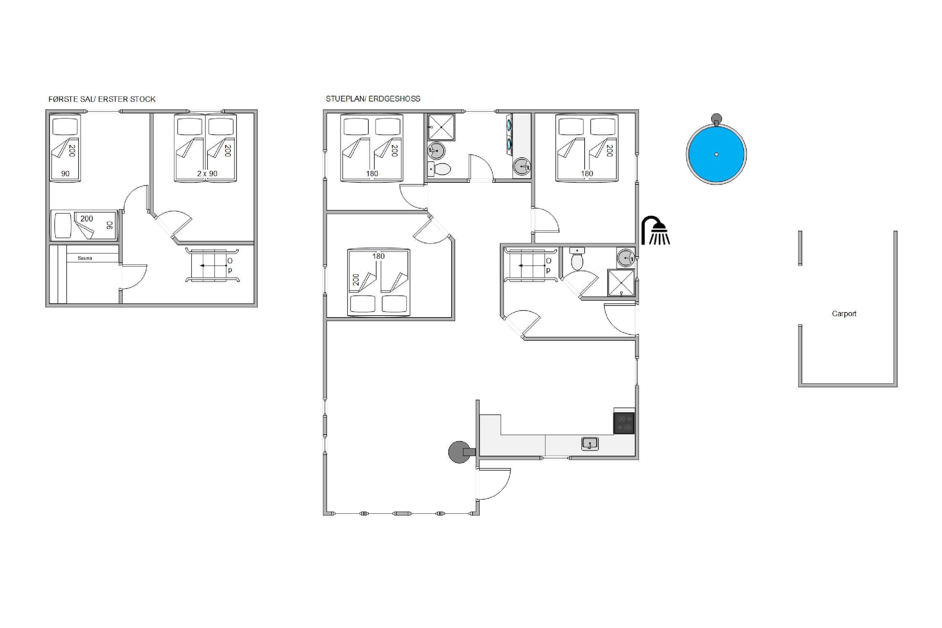 Til ultimativ afslapning og velvære tilbyder sommerhuset også et udendørs vildmarksbad, hvor I kan sidde og nyde den friske luft under stjernehimlen. Der er også en udebruser til dem, der ønsker en forfriskende skylning efter en dag ved stranden. Udebruser kan benyttes fra april til november.